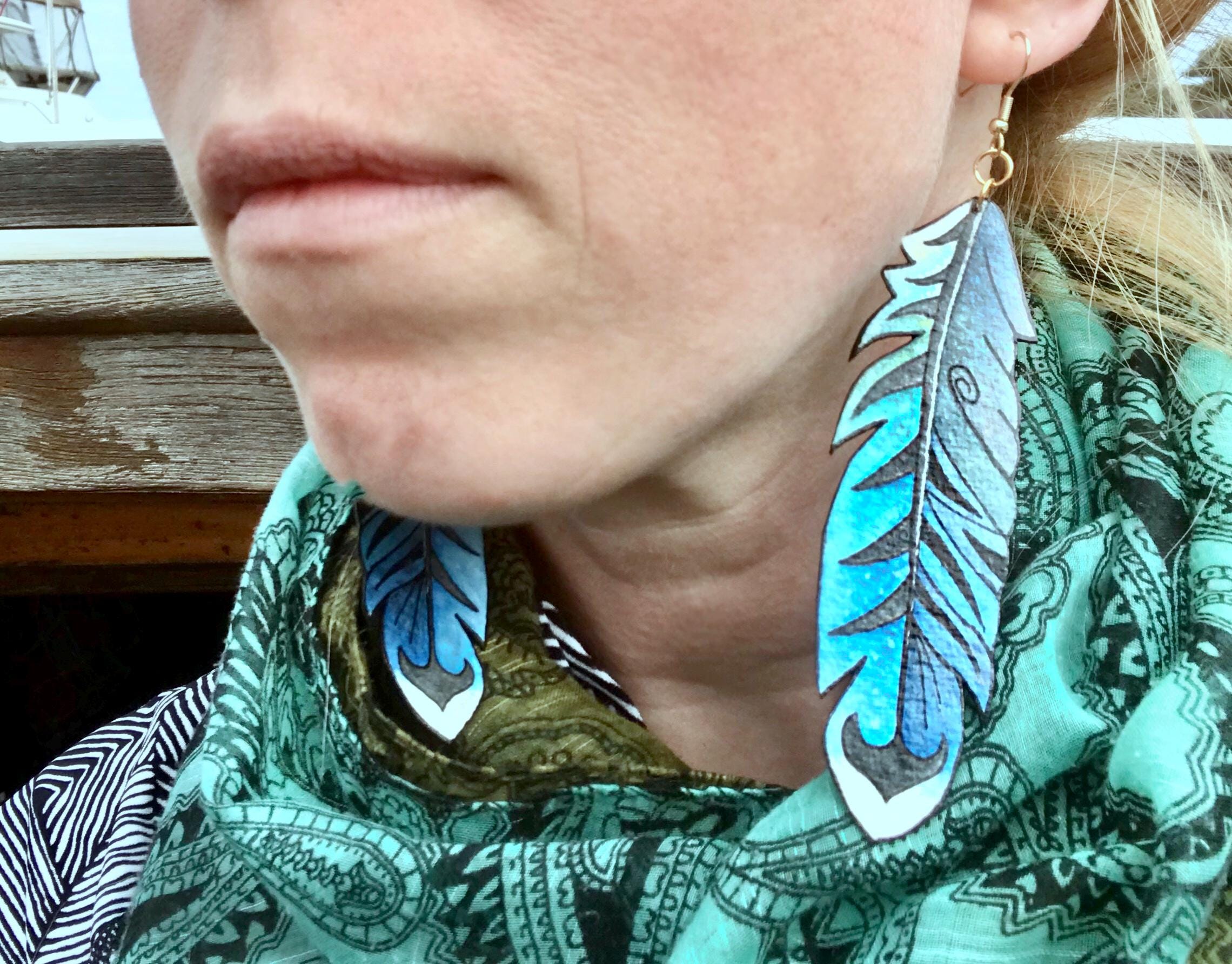 Extra-Large Blue Boho Feather Earrings