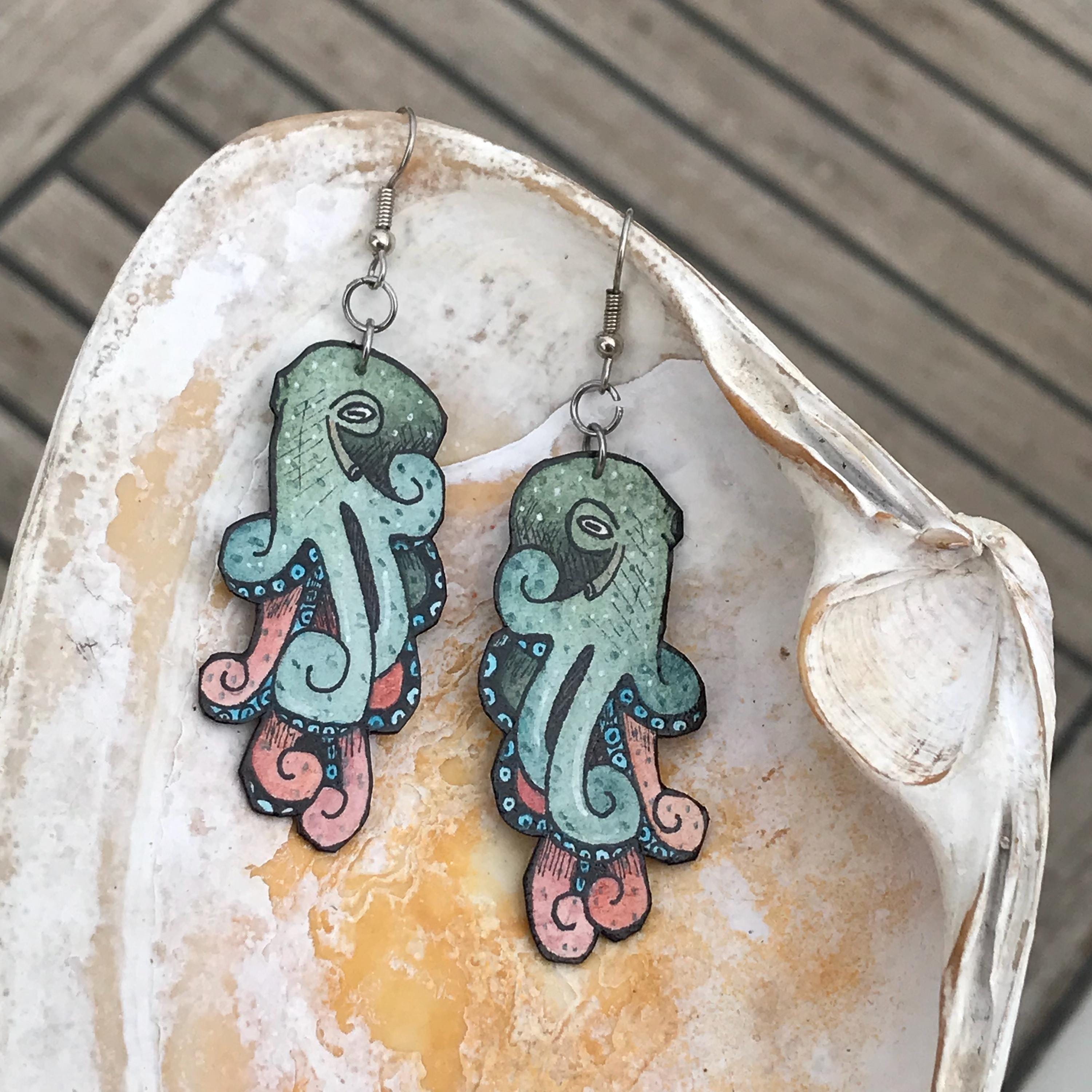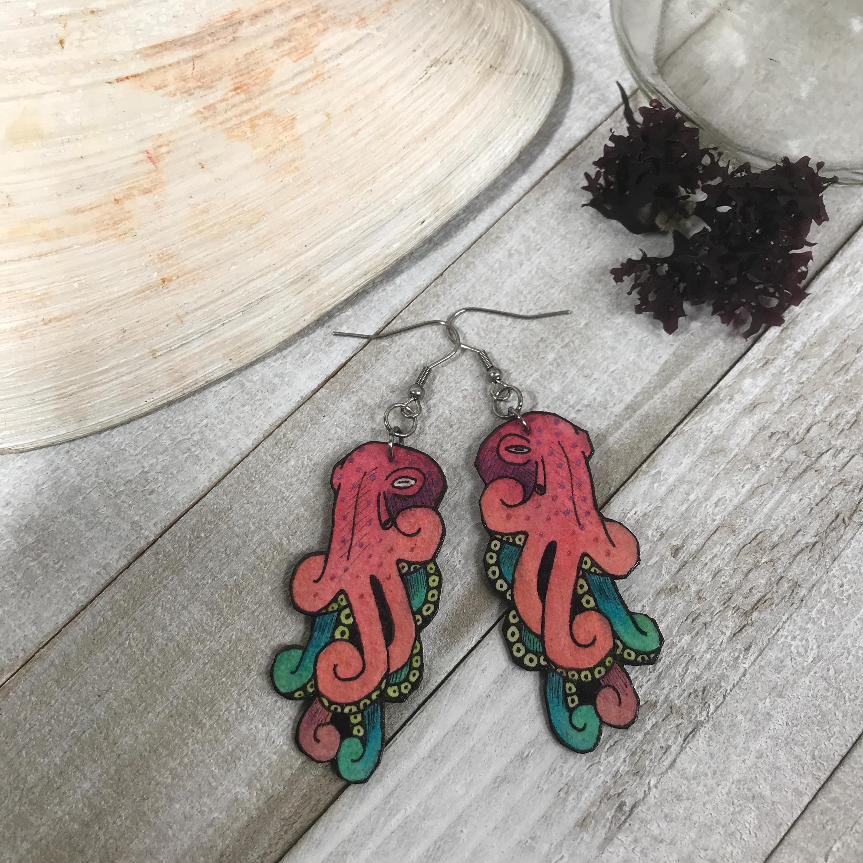 Salmon & Teal Octopus Earrings