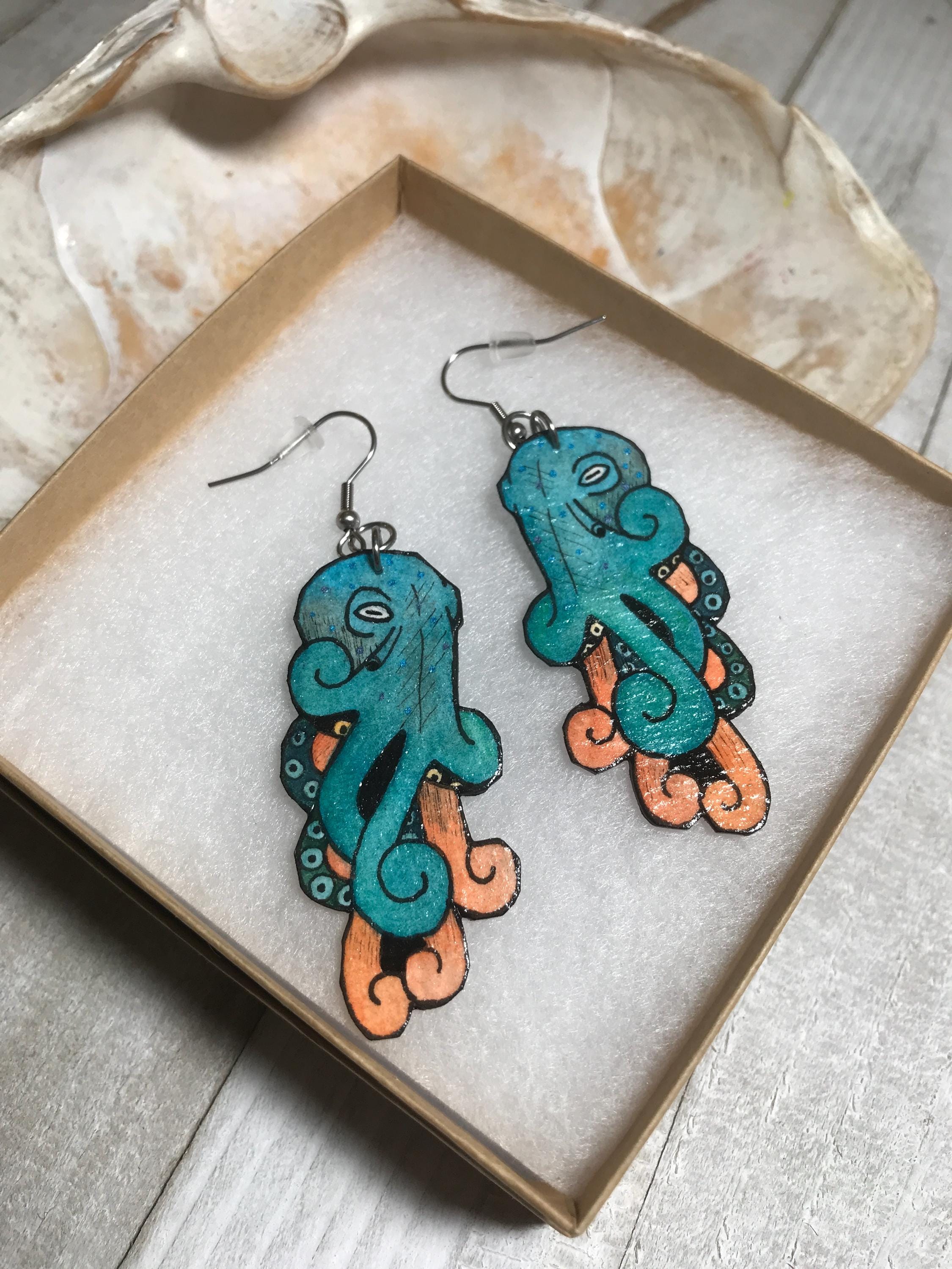 Teal & Orange Octopus Earrings