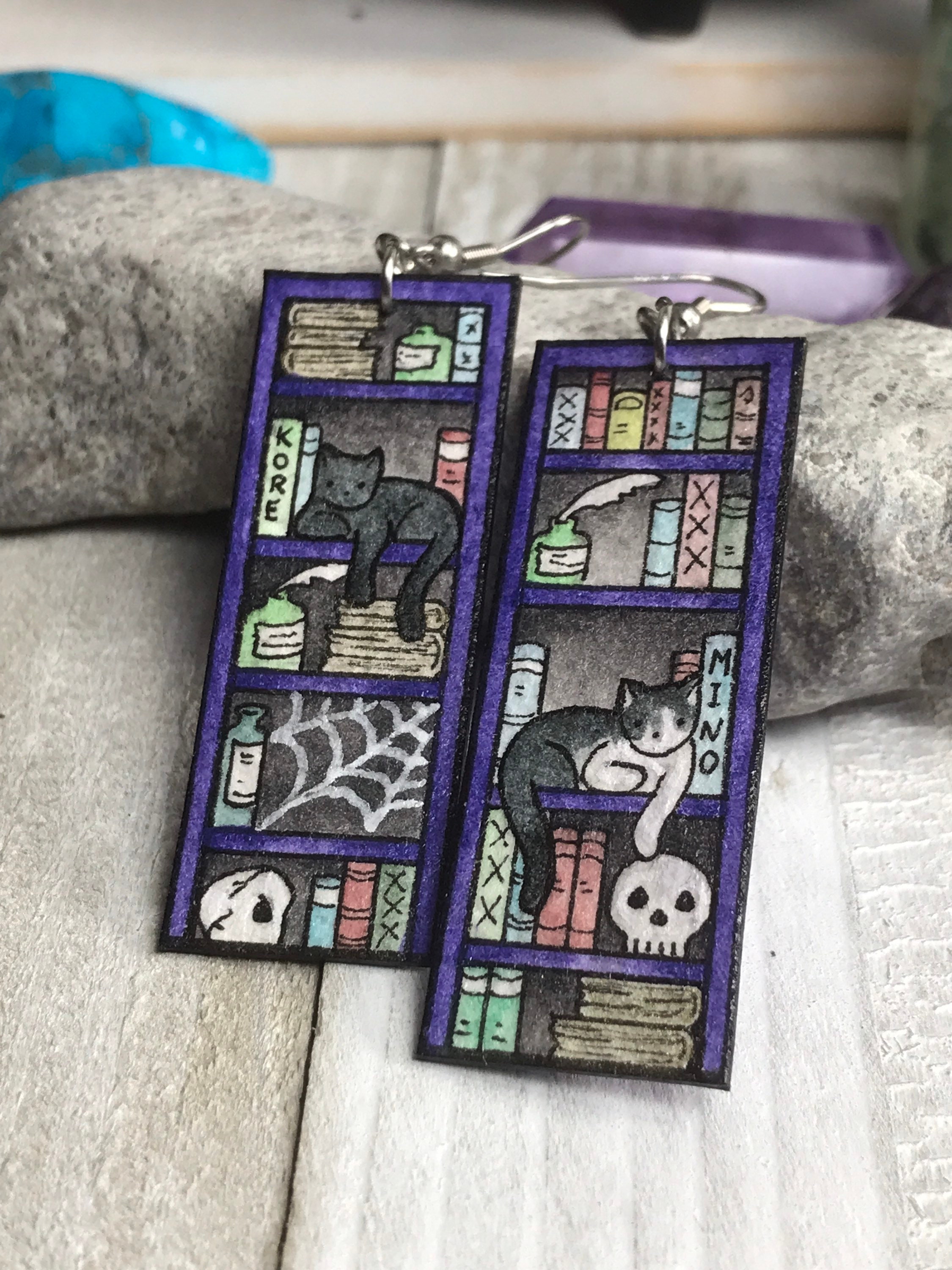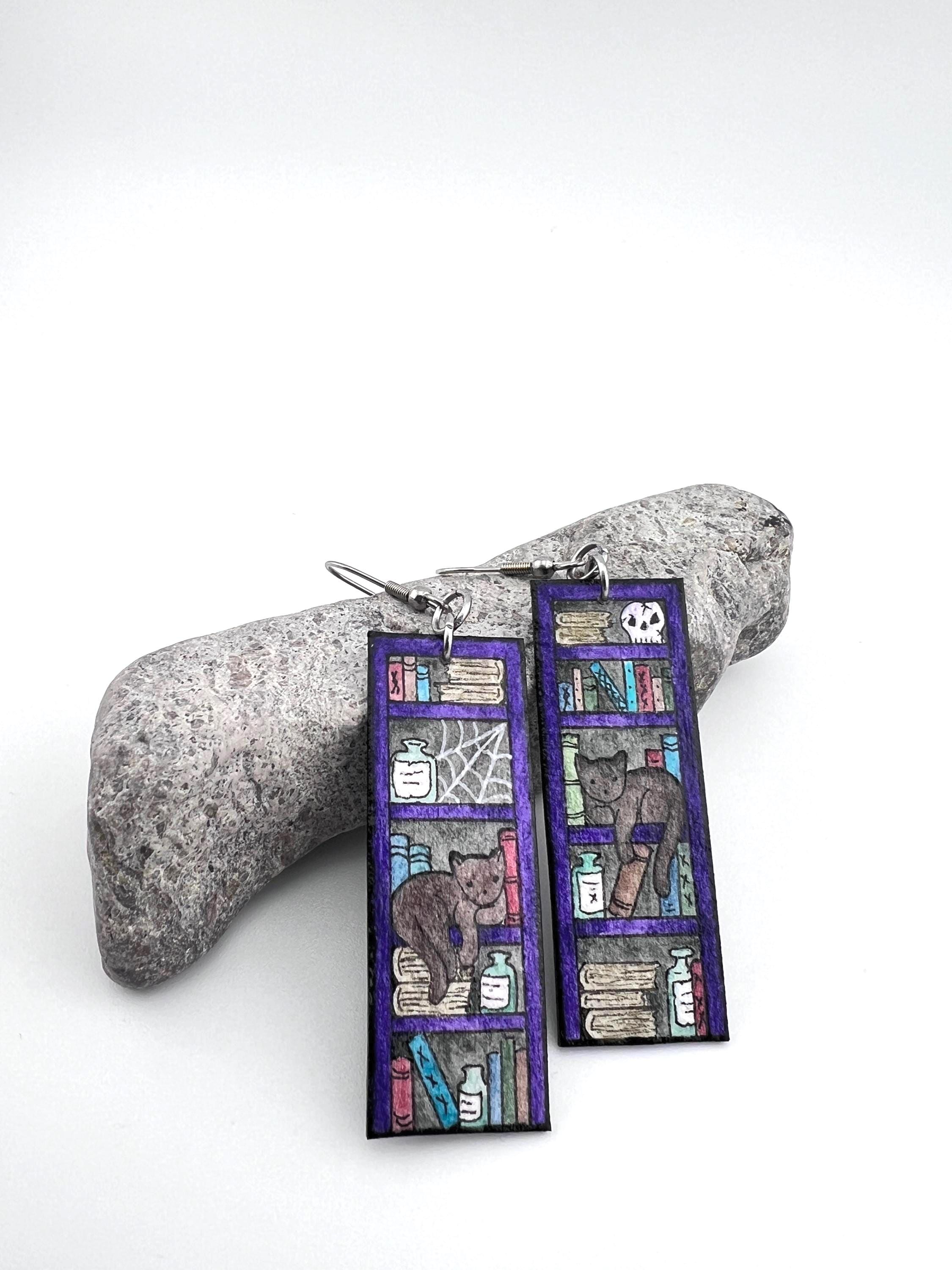 Personalized Gothic Cat on Bookshelf Earrings: Hand-Painted Wearable Art