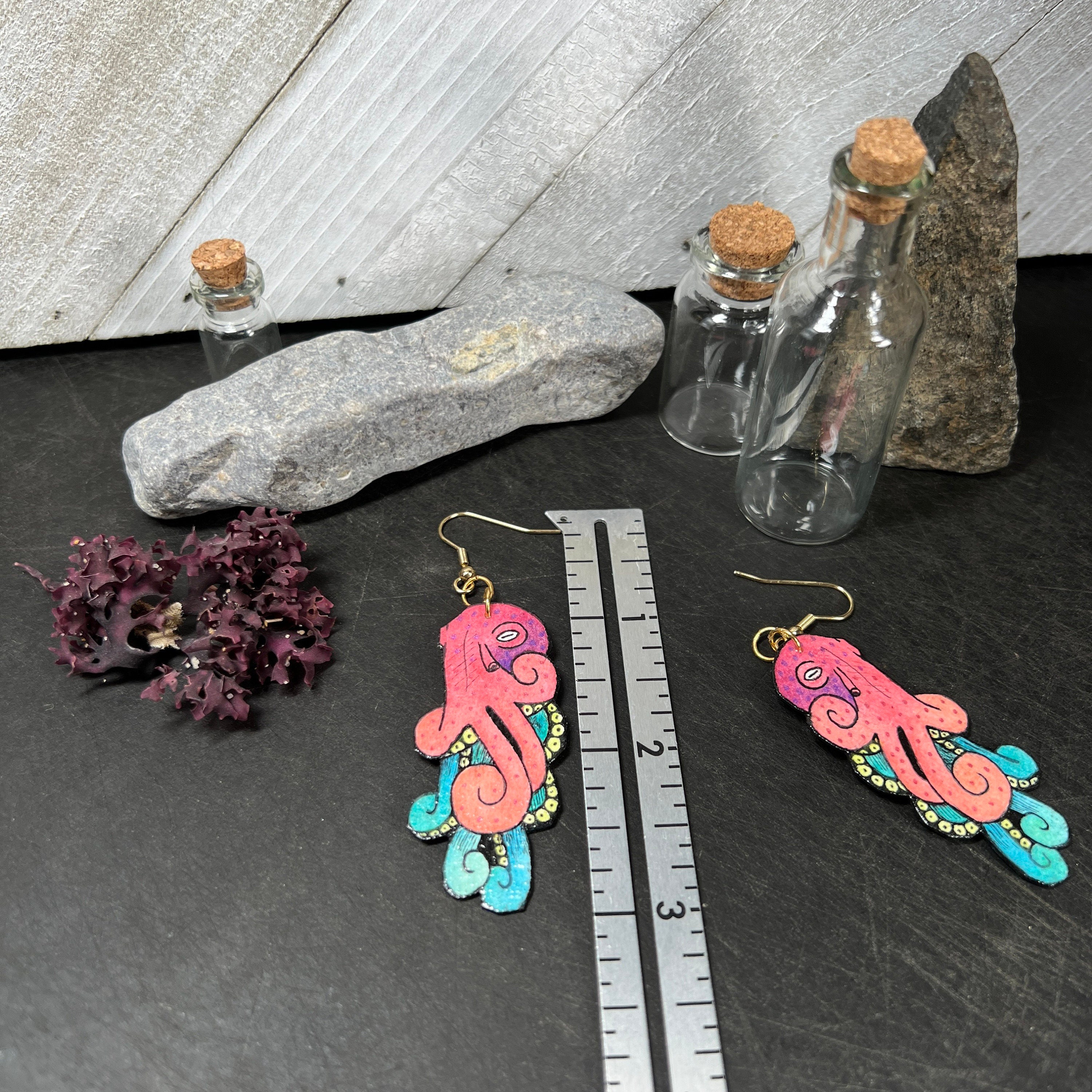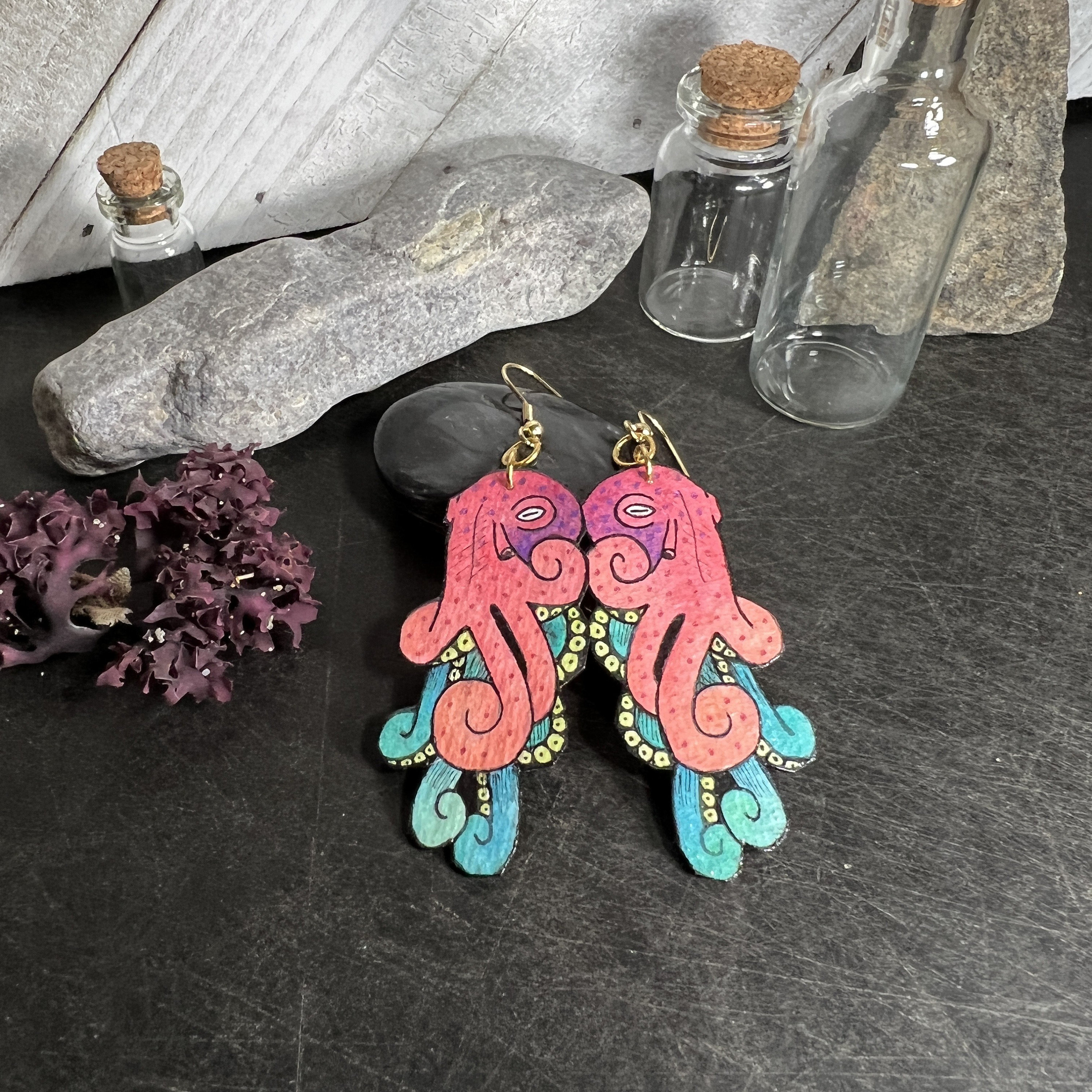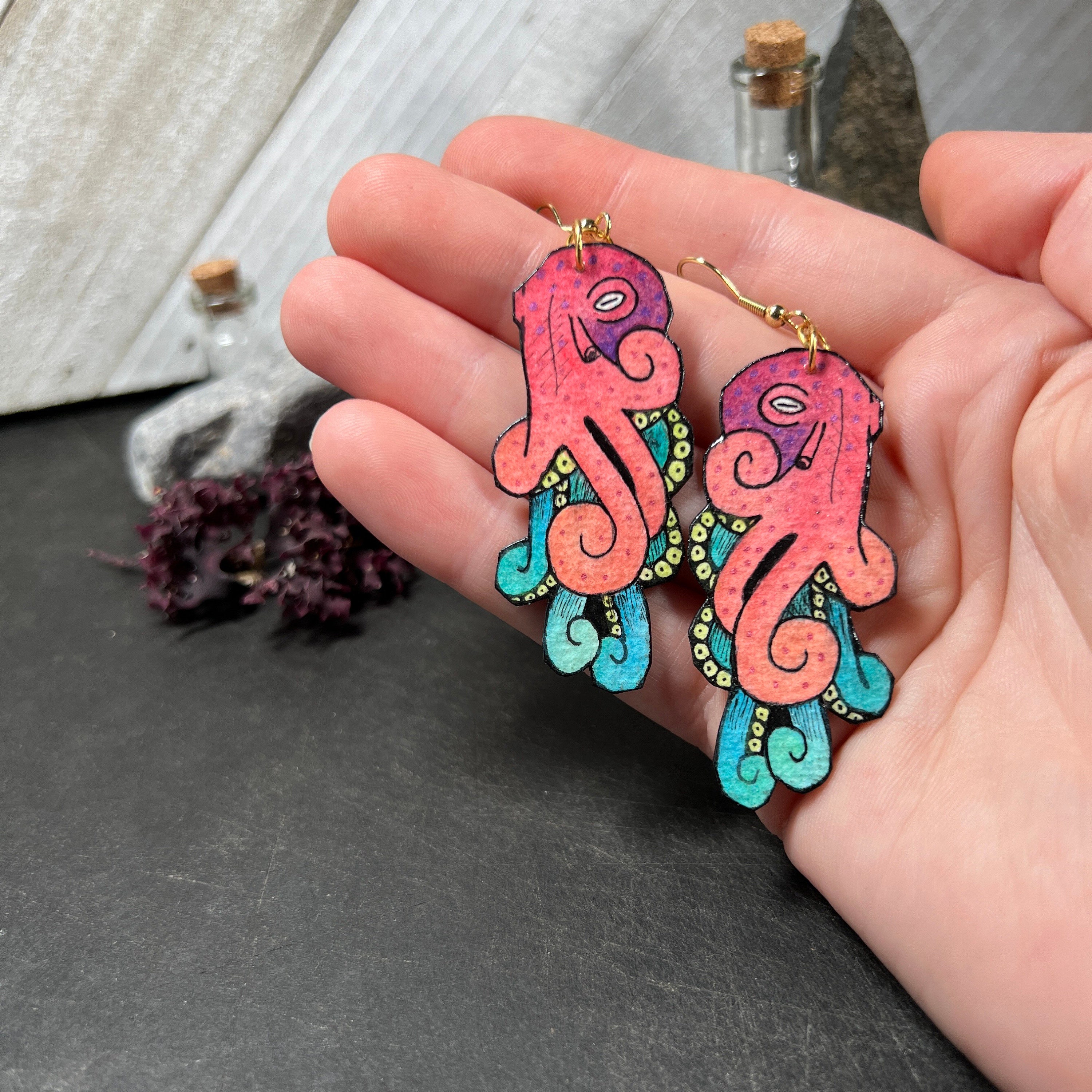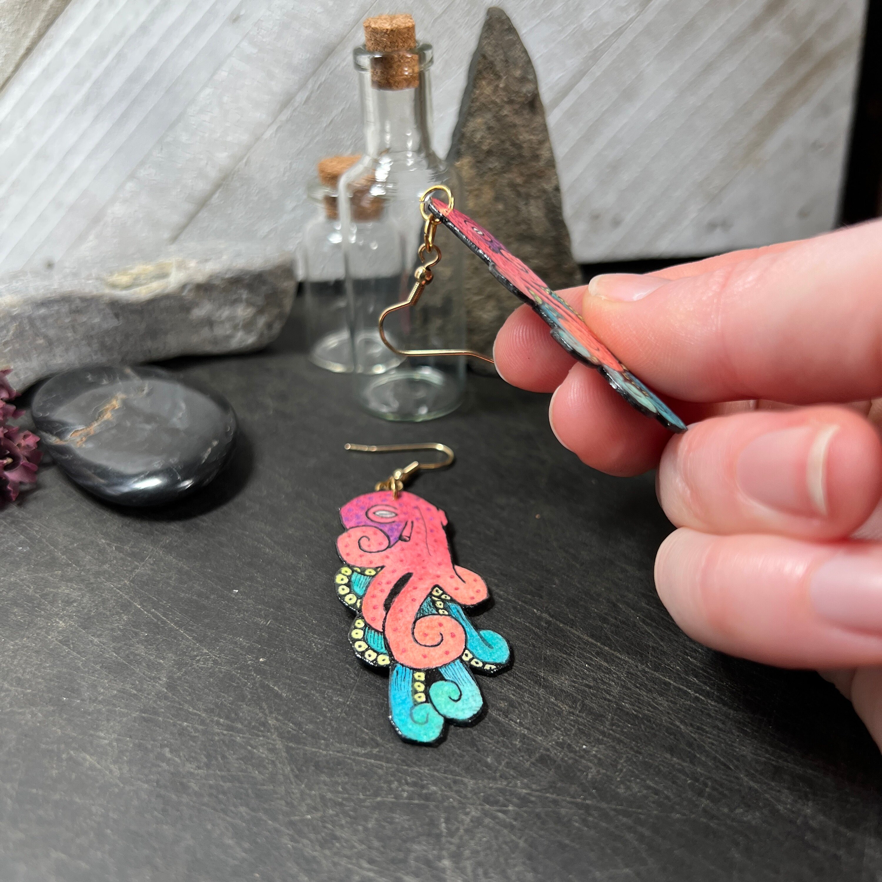Pink Octopus Earrings, Wearable Fine Art Painting, Lightweight