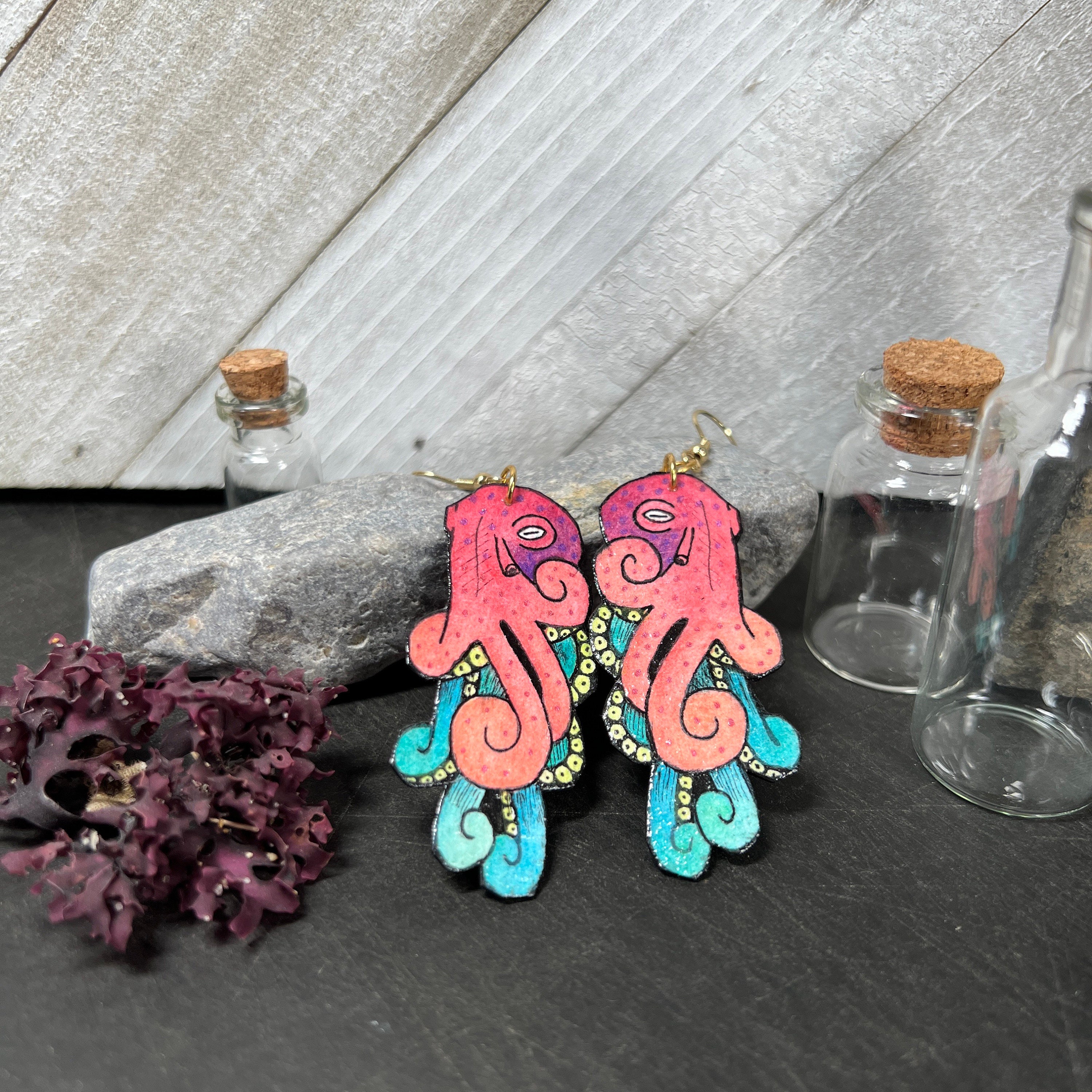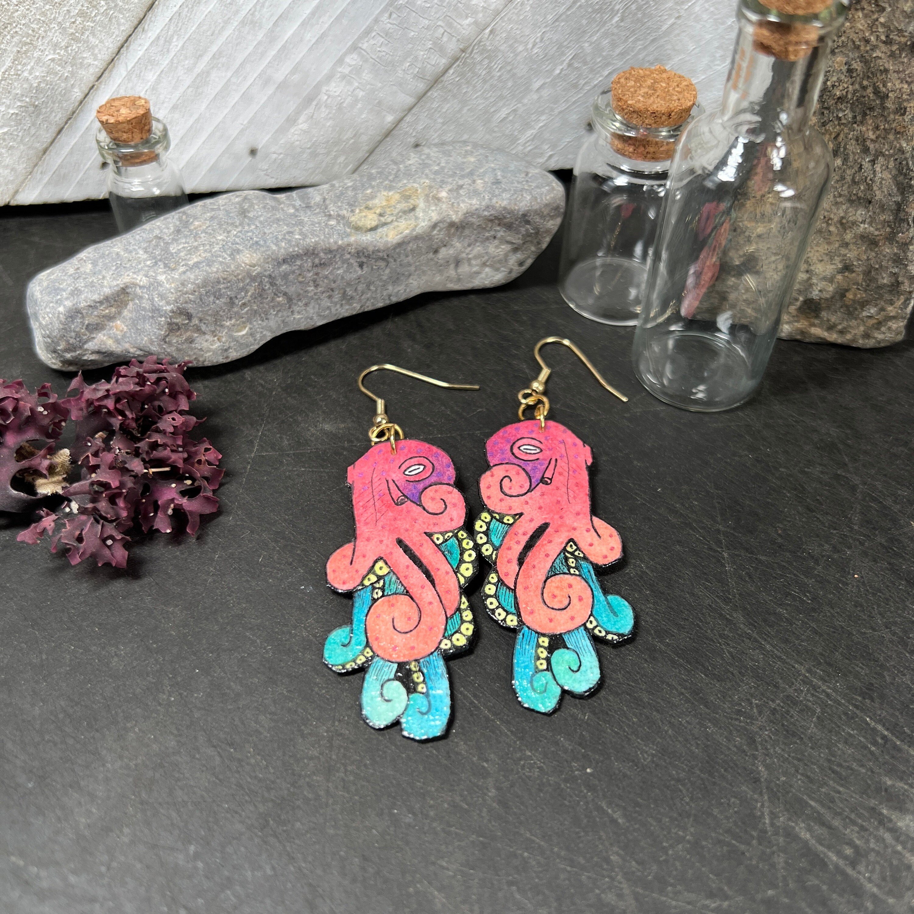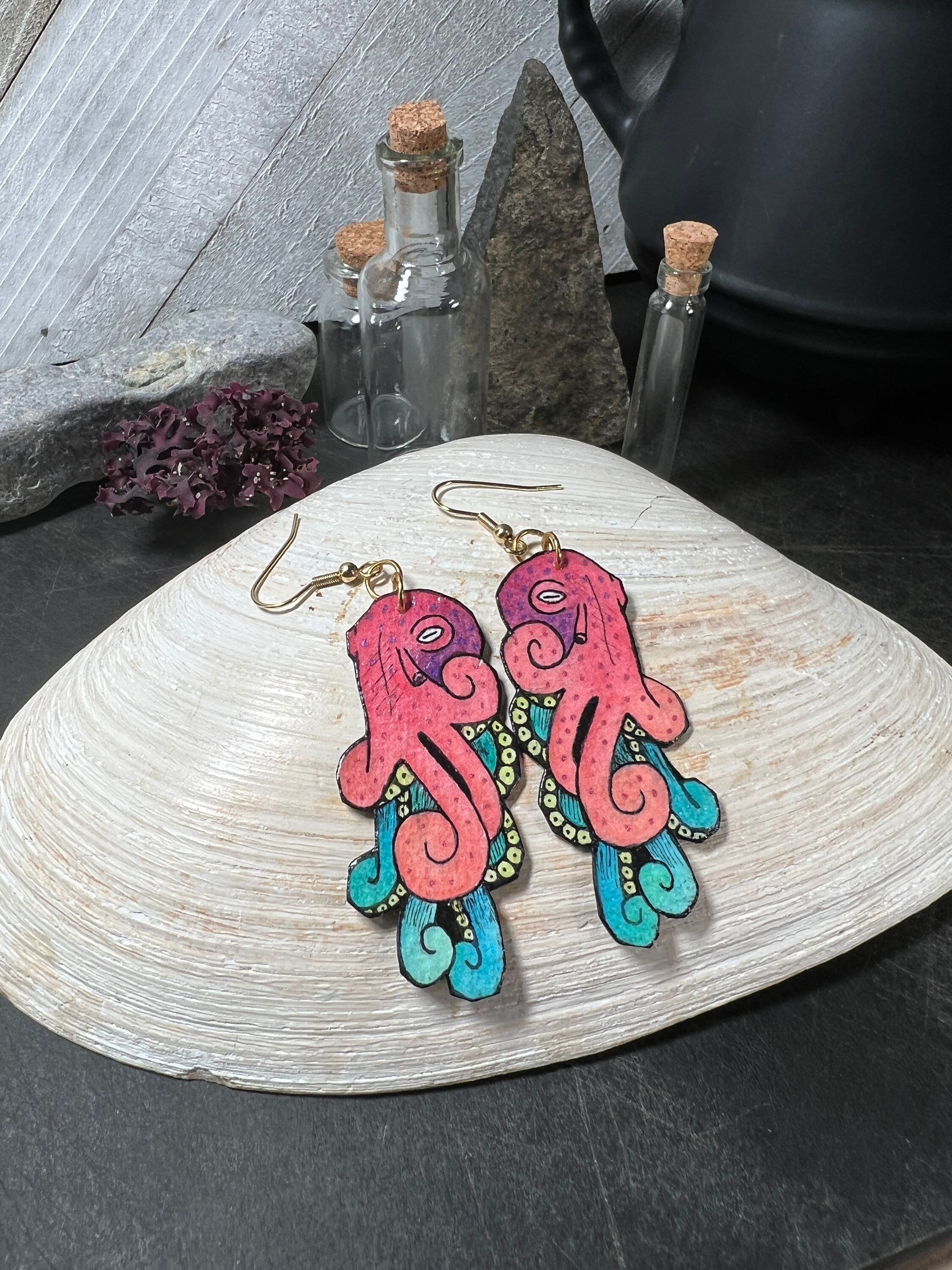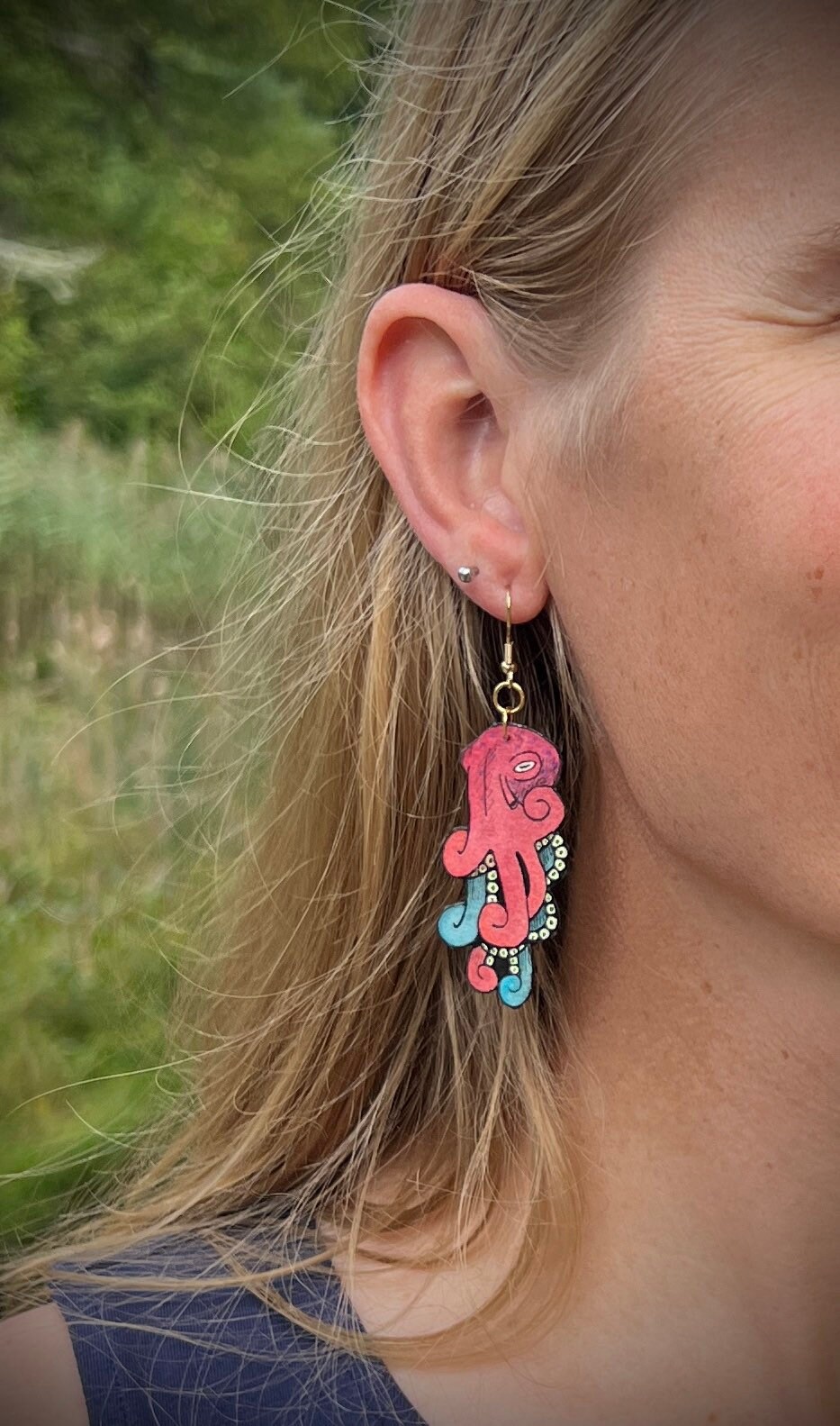 Pink Octopus Earrings, Wearable Fine Art Painting, Lightweight