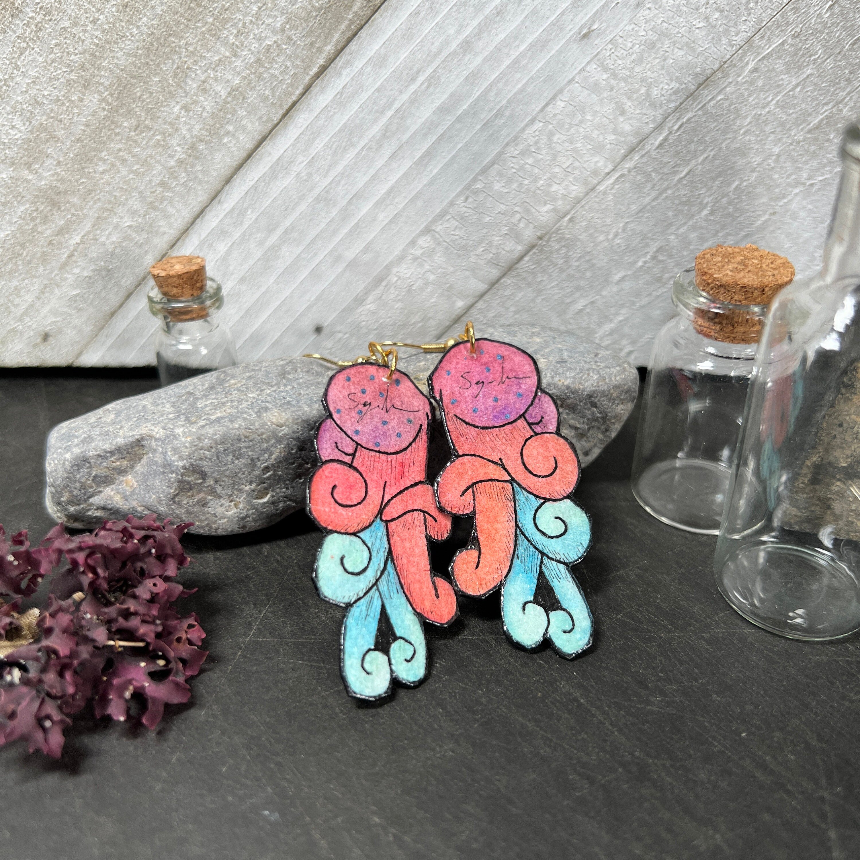These Large Pink/Teal Octopus Earrings are original Ink & Watercolor paintings hand painted on 1mm thick Italian Pressed Cotton Watercolor Paper. I paint the front and the back in full detail using Archival Pigma Ink and Inktense Watercolors. After painting, I coat them in two layers of protective lacquer, making them UV-Resistant and Water Resistant. Once complete, they have almost no weight. All hardware is hypoallergenic Gold-Finished Stainless Steel.