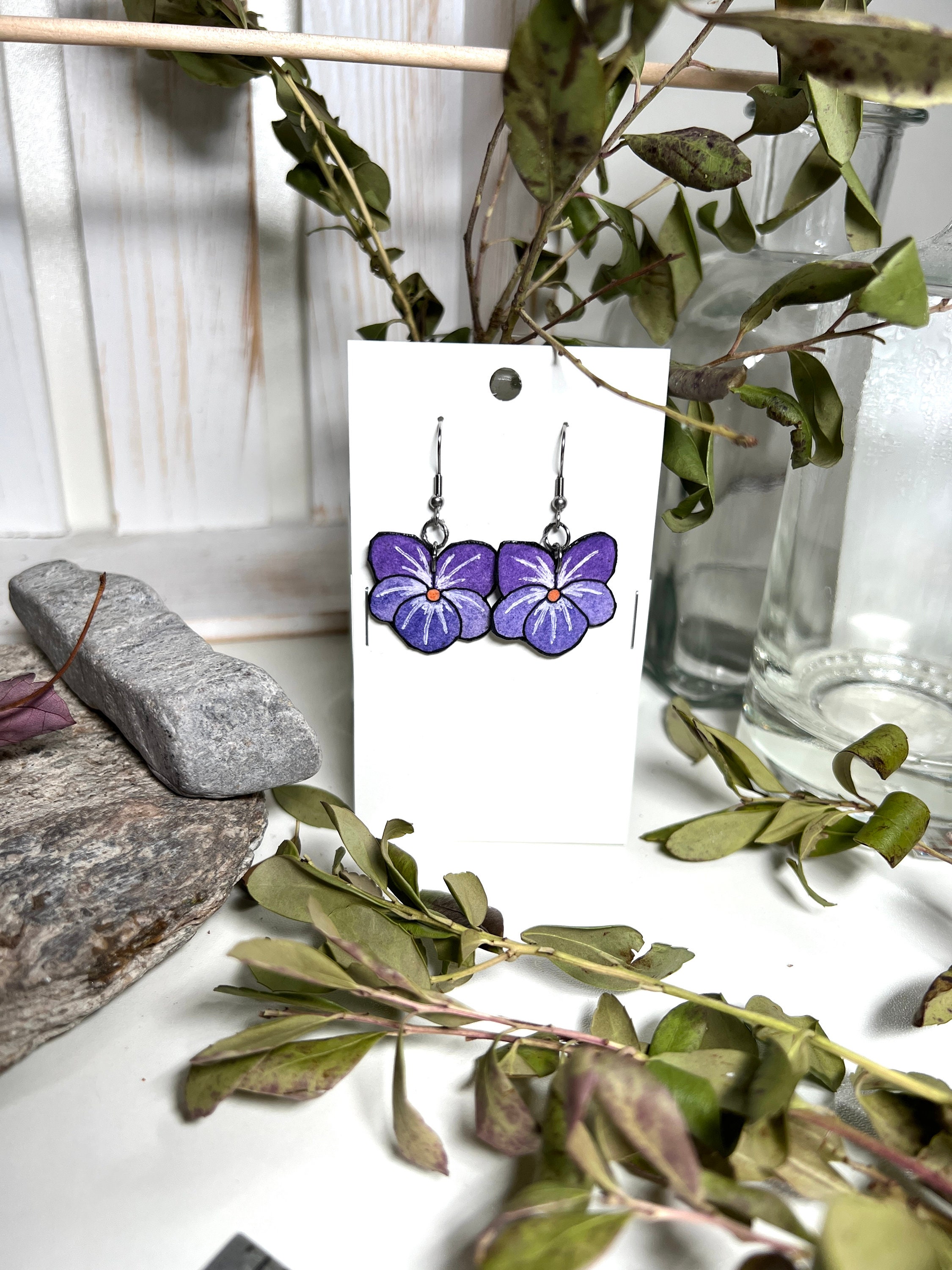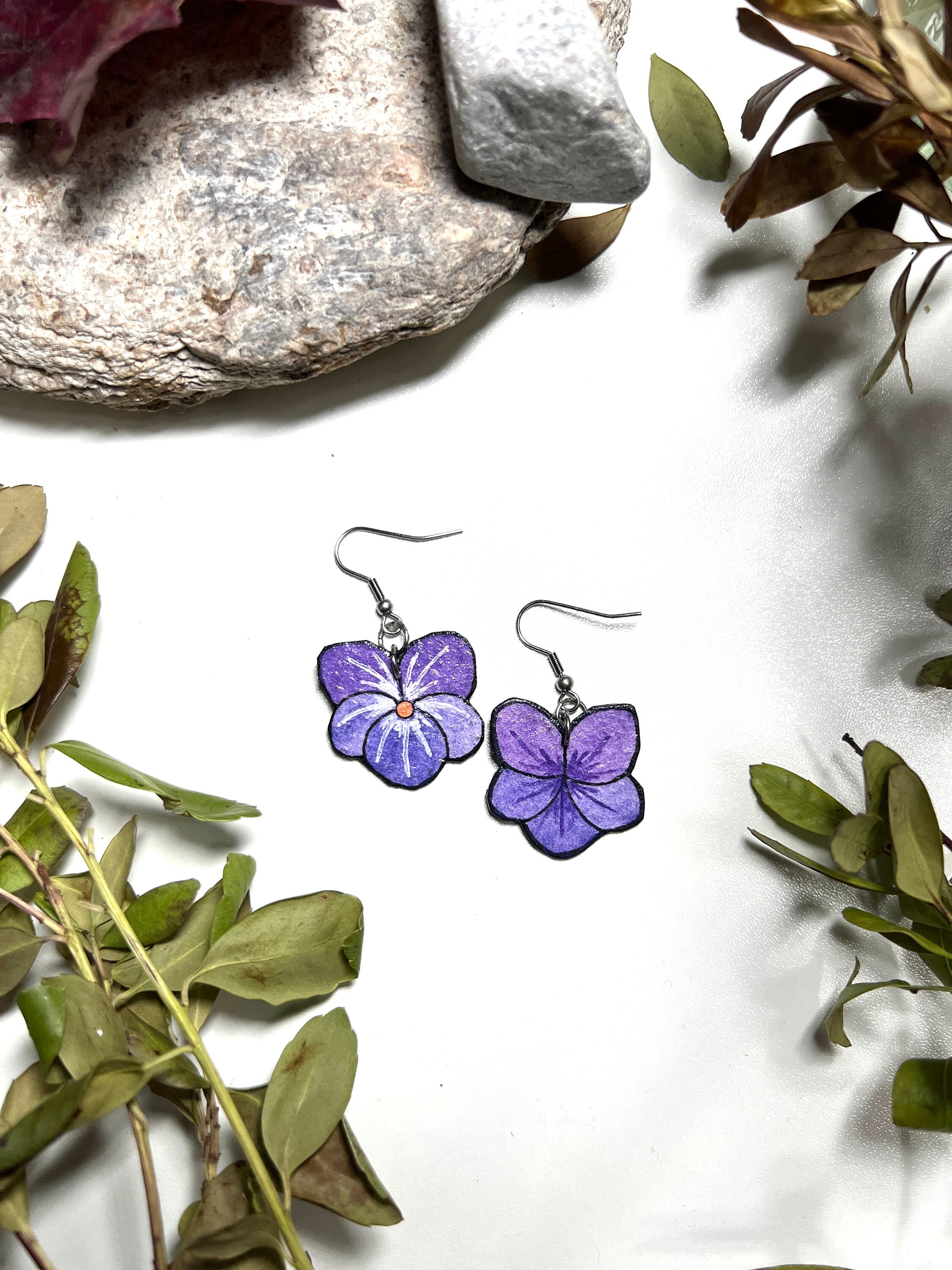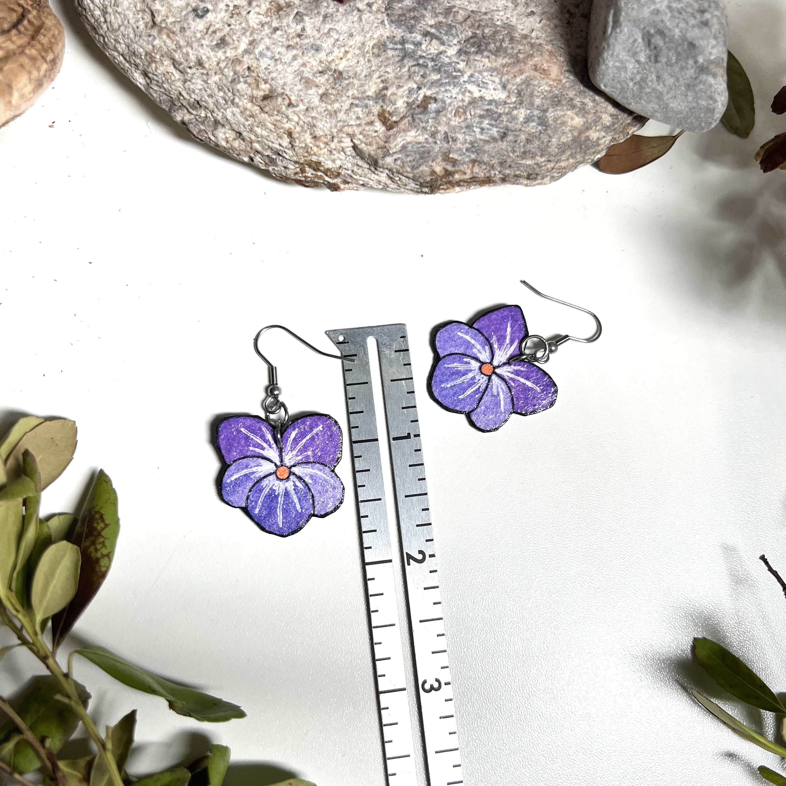Purple Violet Flower Earrings, Hand Painted, Lightweight