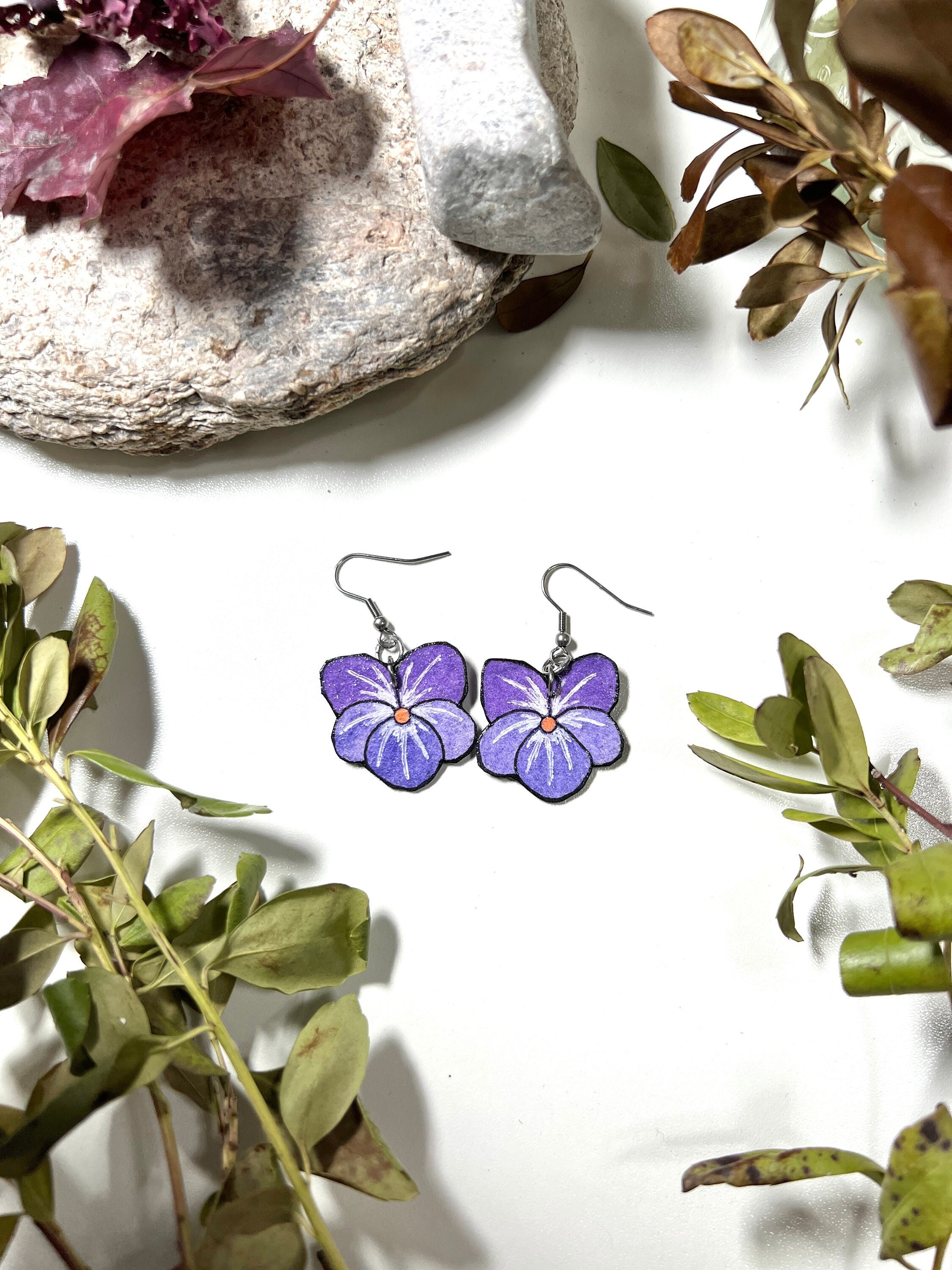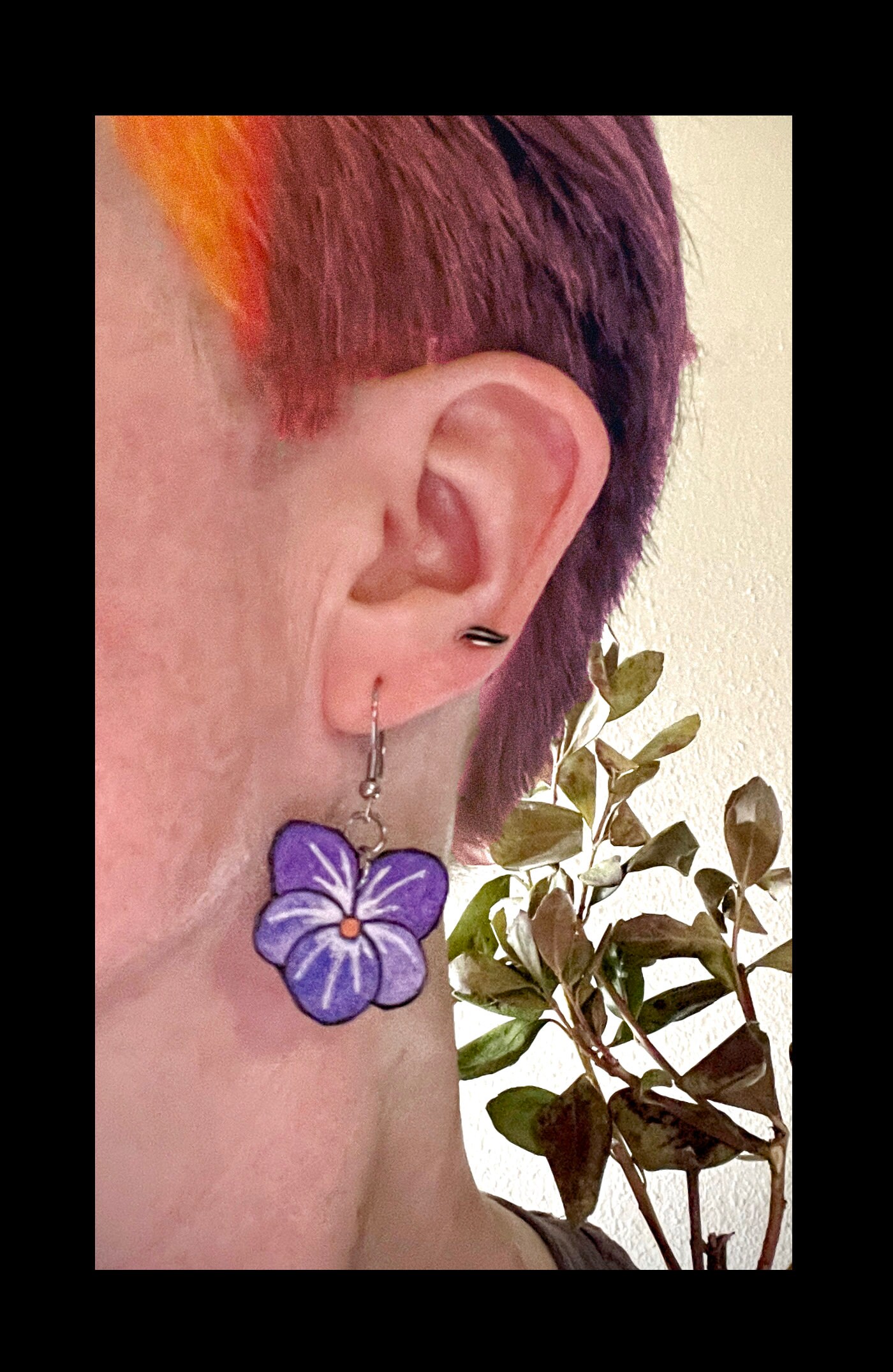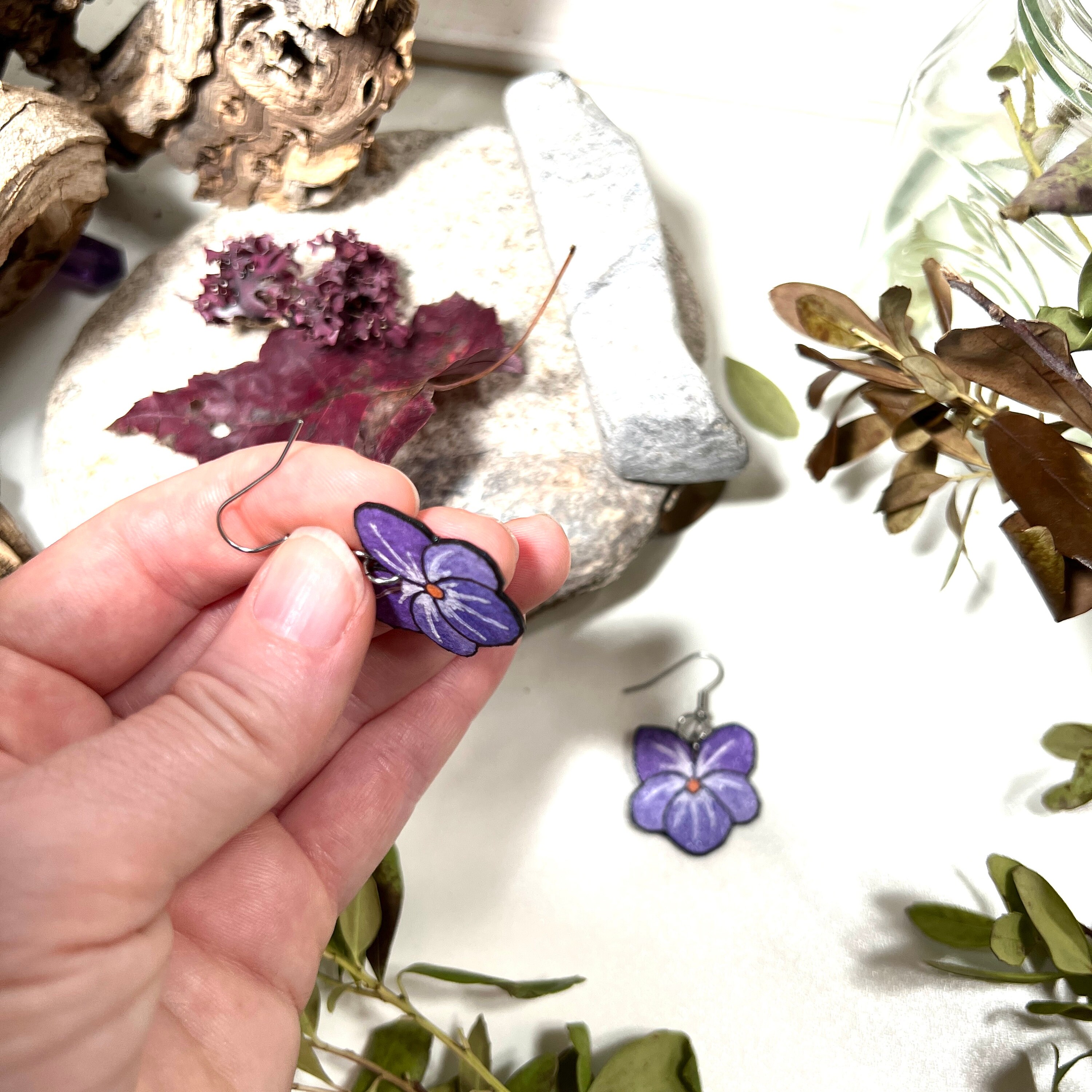 Purple Violet Flower Earrings, Hand Painted, Lightweight