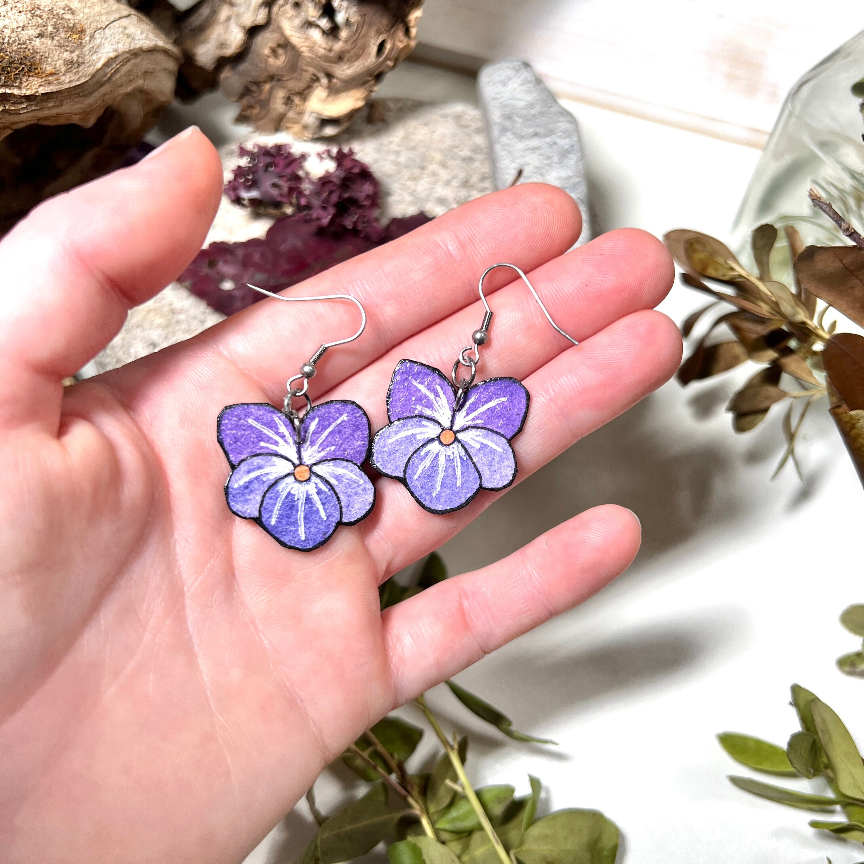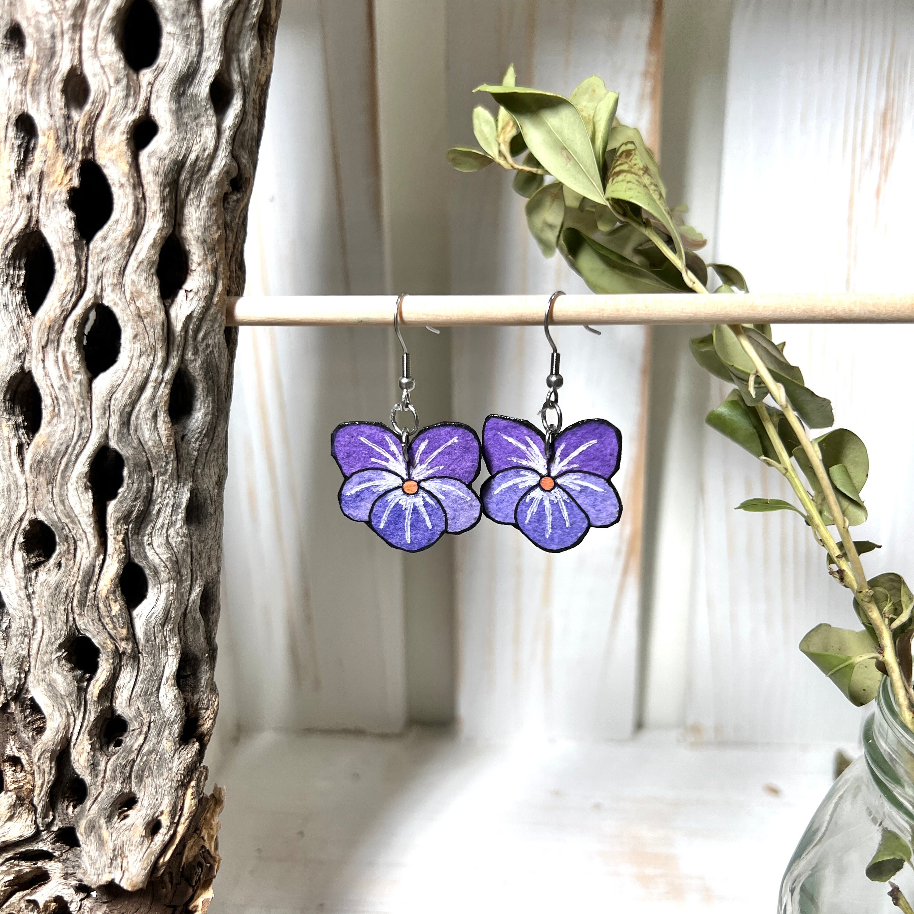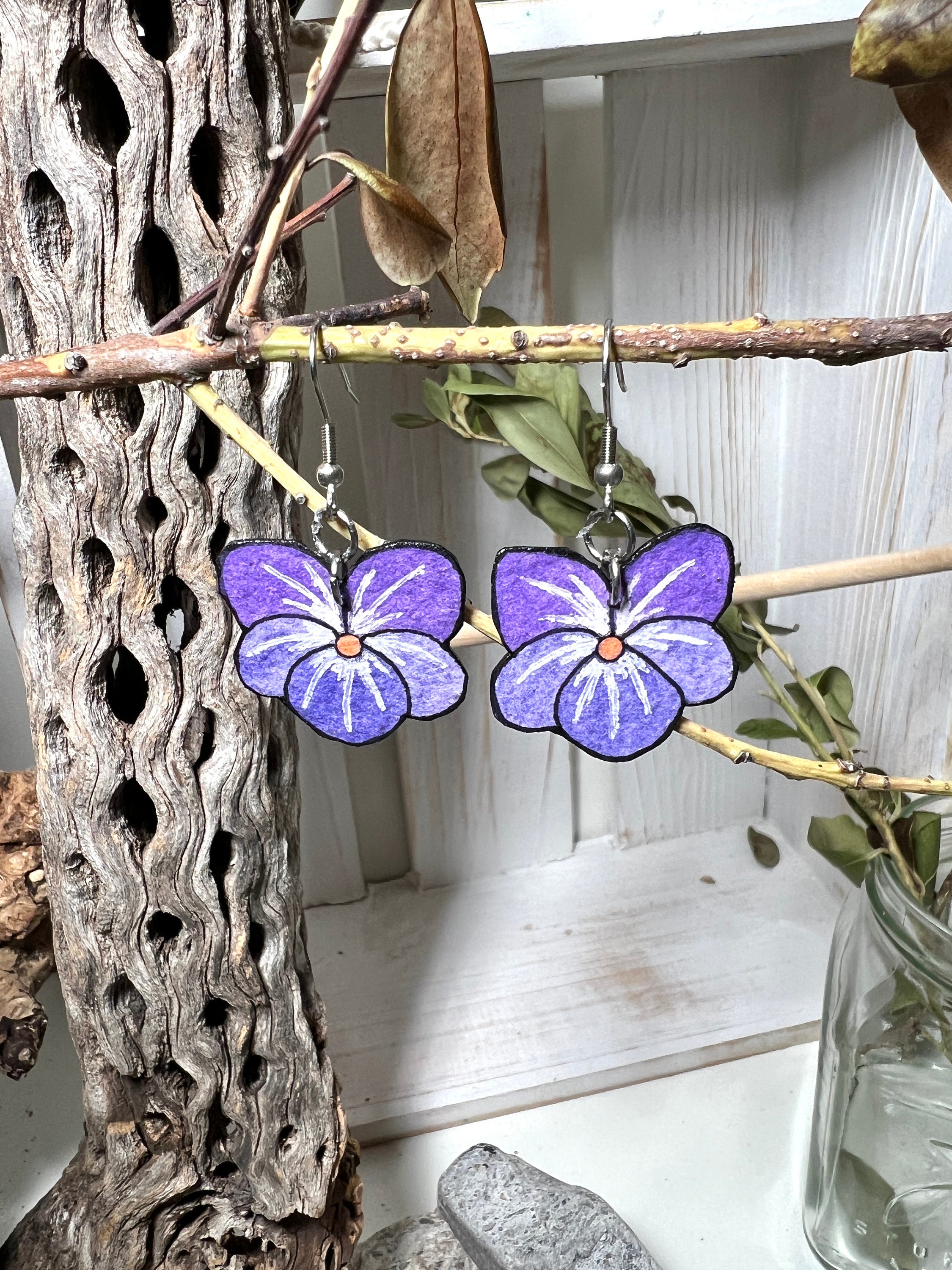 Inspired by the purple violets in the yard, these earrings are original Ink & Watercolor paintings hand painted on 1mm thick Italian Pressed Cotton Watercolor Paper. I paint the front and the back in full detail using Archival Pigma Ink and Inktense Watercolors. After painting, I coat them in two layers of protective lacquer, making them UV-Resistant and Water Resistant. Once complete, they have almost no weight. All hardware is hypoallergenic Stainless Steel.