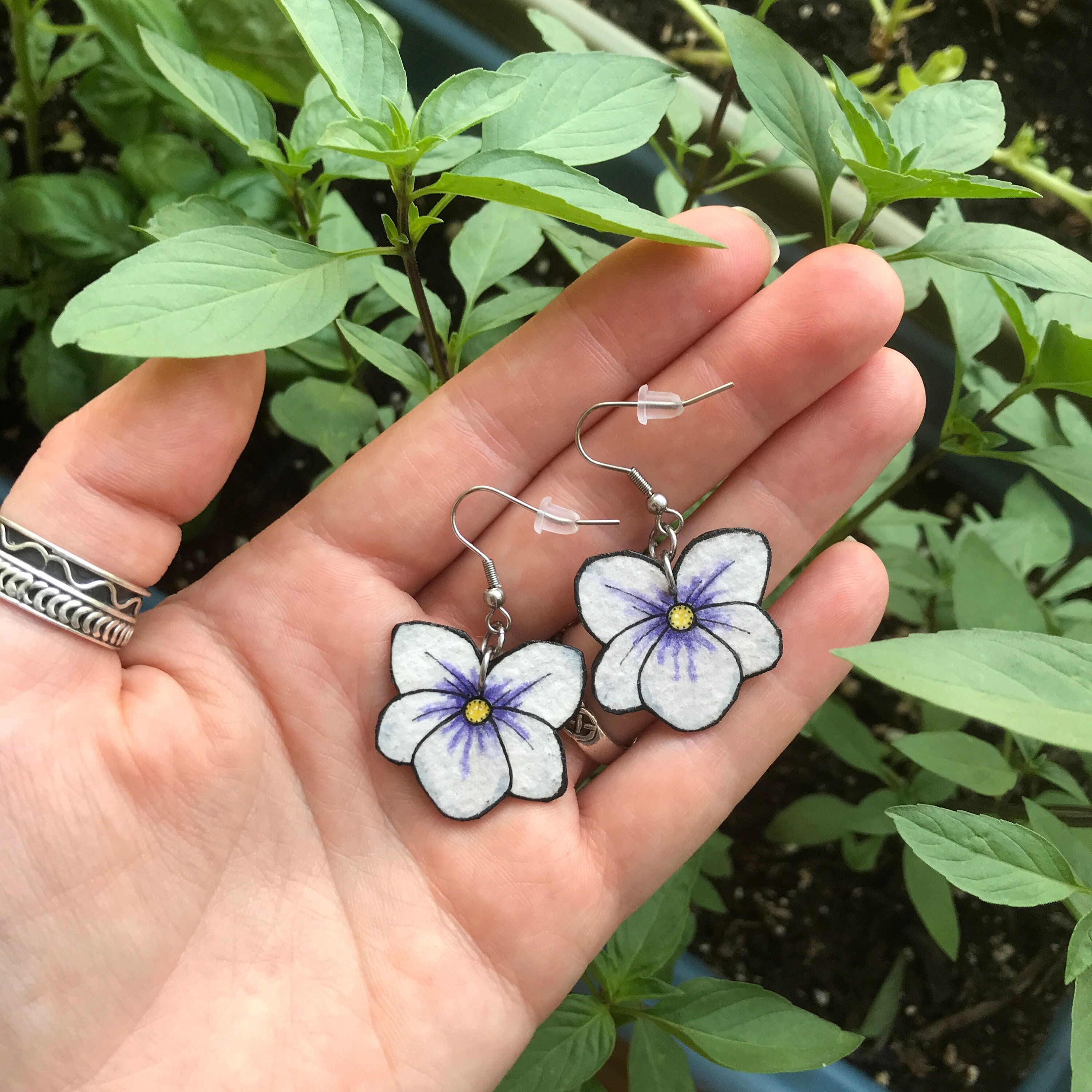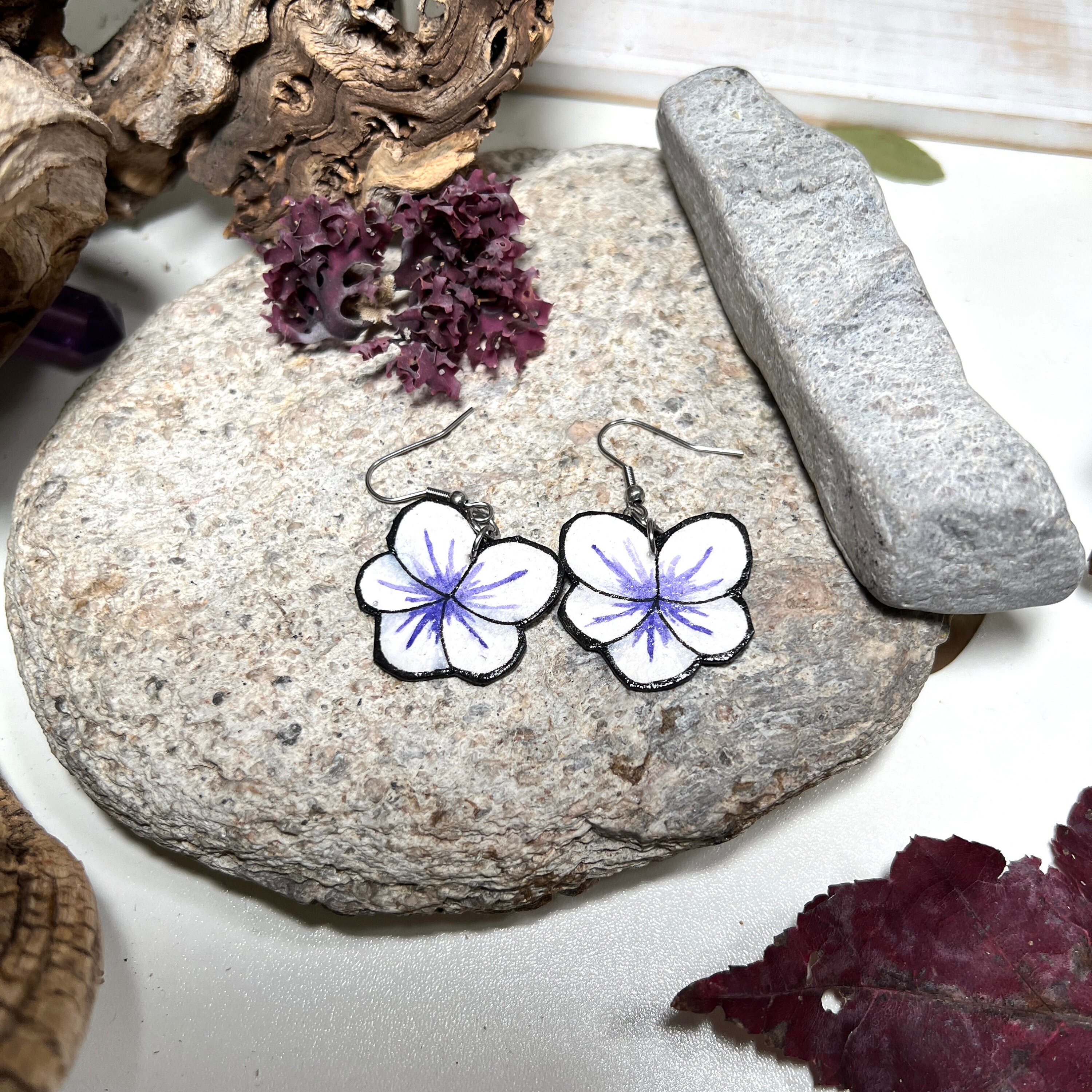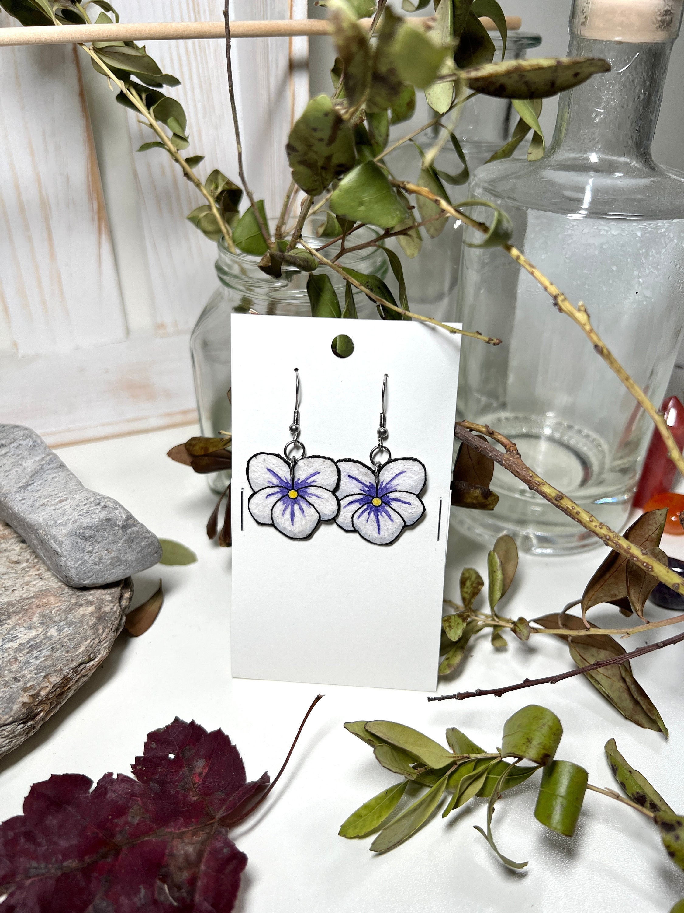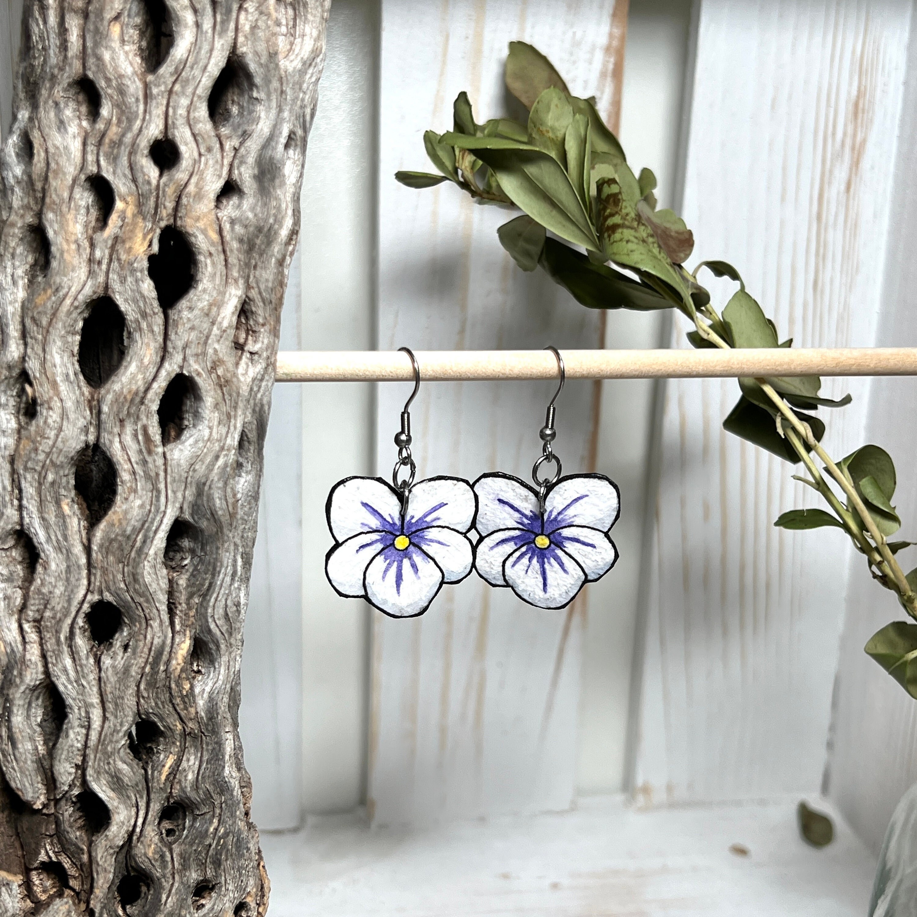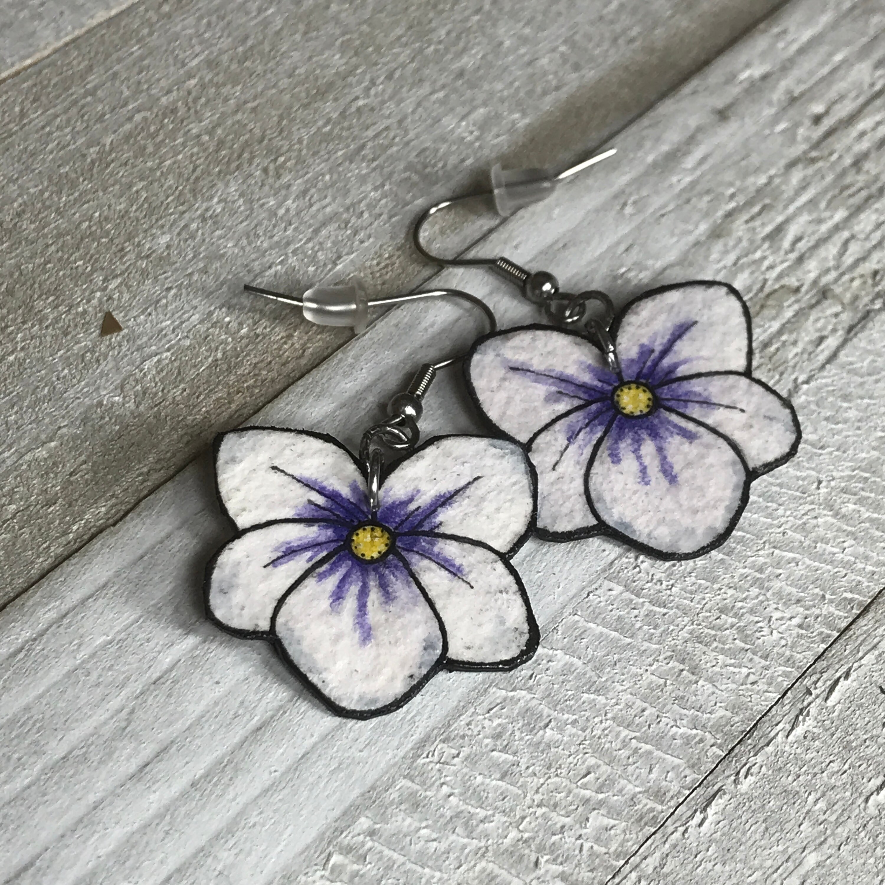 Inspired by the violets in the yard, these earrings are original Ink & Watercolor paintings hand painted on 1mm thick Italian Pressed Cotton Watercolor Paper. I paint the front and the back in full detail using Archival Pigma Ink and Inktense Watercolors. After painting, I coat them in two layers of protective lacquer, making them UV-Resistant and Water Resistant. Once complete, they have almost no weight. All hardware is hypoallergenic Stainless Steel.