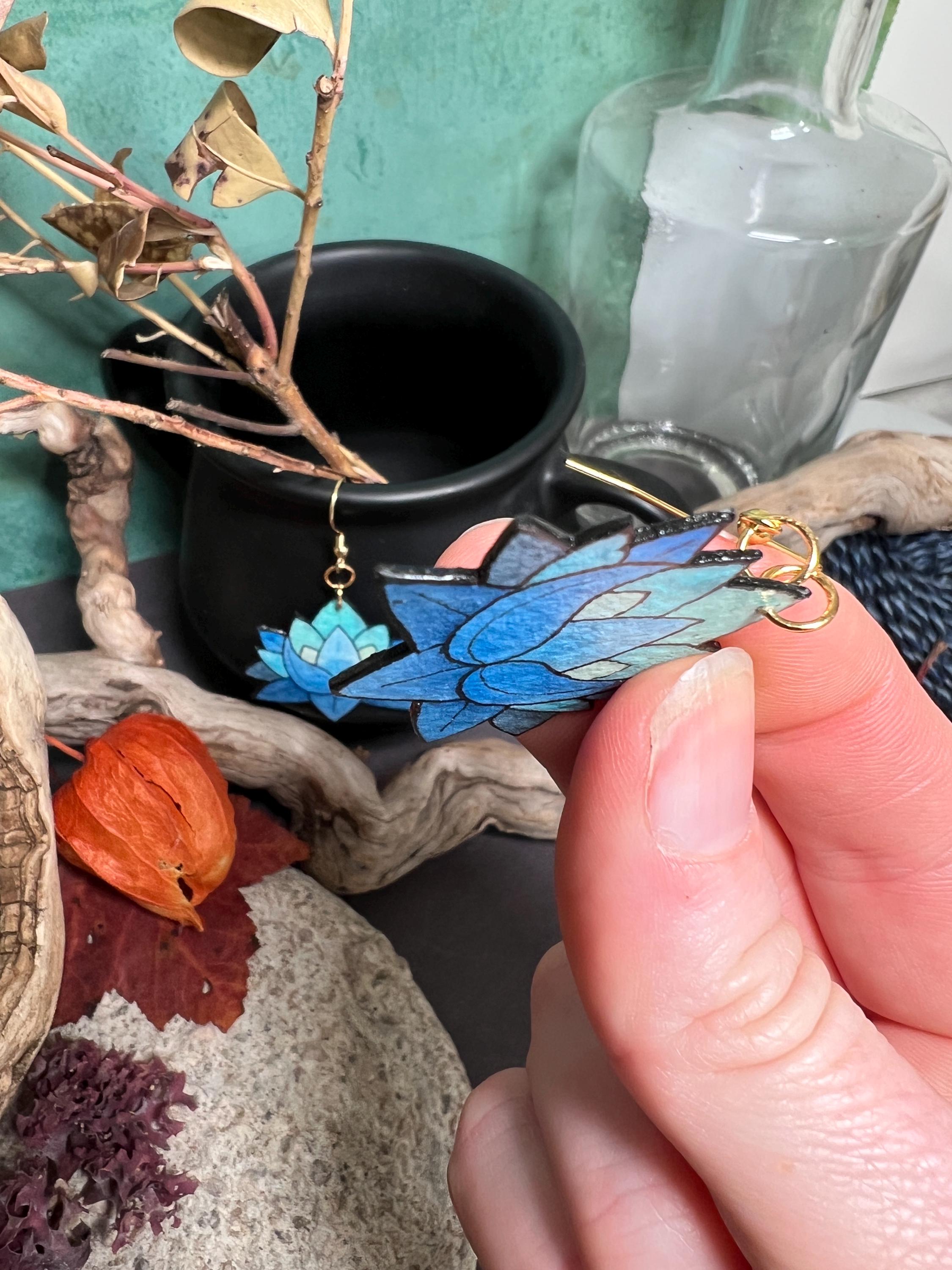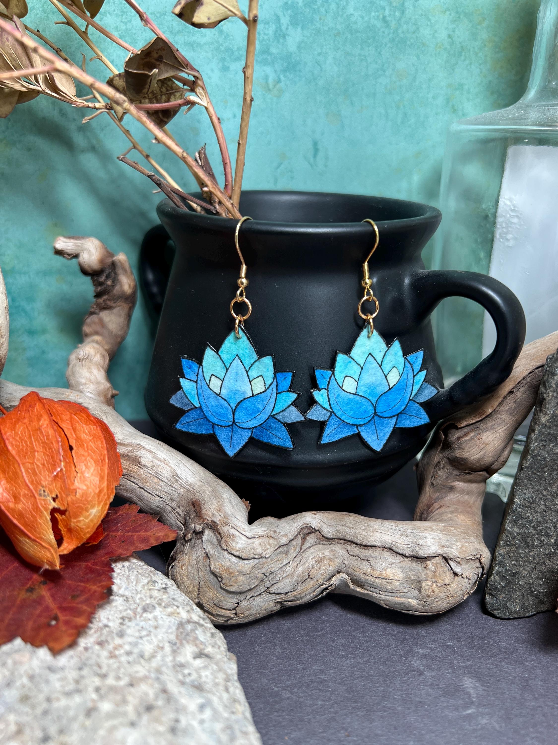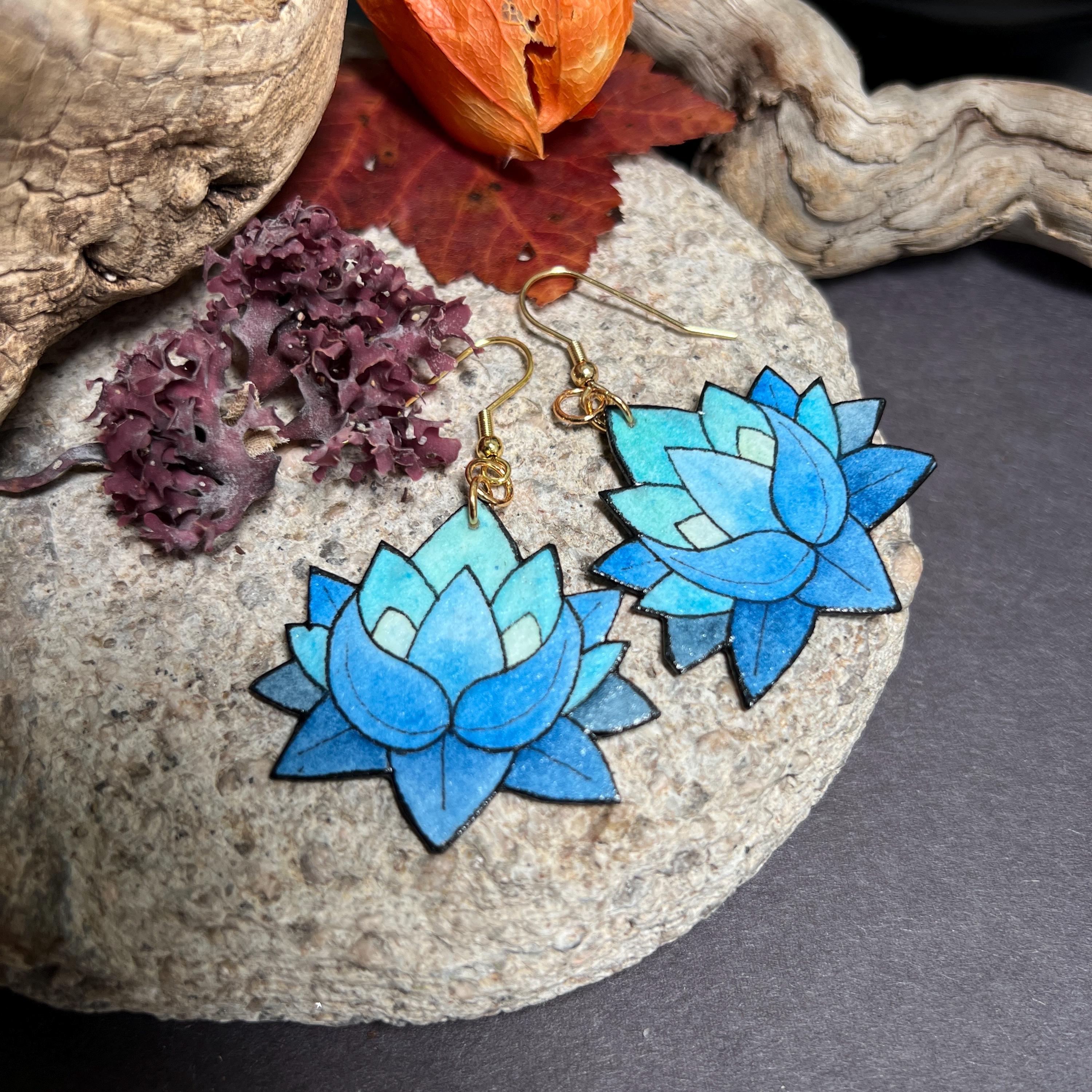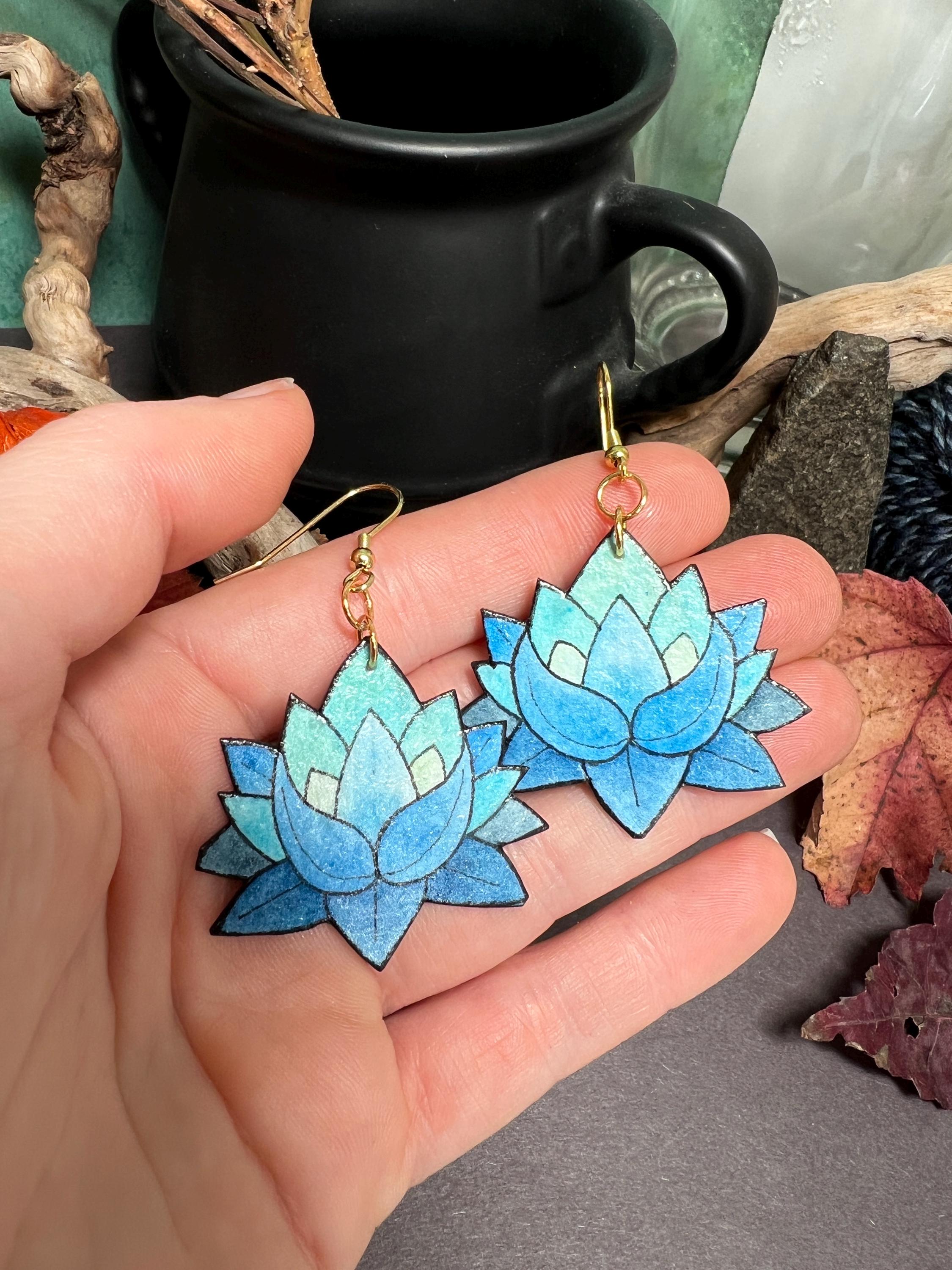 These Blue Lotus Flower Earrings are original Ink & Watercolor paintings hand painted on 1mm thick Italian Pressed Cotton Watercolor Paper. I paint the front and the back in full detail using Archival Pigma Ink and Inktense Watercolors. After painting, I coat them in two layers of protective lacquer, making them UV-Resistant and Water Resistant. Once complete, they are as light as a feather and stronger than wood. All hardware is Stainless Steel or Gold-Plated Stainless Steel.