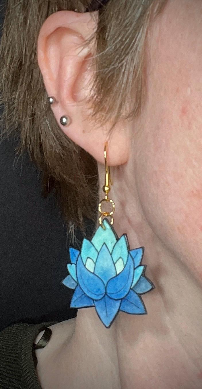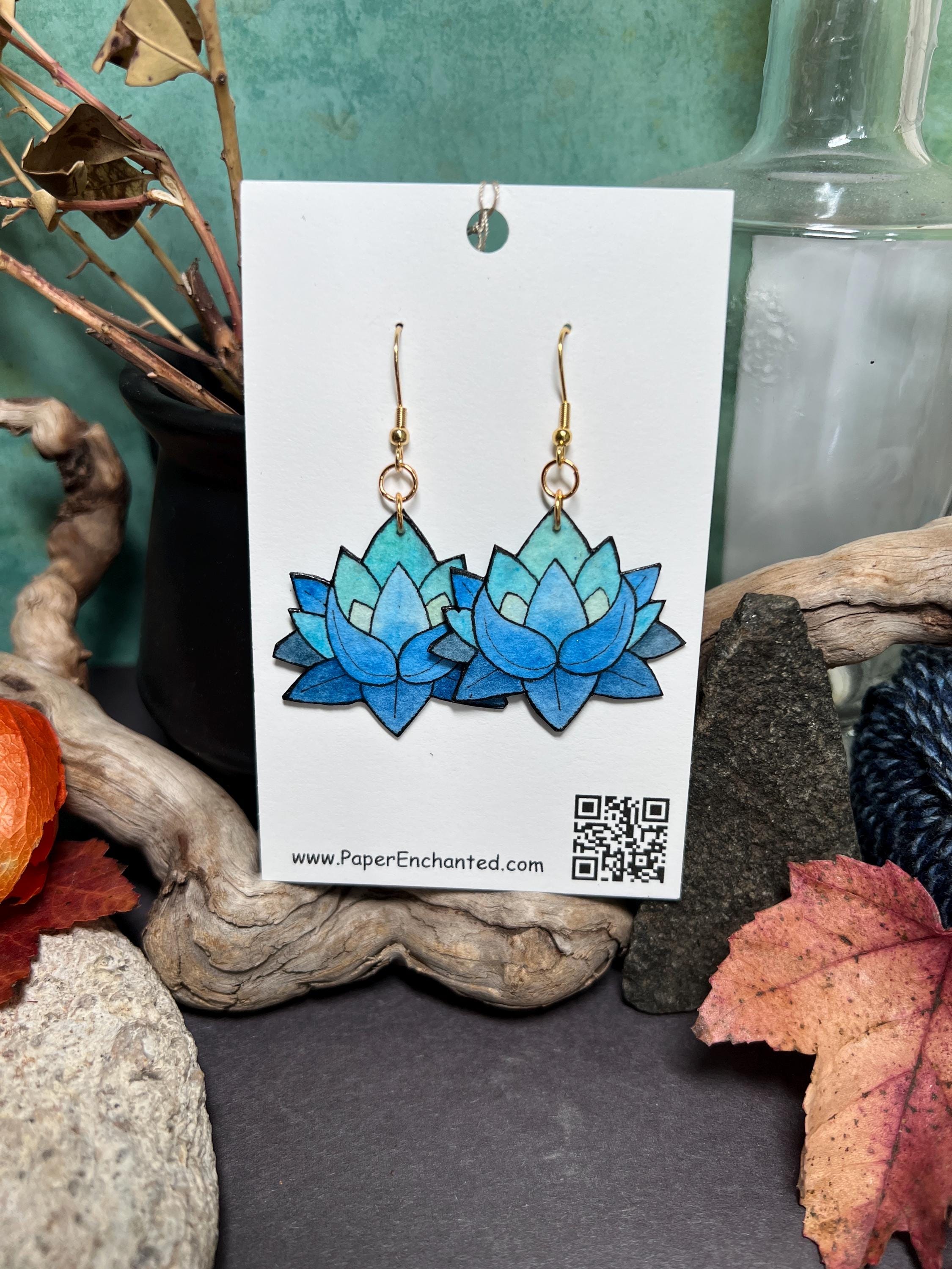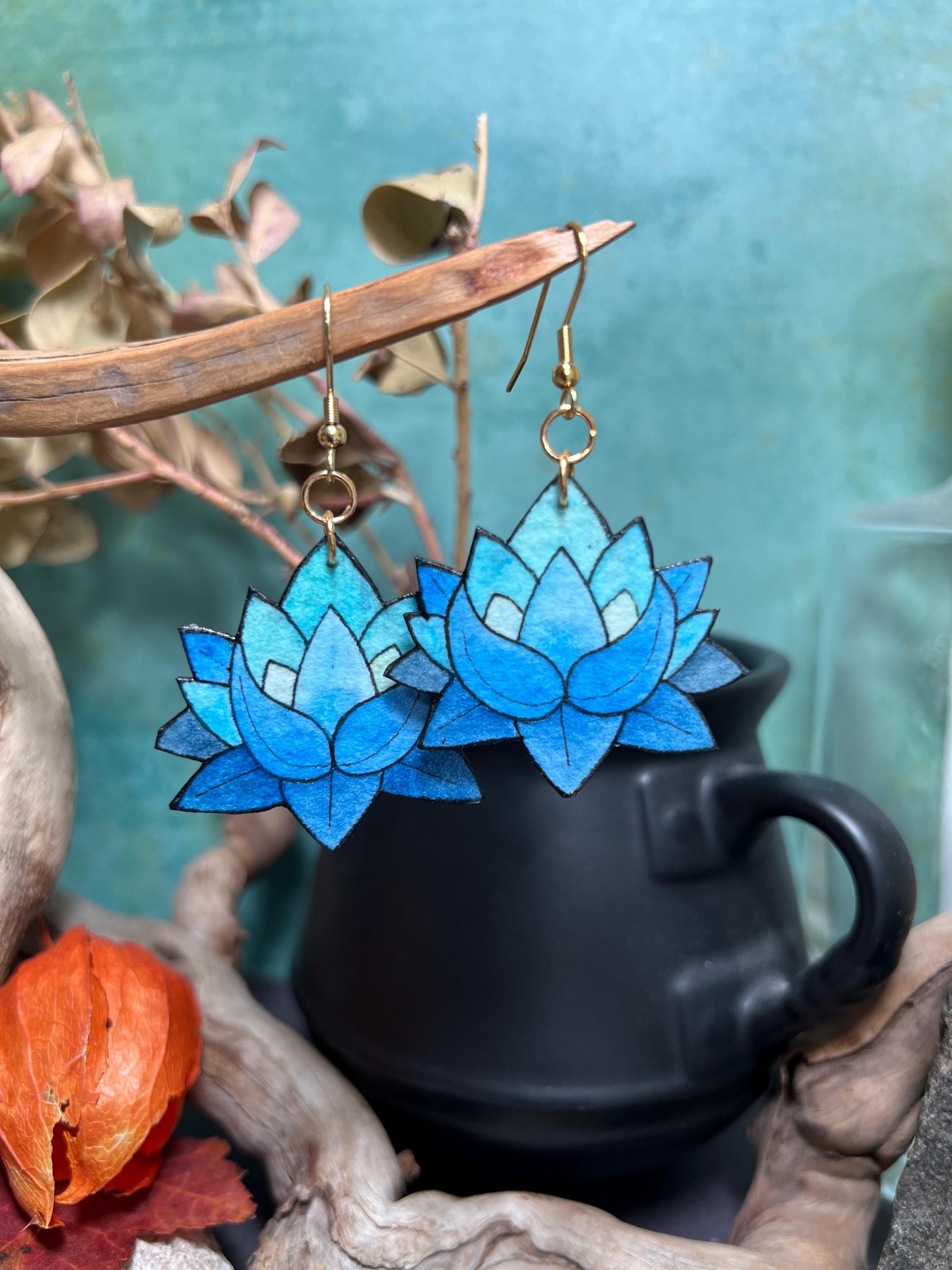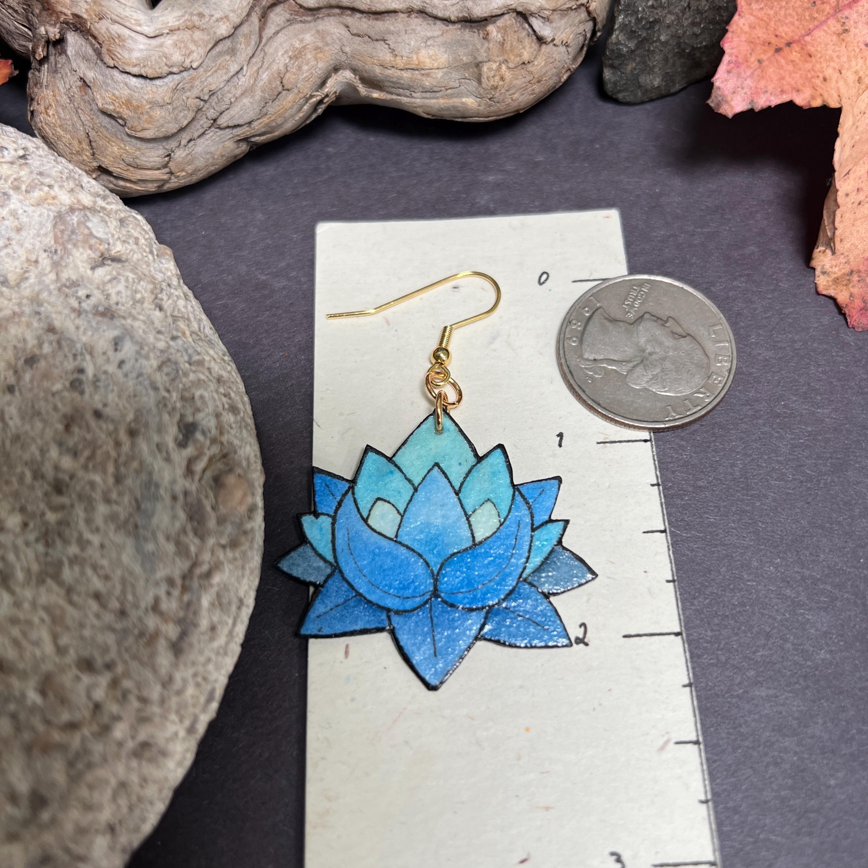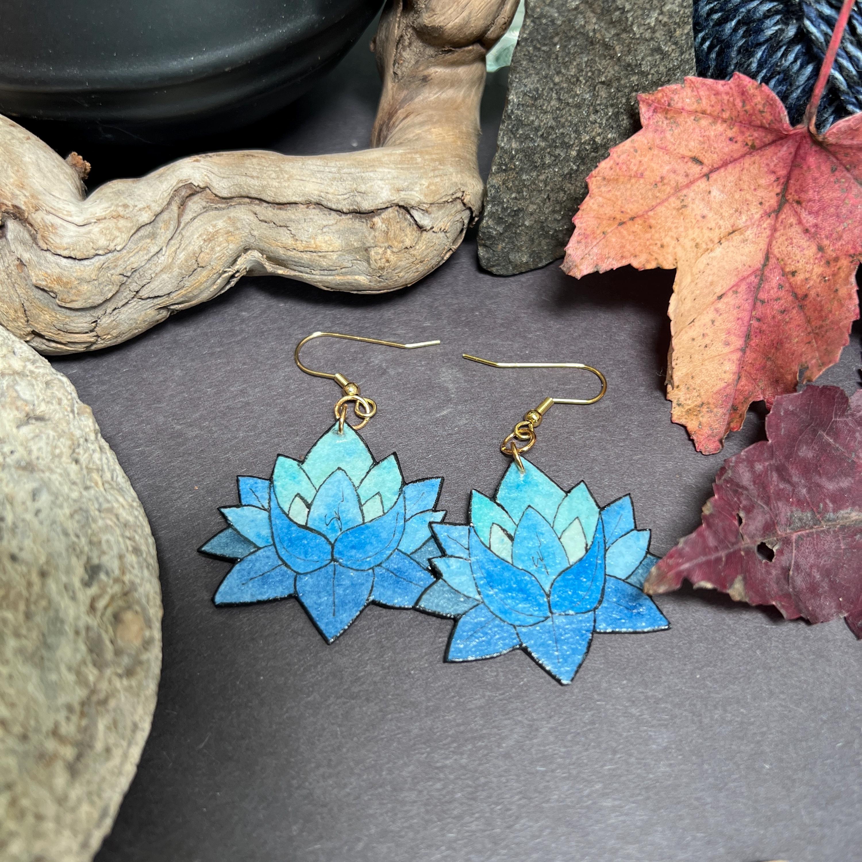 These Blue Lotus Flower Earrings are original Ink & Watercolor paintings hand painted on 1mm thick Italian Pressed Cotton Watercolor Paper. I paint the front and the back in full detail using Archival Pigma Ink and Inktense Watercolors. After painting, I coat them in two layers of protective lacquer, making them UV-Resistant and Water Resistant. Once complete, they are as light as a feather and stronger than wood. All hardware is Stainless Steel or Gold-Plated Stainless Steel.