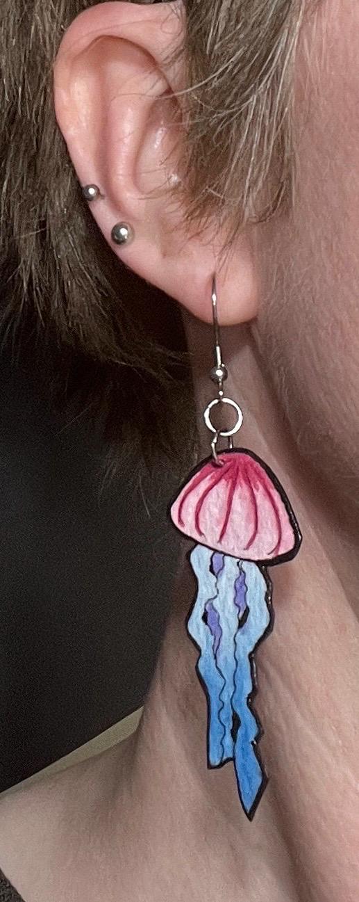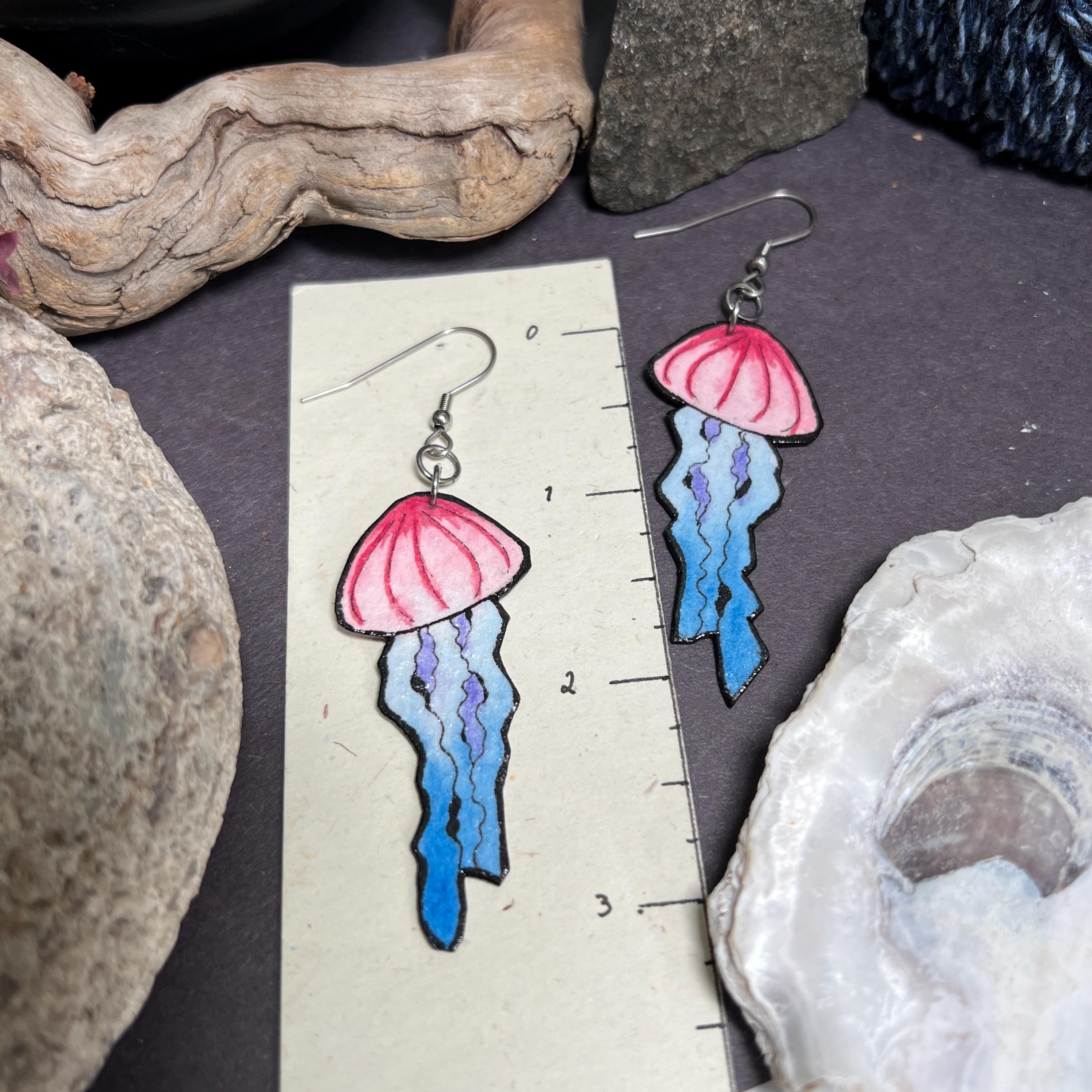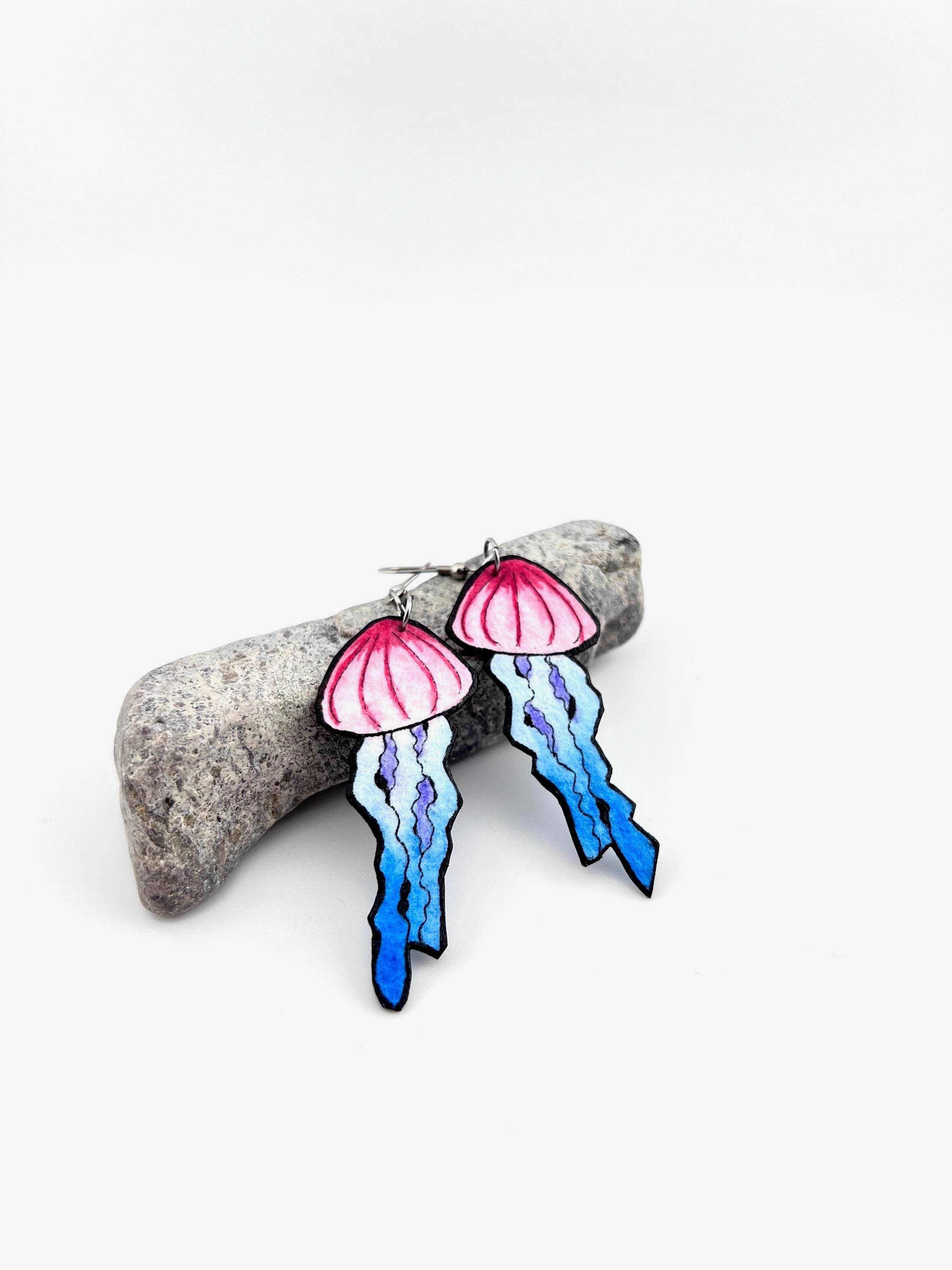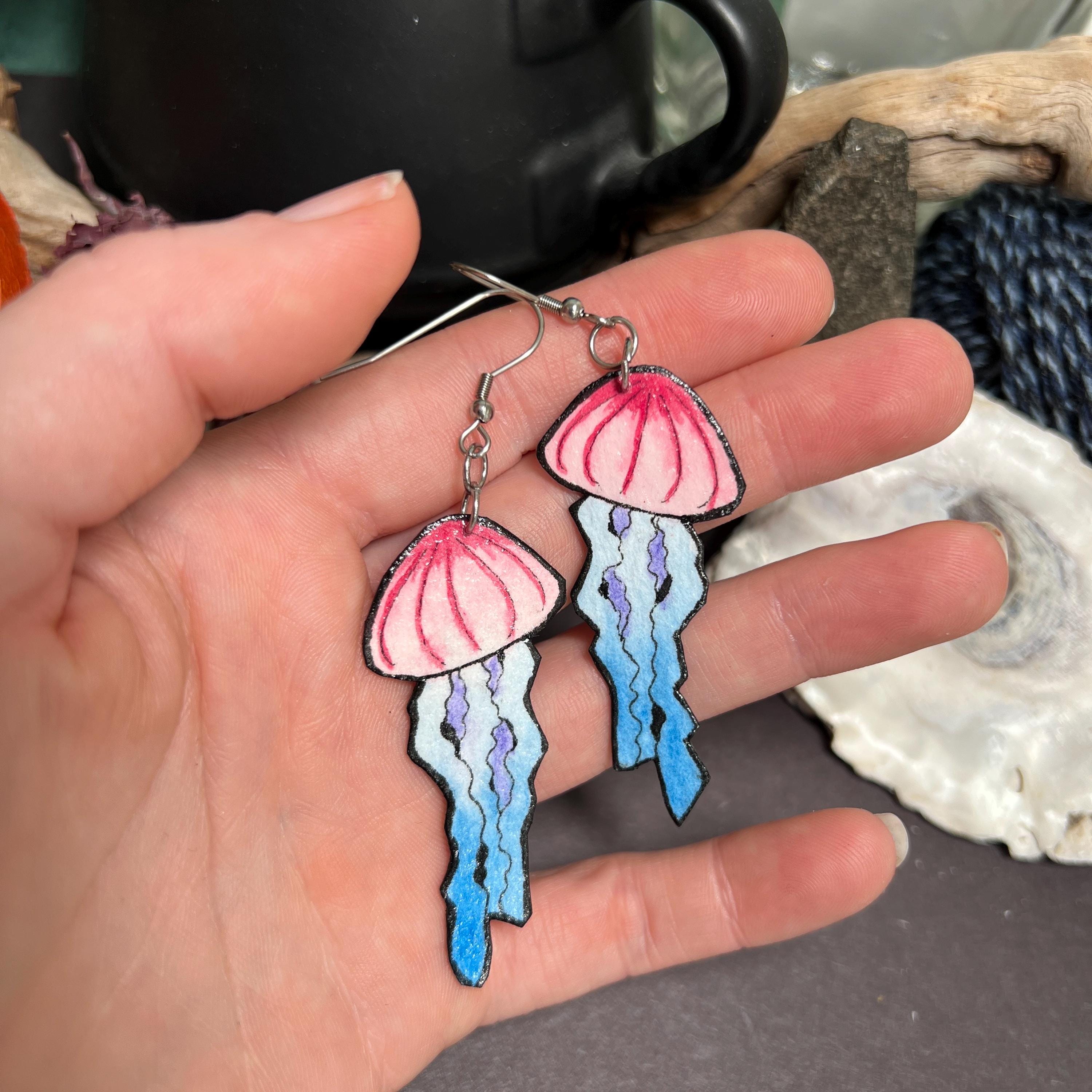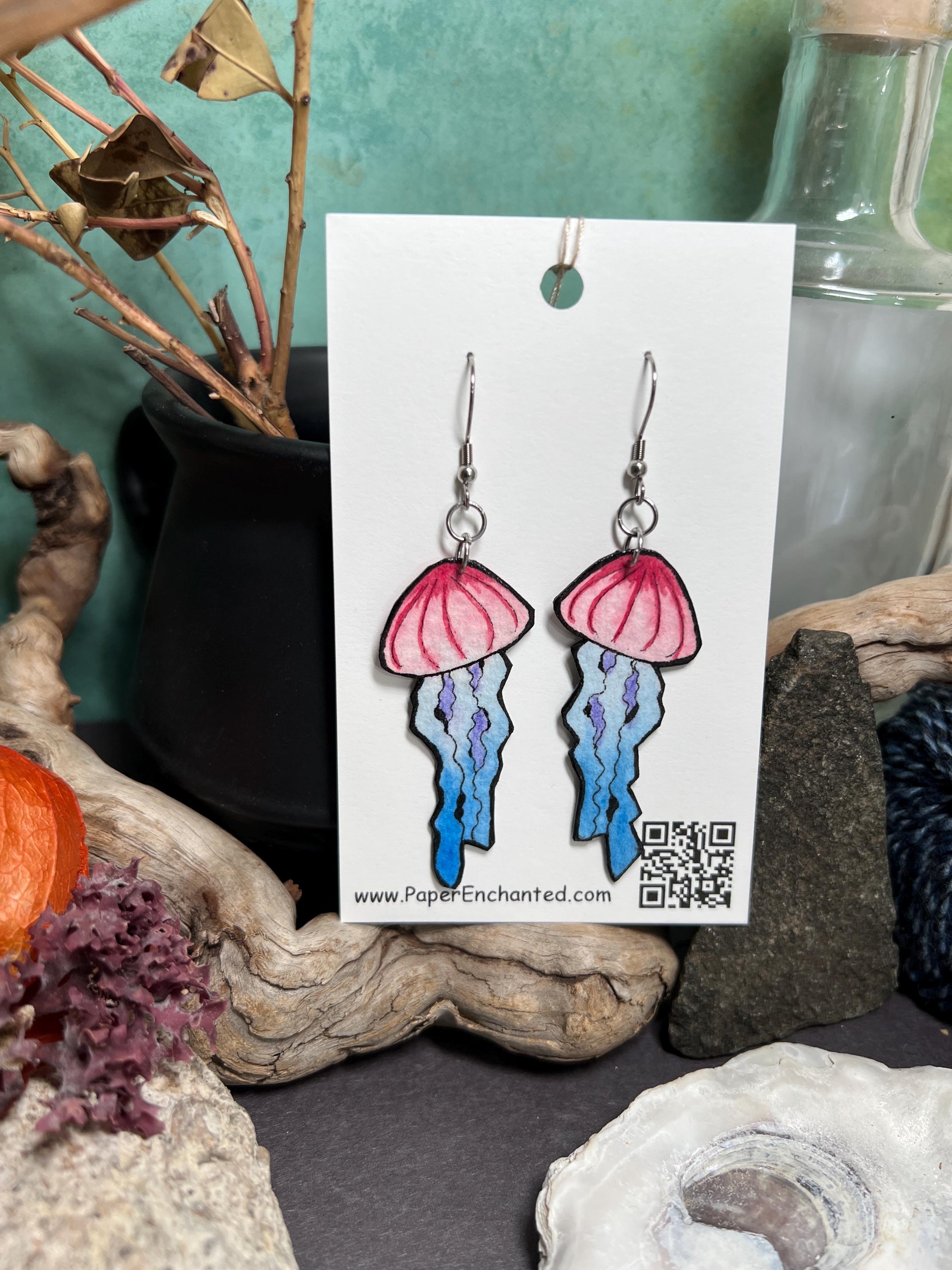 These Jellyfish Earrings are original Ink & Watercolor paintings hand painted on 1mm thick Italian Pressed Cotton Watercolor Paper. I paint the front and the back in full detail using Archival Pigma Ink and Inktense Watercolors. After painting, I coat them in two layers of protective lacquer, making them UV-Resistant and Water Resistant. Once complete, they have almost no weight. All hardware is hypoallergenic Stainless Steel of Gold-Finished Stainless Steel.