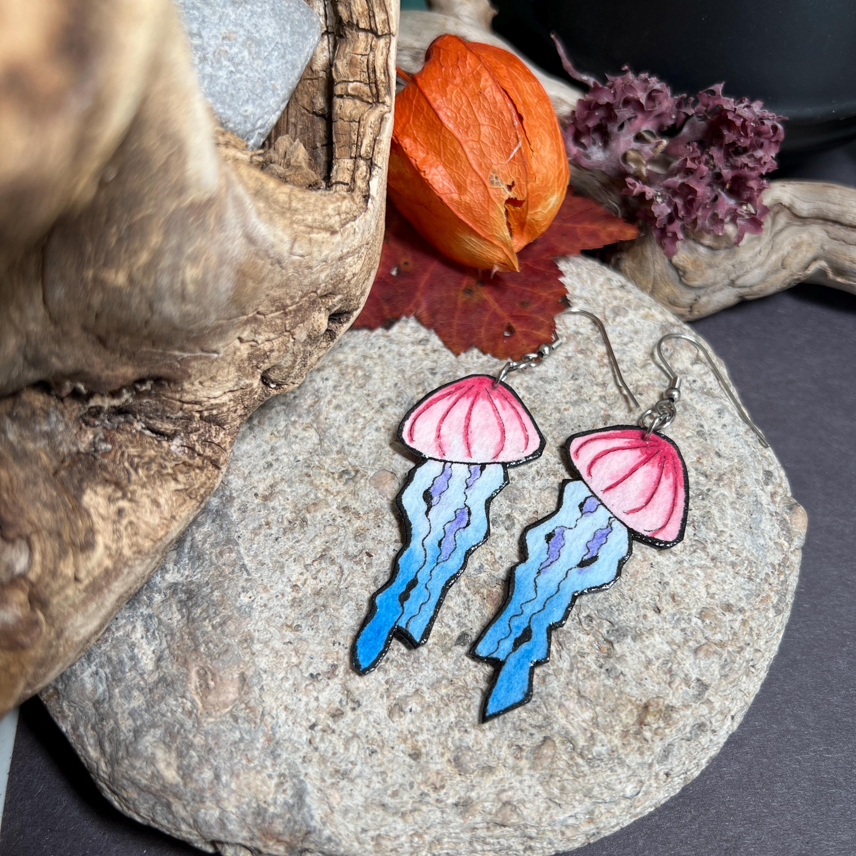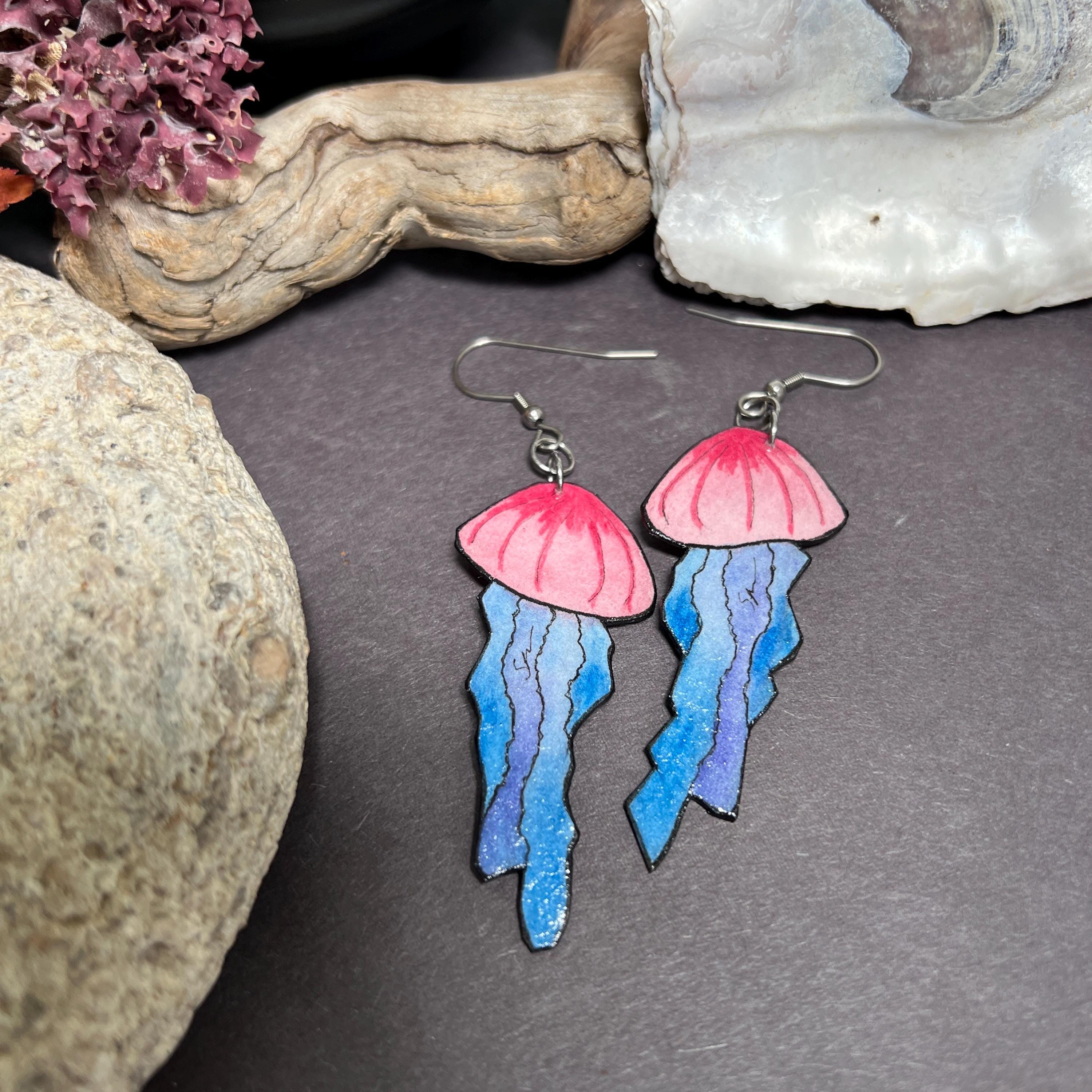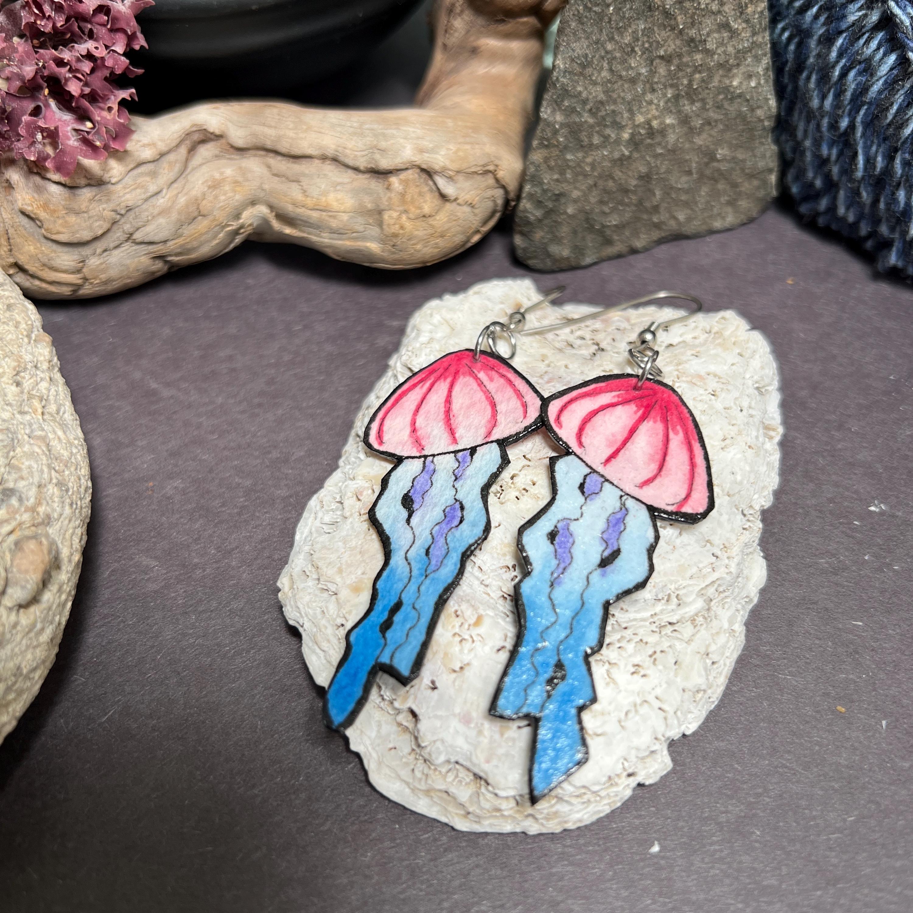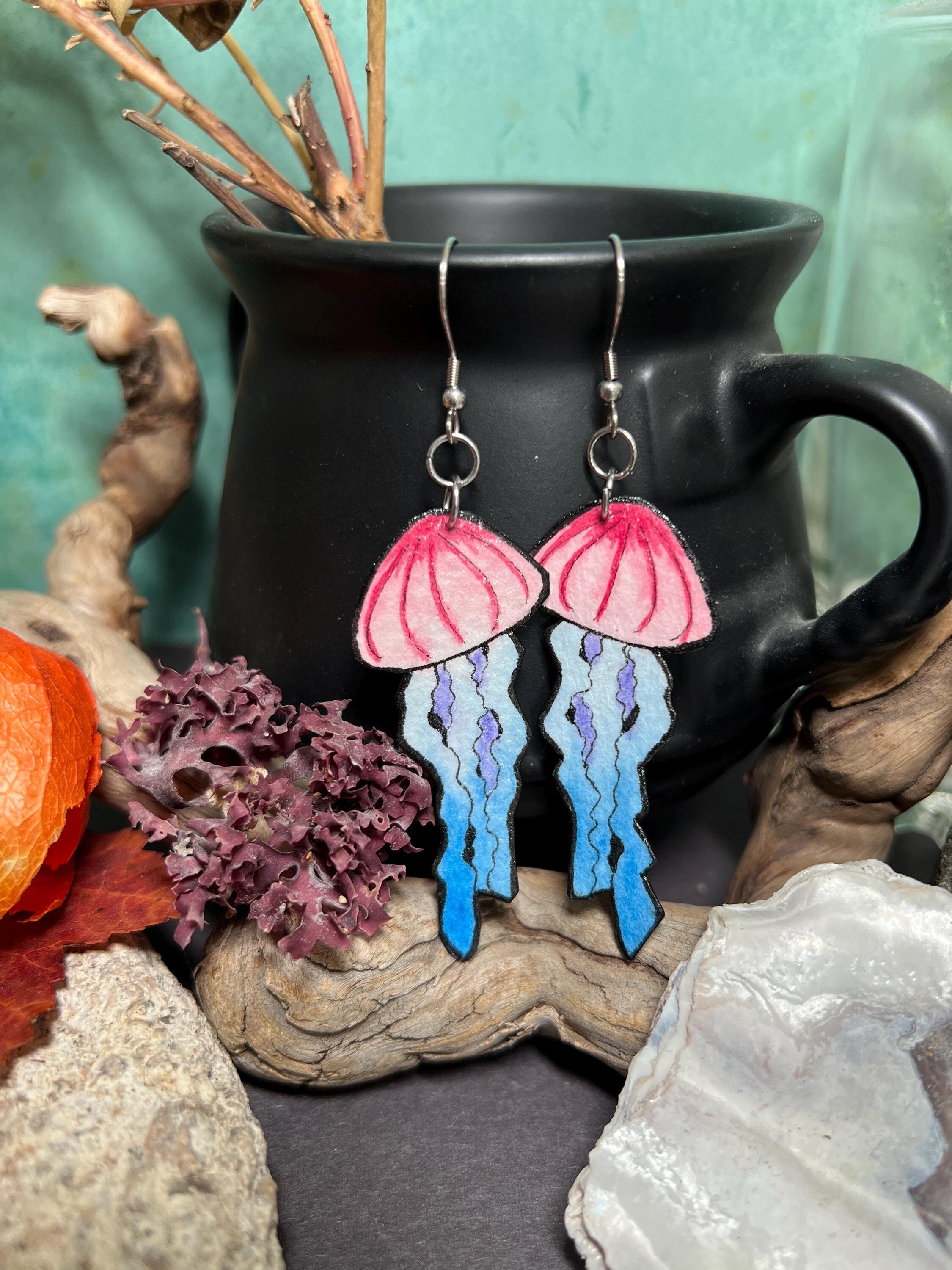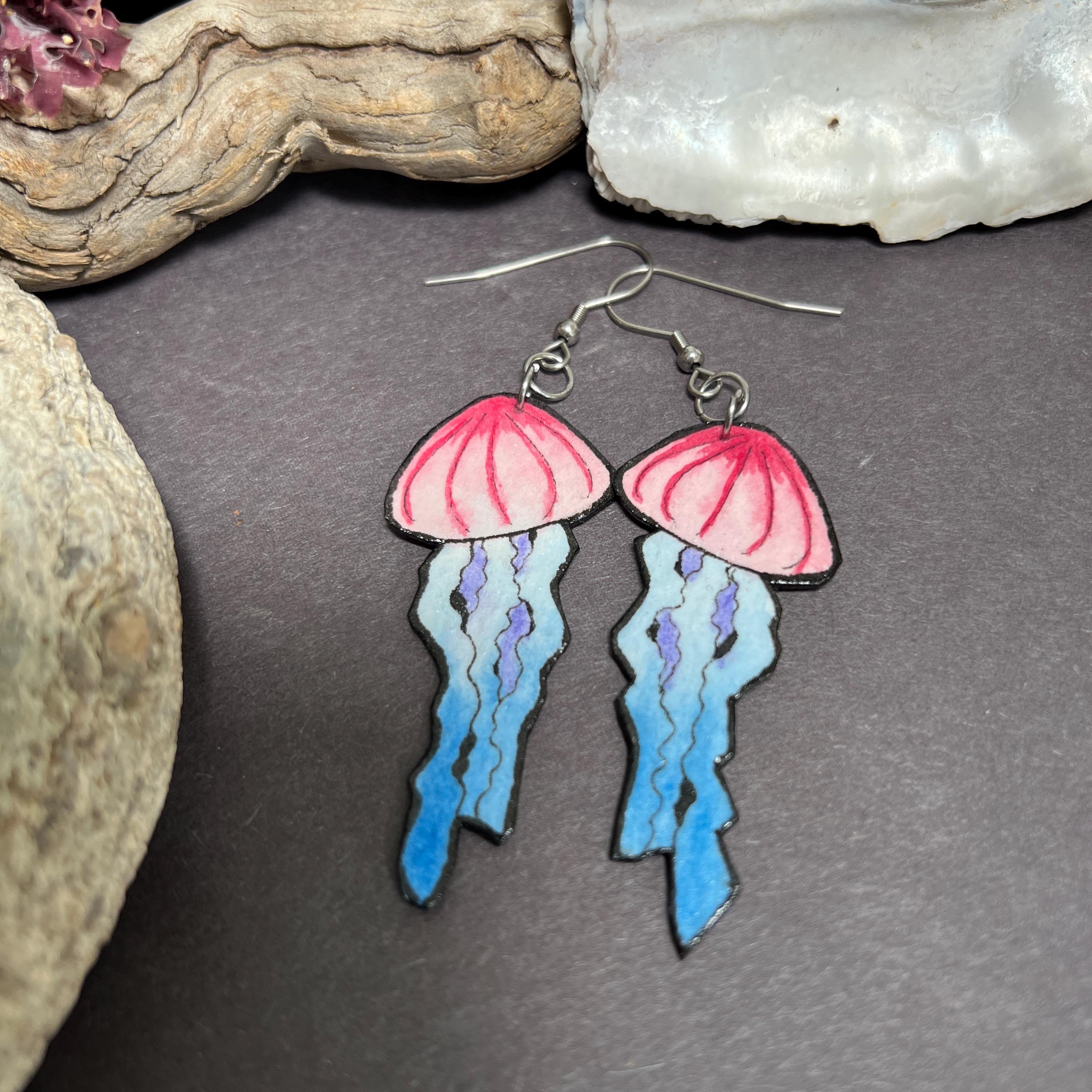 These Jellyfish Earrings are original Ink & Watercolor paintings hand painted on 1mm thick Italian Pressed Cotton Watercolor Paper. I paint the front and the back in full detail using Archival Pigma Ink and Inktense Watercolors. After painting, I coat them in two layers of protective lacquer, making them UV-Resistant and Water Resistant. Once complete, they have almost no weight. All hardware is hypoallergenic Stainless Steel of Gold-Finished Stainless Steel.