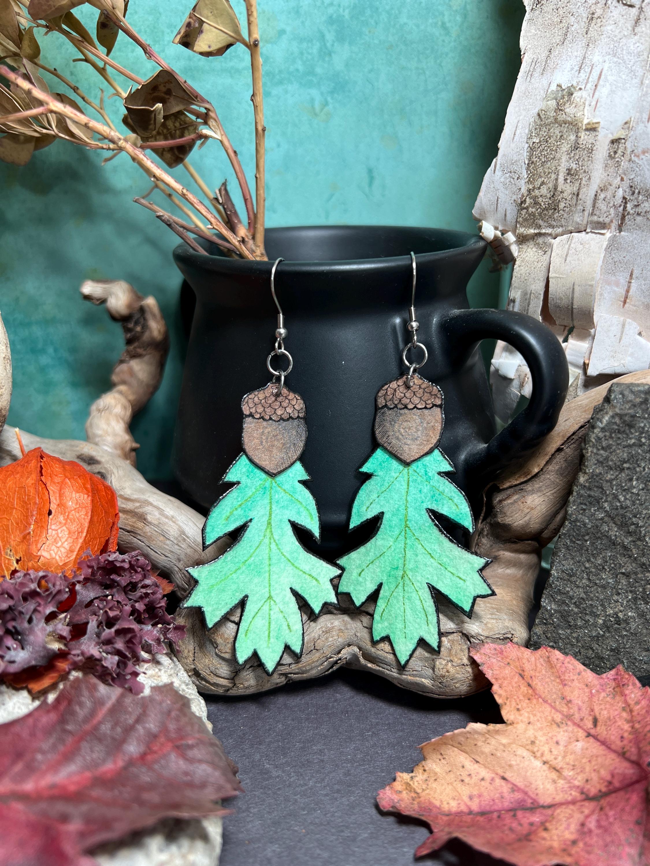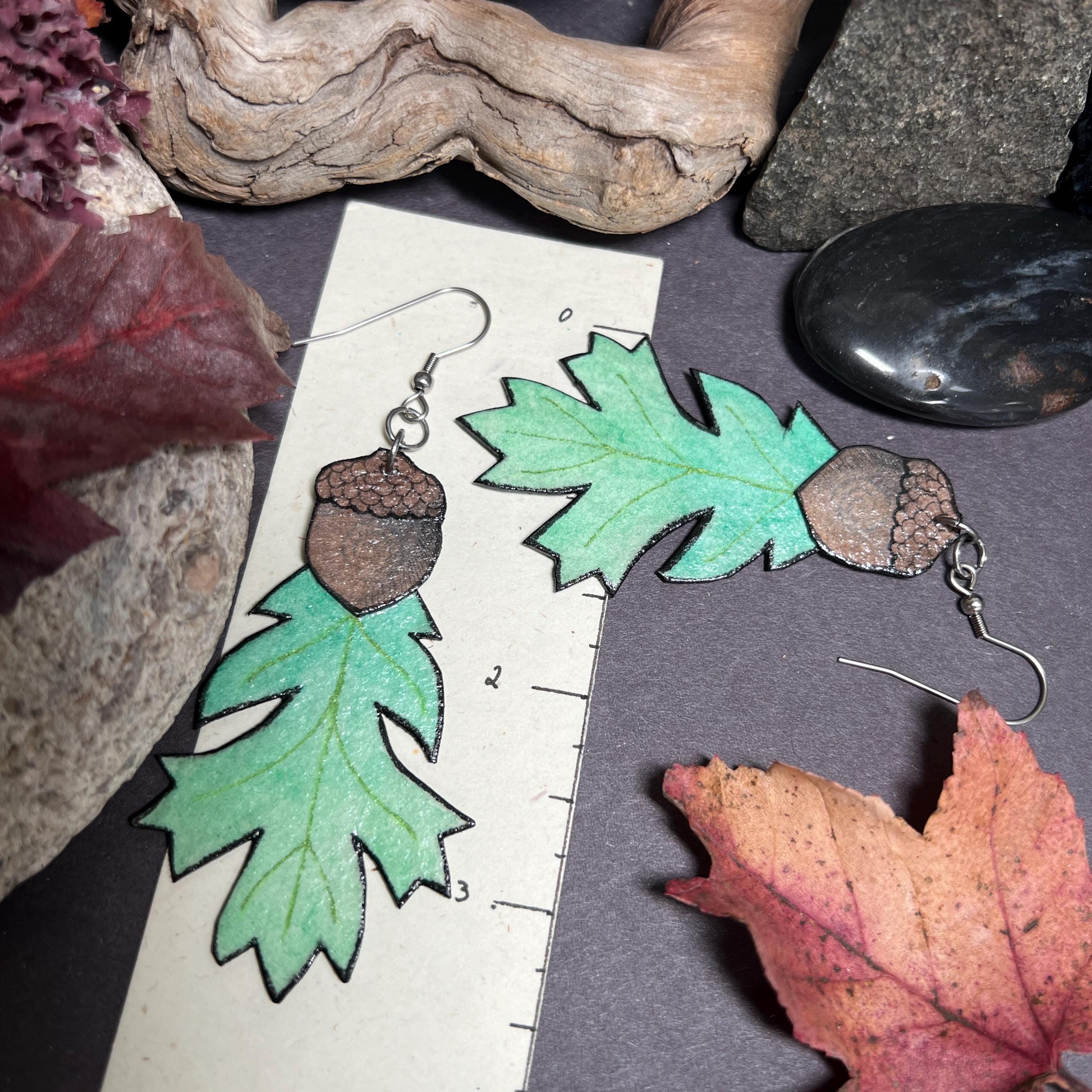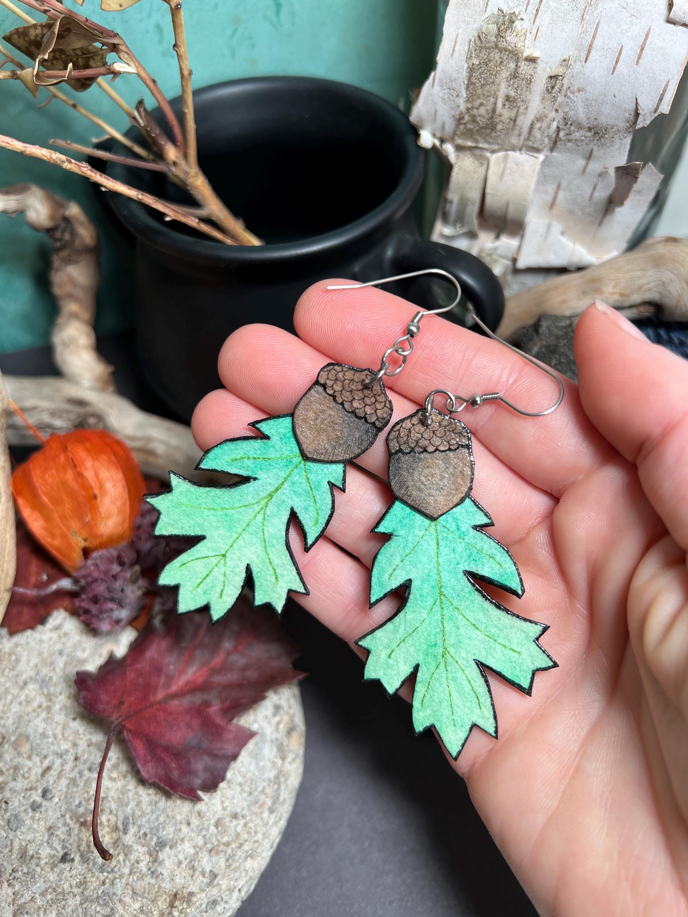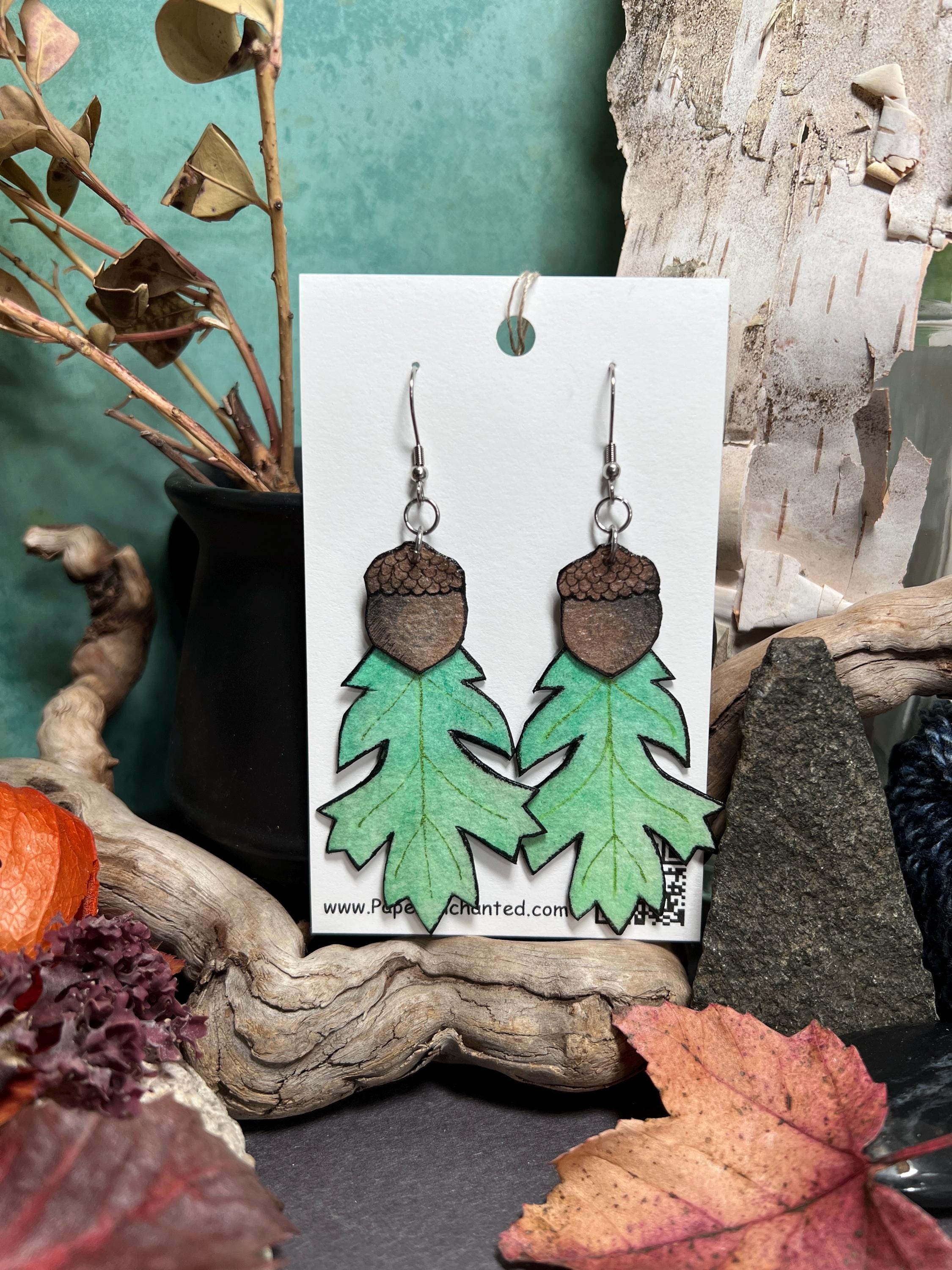 These Acorn and Oak Leaf Earrings are original Ink & Watercolor paintings hand painted on 1mm thick Italian Pressed Cotton Watercolor Paper. I paint the front and the back in full detail using Archival Pigma Ink and Inktense Watercolors. After painting, I coat them in two layers of protective lacquer, making them UV-Resistant and Water Resistant. Once complete, they have almost no weight. All hardware is hypoallergenic Stainless Steel of Gold-Finished Stainless Steel.