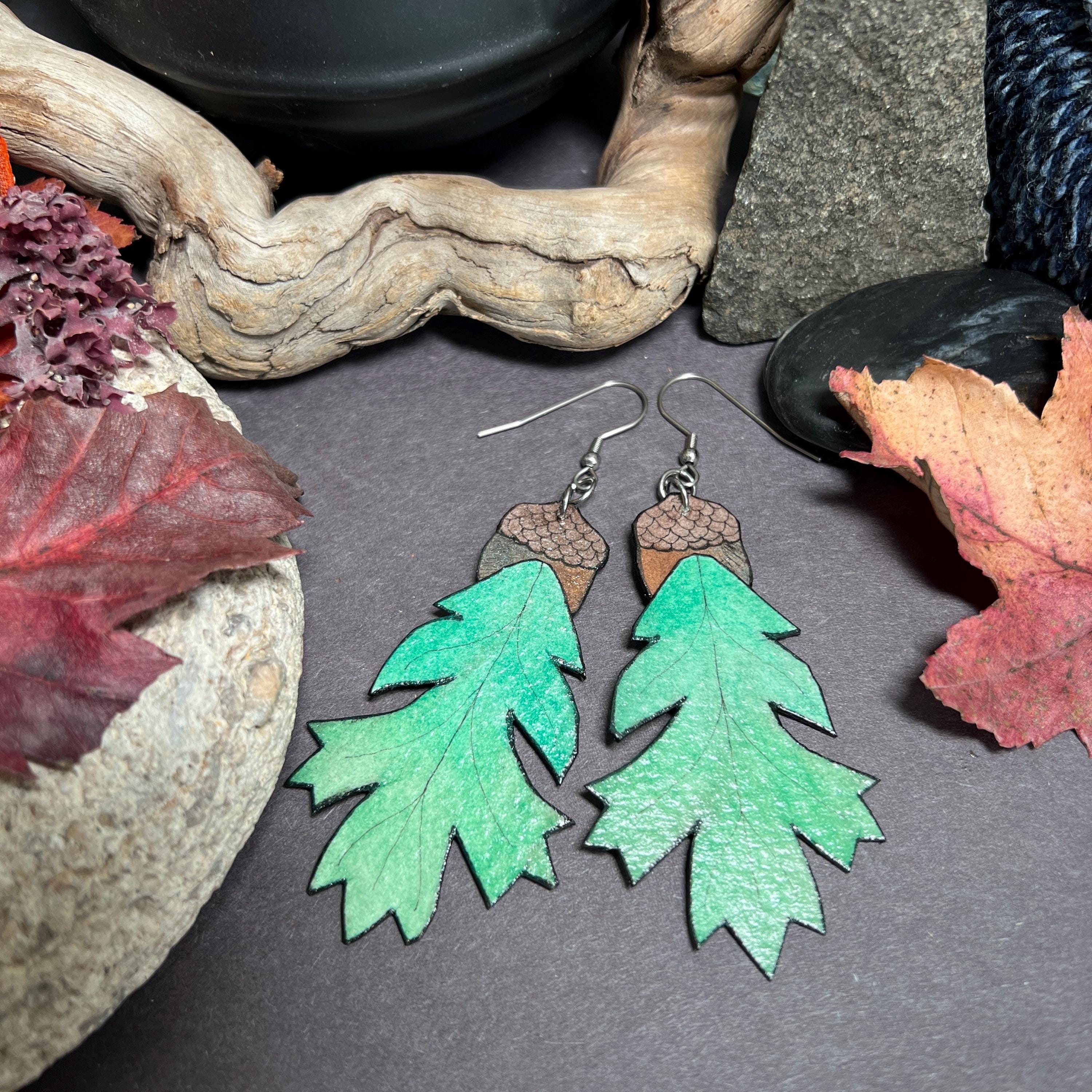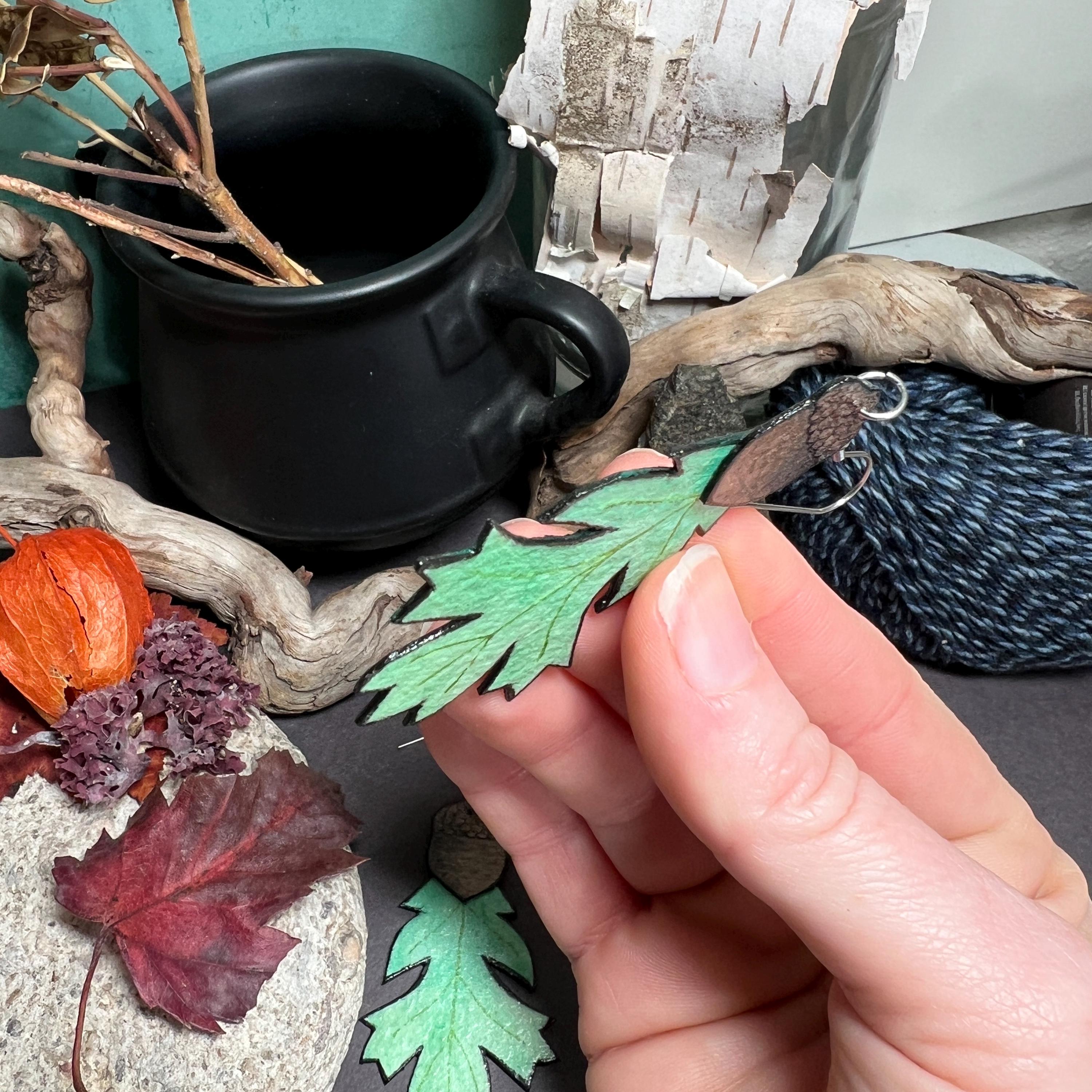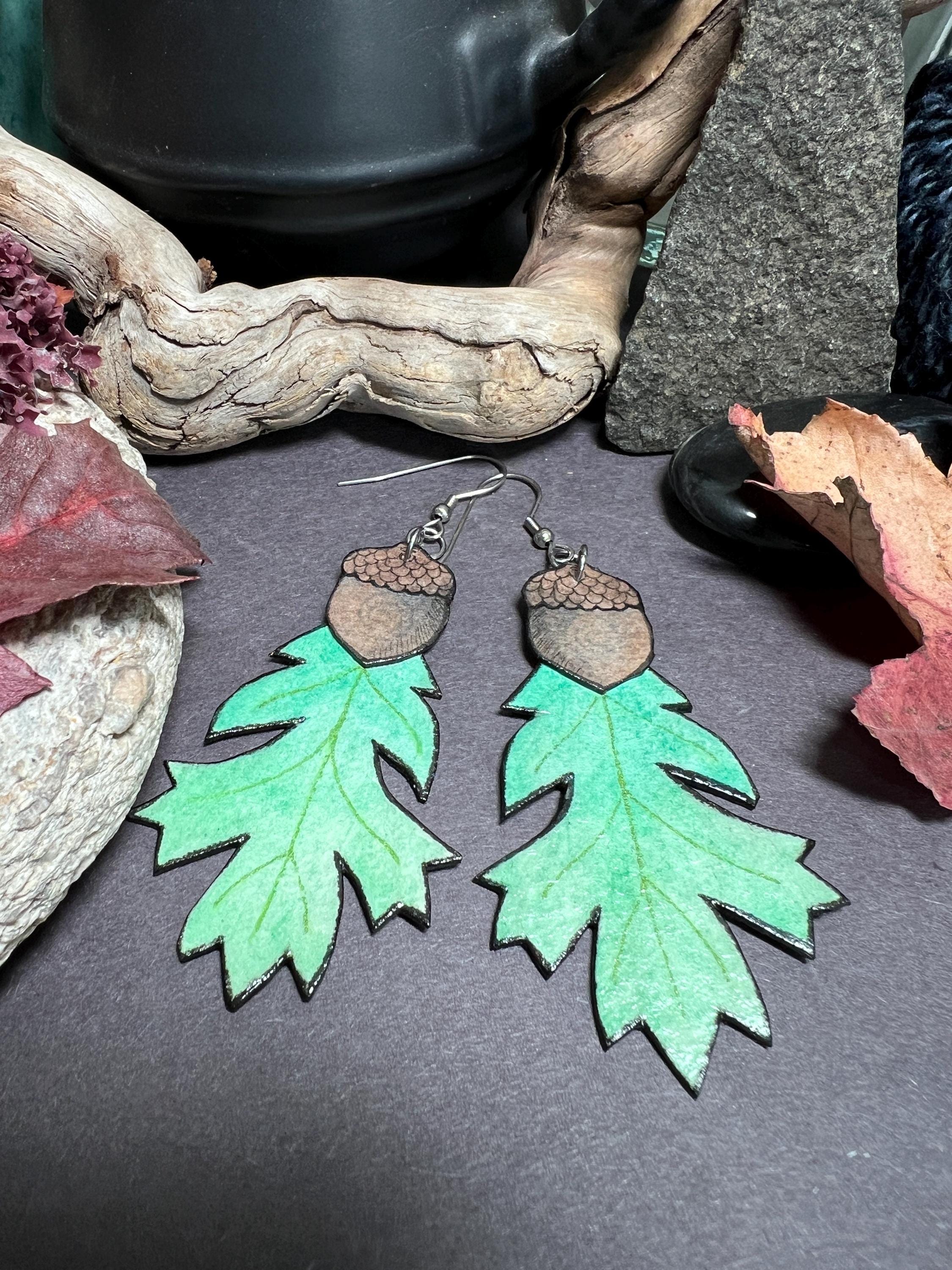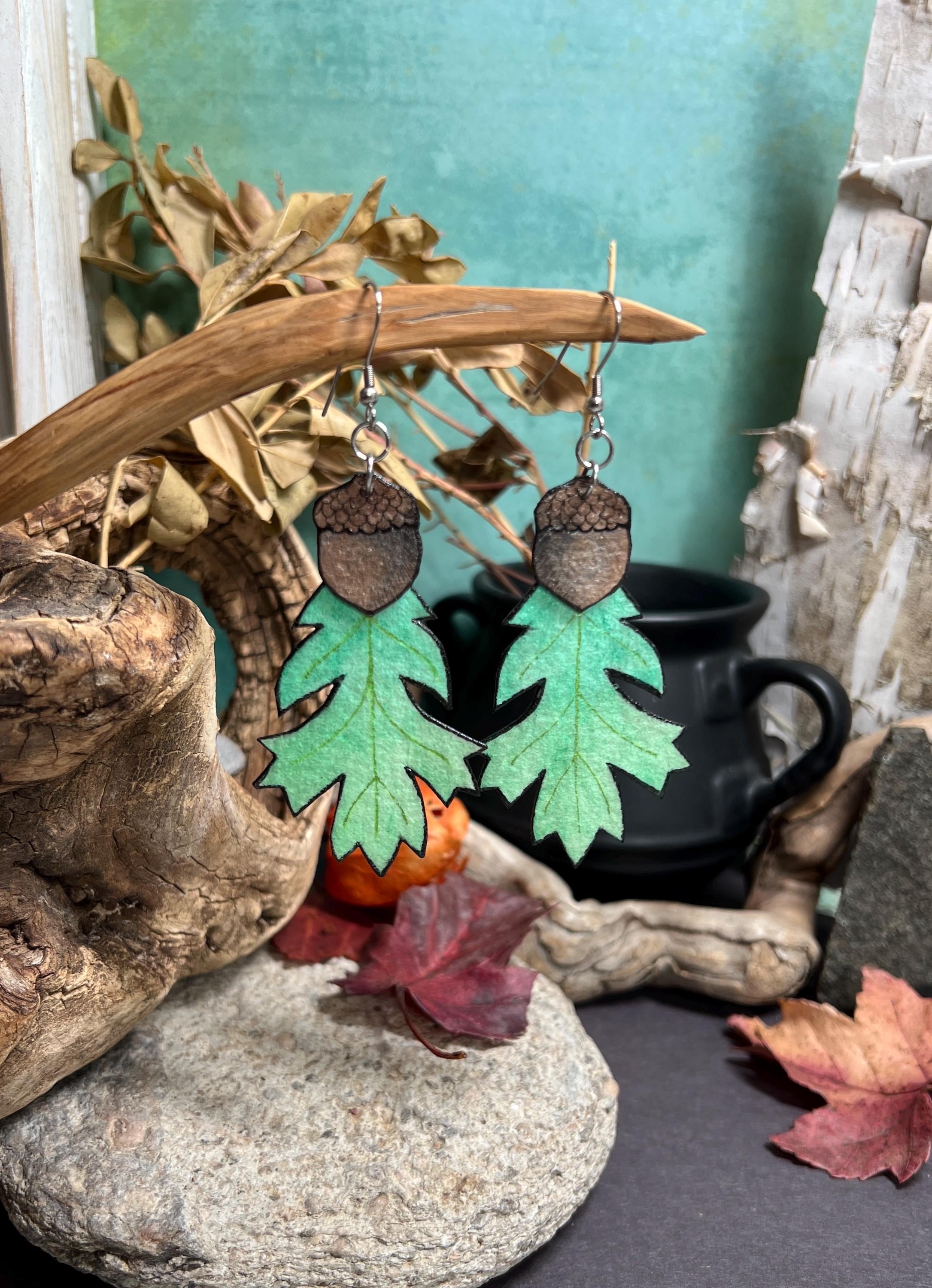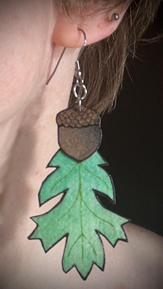 These Acorn and Oak Leaf Earrings are original Ink & Watercolor paintings hand painted on 1mm thick Italian Pressed Cotton Watercolor Paper. I paint the front and the back in full detail using Archival Pigma Ink and Inktense Watercolors. After painting, I coat them in two layers of protective lacquer, making them UV-Resistant and Water Resistant. Once complete, they have almost no weight. All hardware is hypoallergenic Stainless Steel of Gold-Finished Stainless Steel.