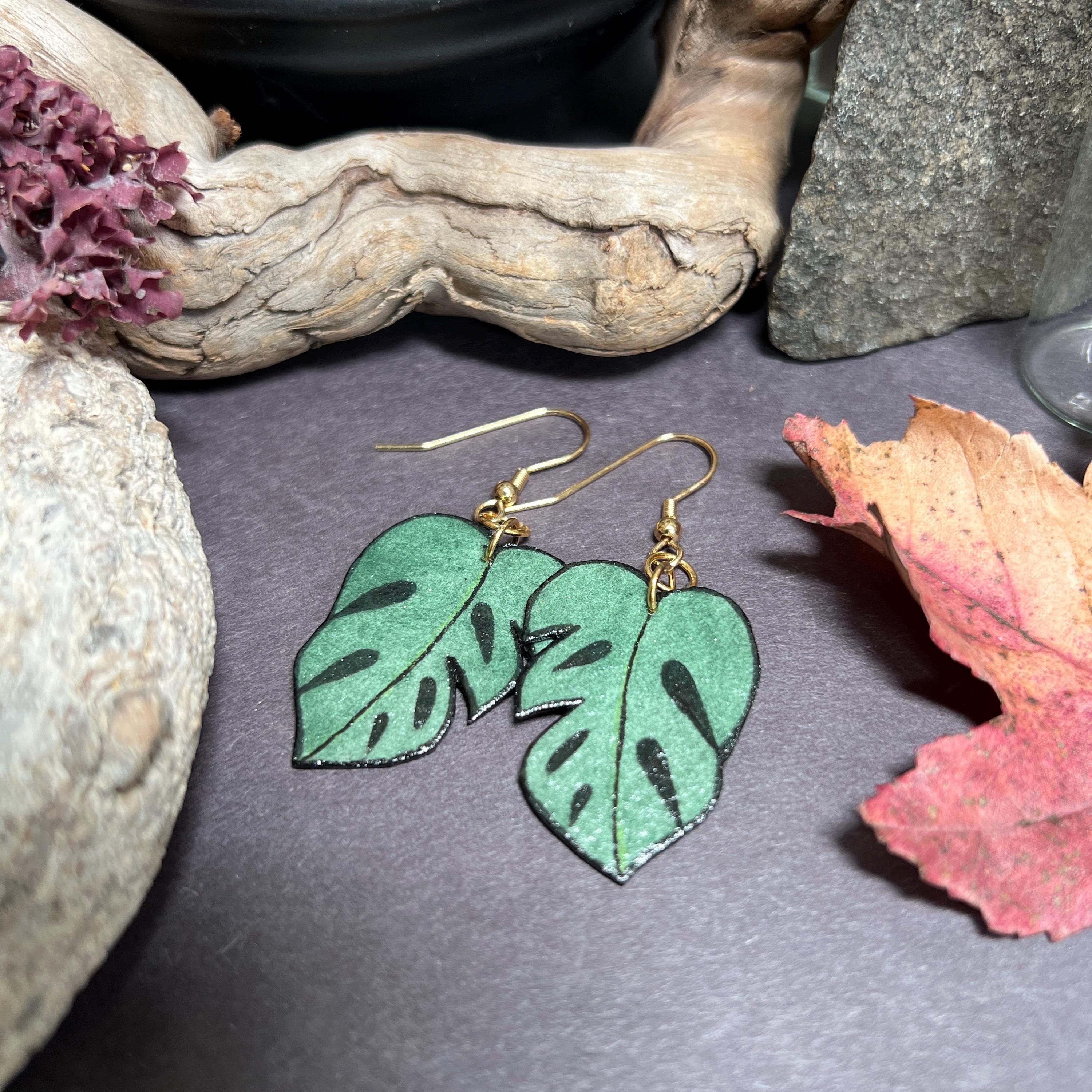 These Monstera Leaf or "Swiss Cheese Plant" earrings are original Ink & Watercolor paintings hand painted on 1mm thick Italian Pressed Cotton Watercolor Paper. I paint the front and the back in full detail using Archival Pigma Ink and Inktense Watercolors. After painting, I coat them in two layers of protective lacquer, making them UV-Resistant and Water Resistant. Once complete, they have almost no weight. All hardware is hypoallergenic Stainless Steel of Gold-Finished Stainless Steel.