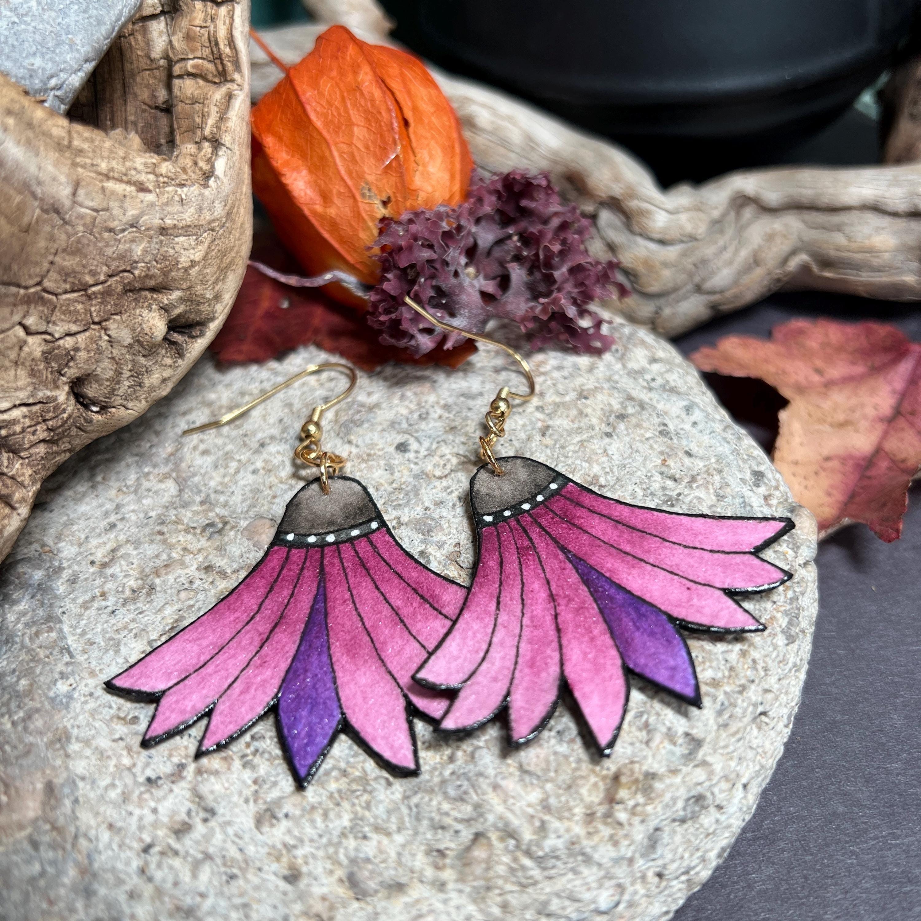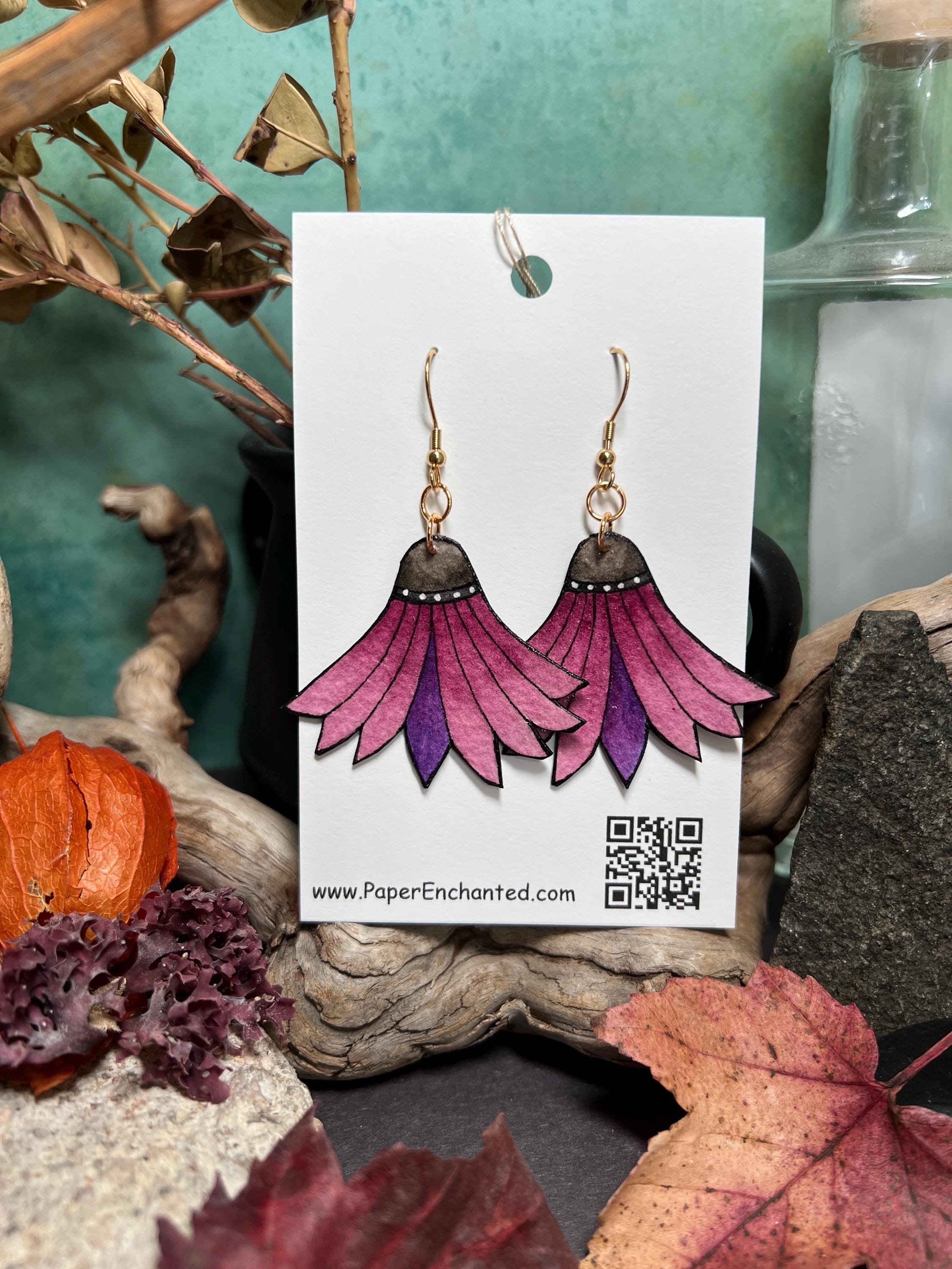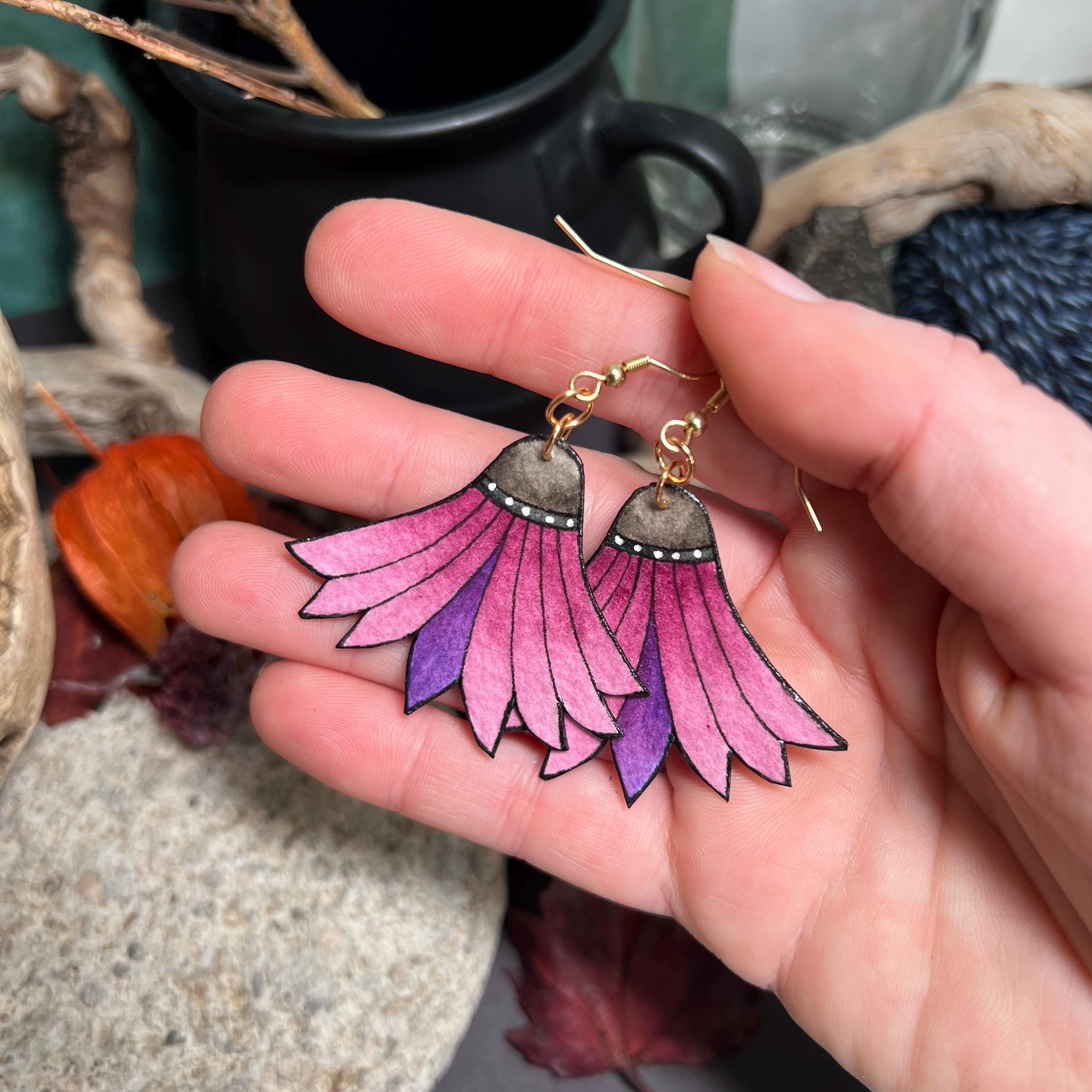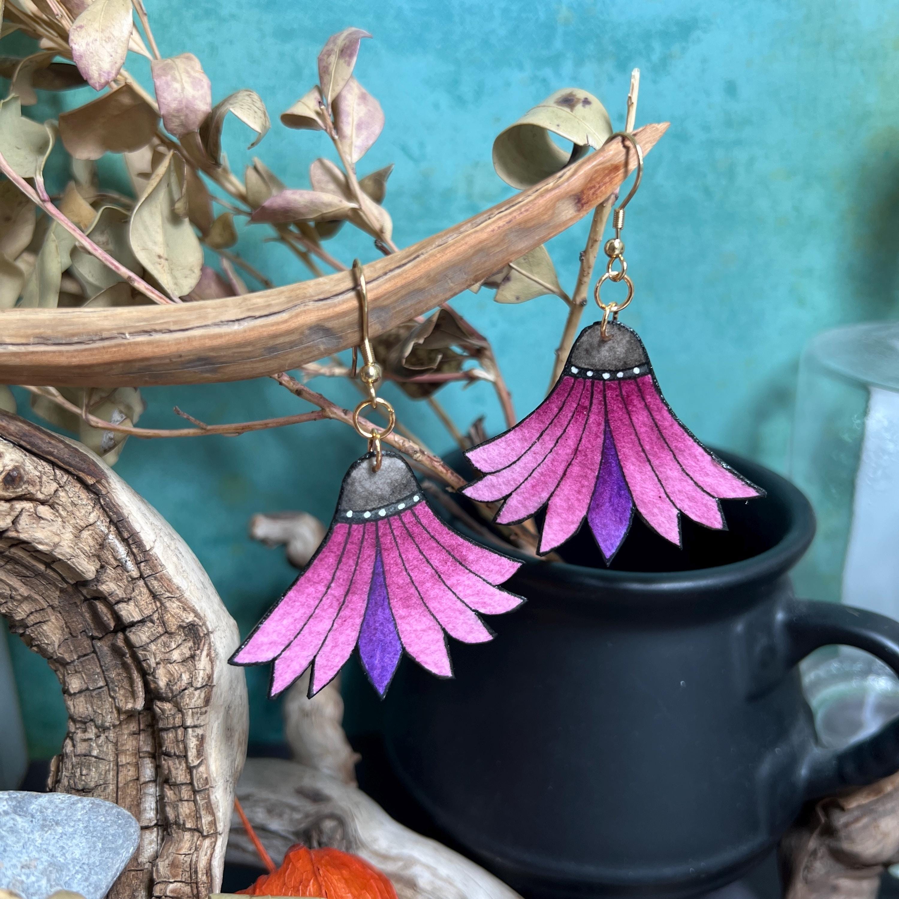 Purple Echinacea Earrings: Art Nouveau Style, Hand Painted, Lightweight