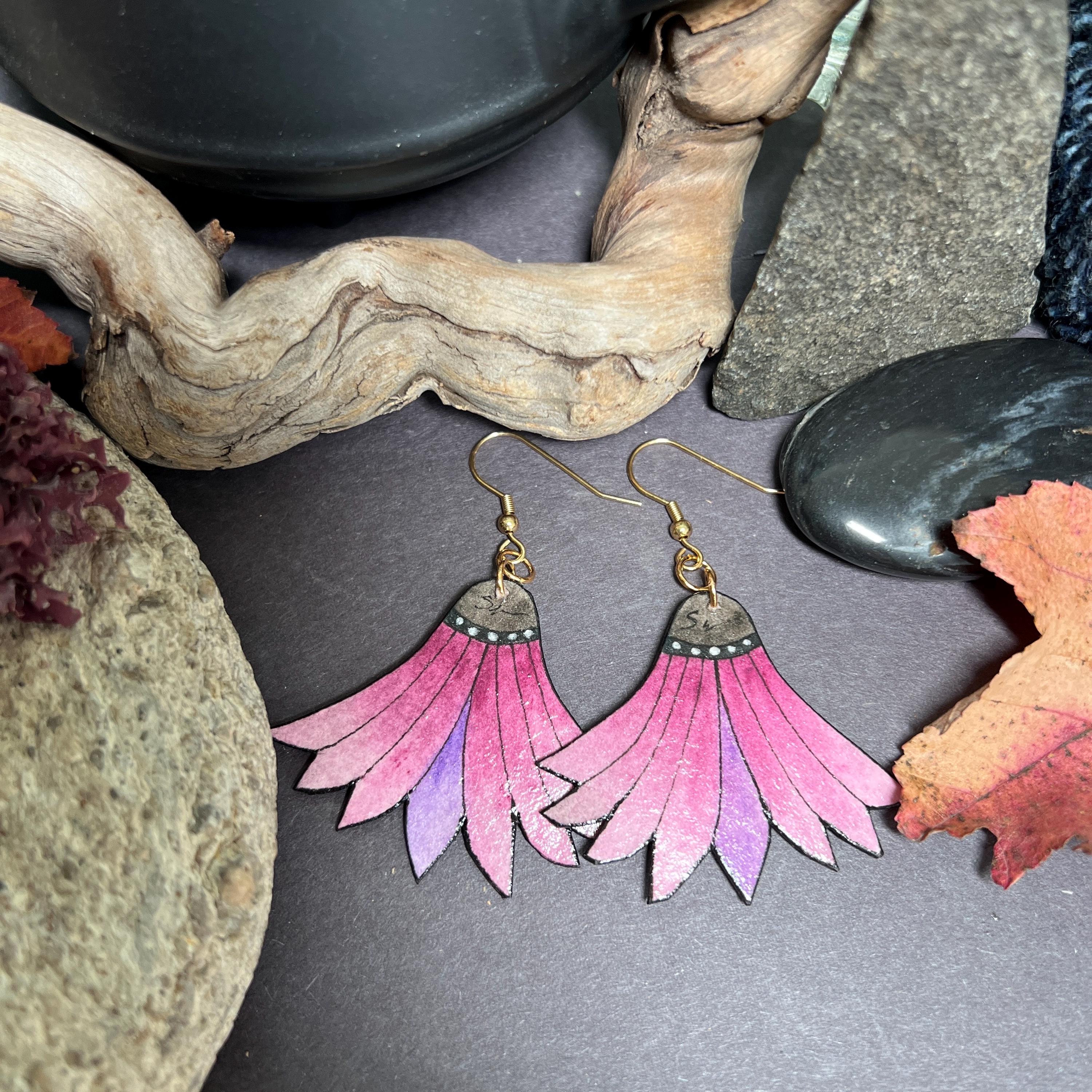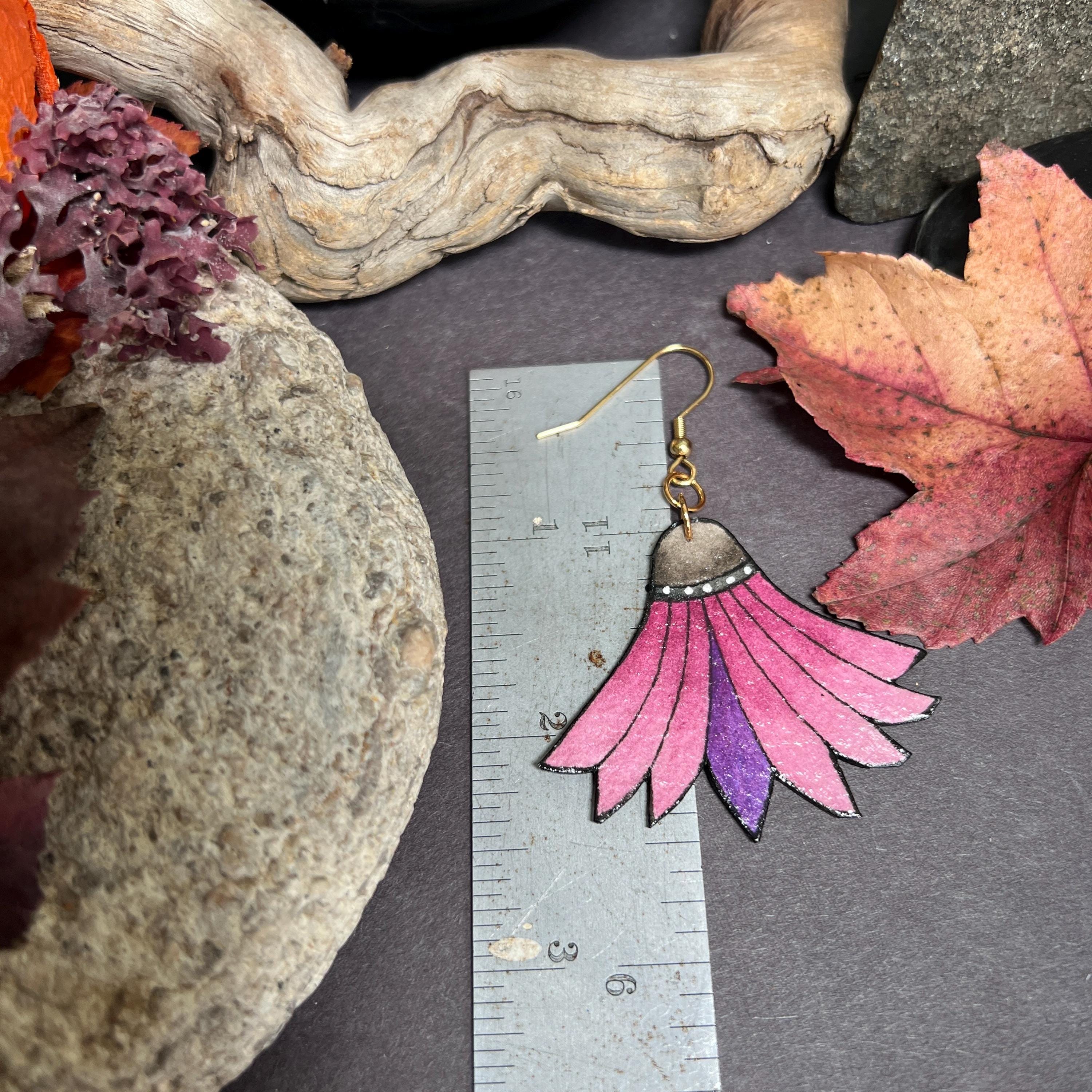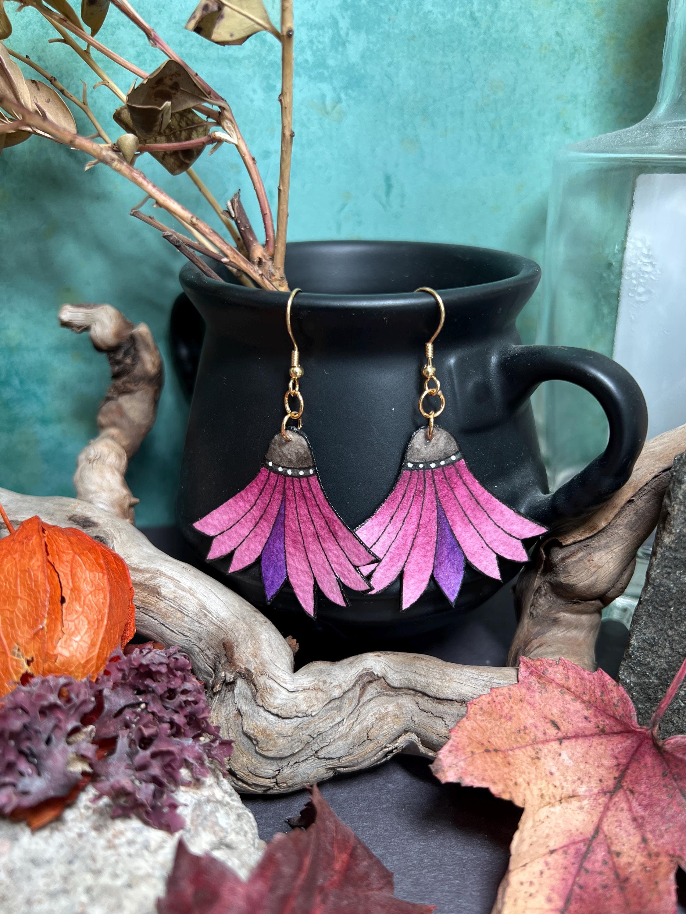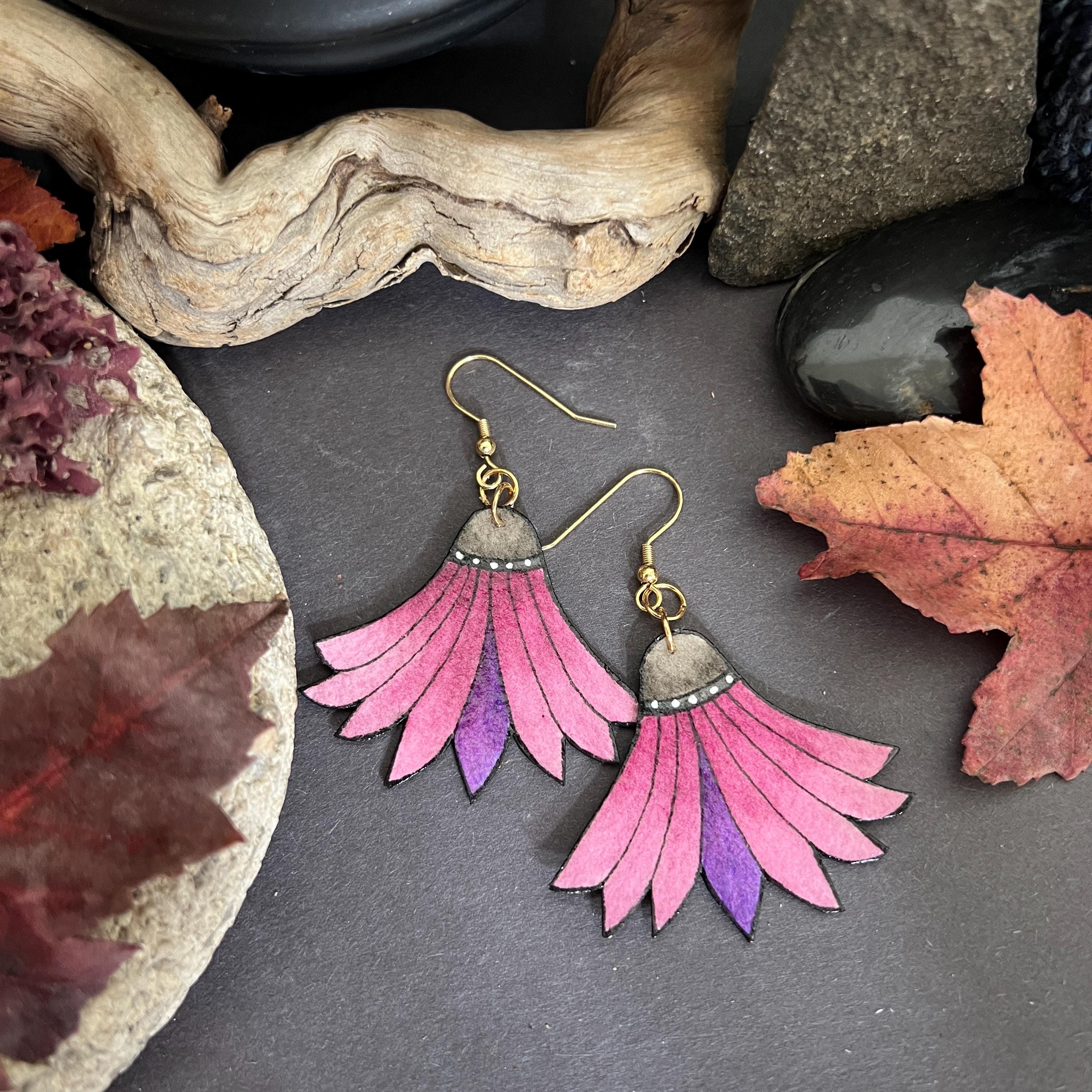 Purple Echinacea Earrings: Art Nouveau Style, Hand Painted, Lightweight