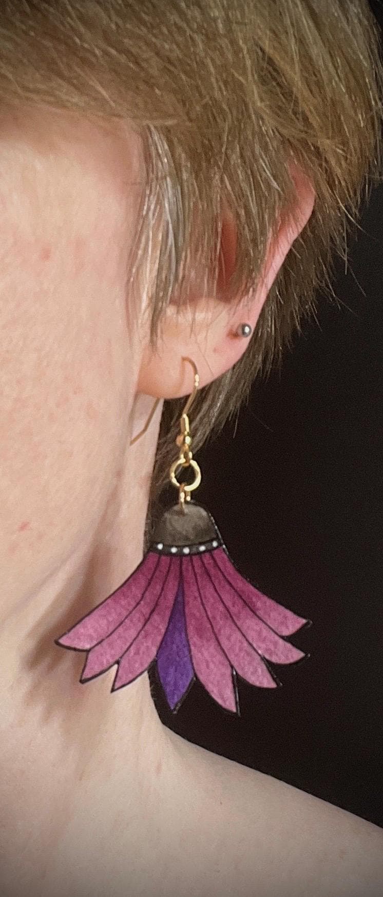 Inspired by the wild echinacea plants around New England, these earrings are original Ink & Watercolor paintings hand painted on 1mm thick Italian Pressed Cotton Watercolor Paper. I paint the front and the back in full detail using Archival Pigma Ink and Inktense Watercolors. After painting, I coat them in two layers of protective lacquer, making them UV-Resistant and Water Resistant. Once complete, they have almost no weight. All hardware is hypoallergenic Stainless Steel.