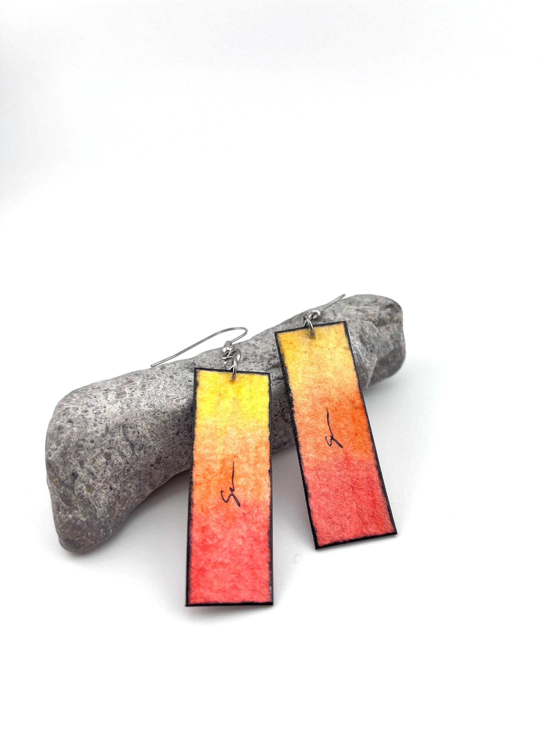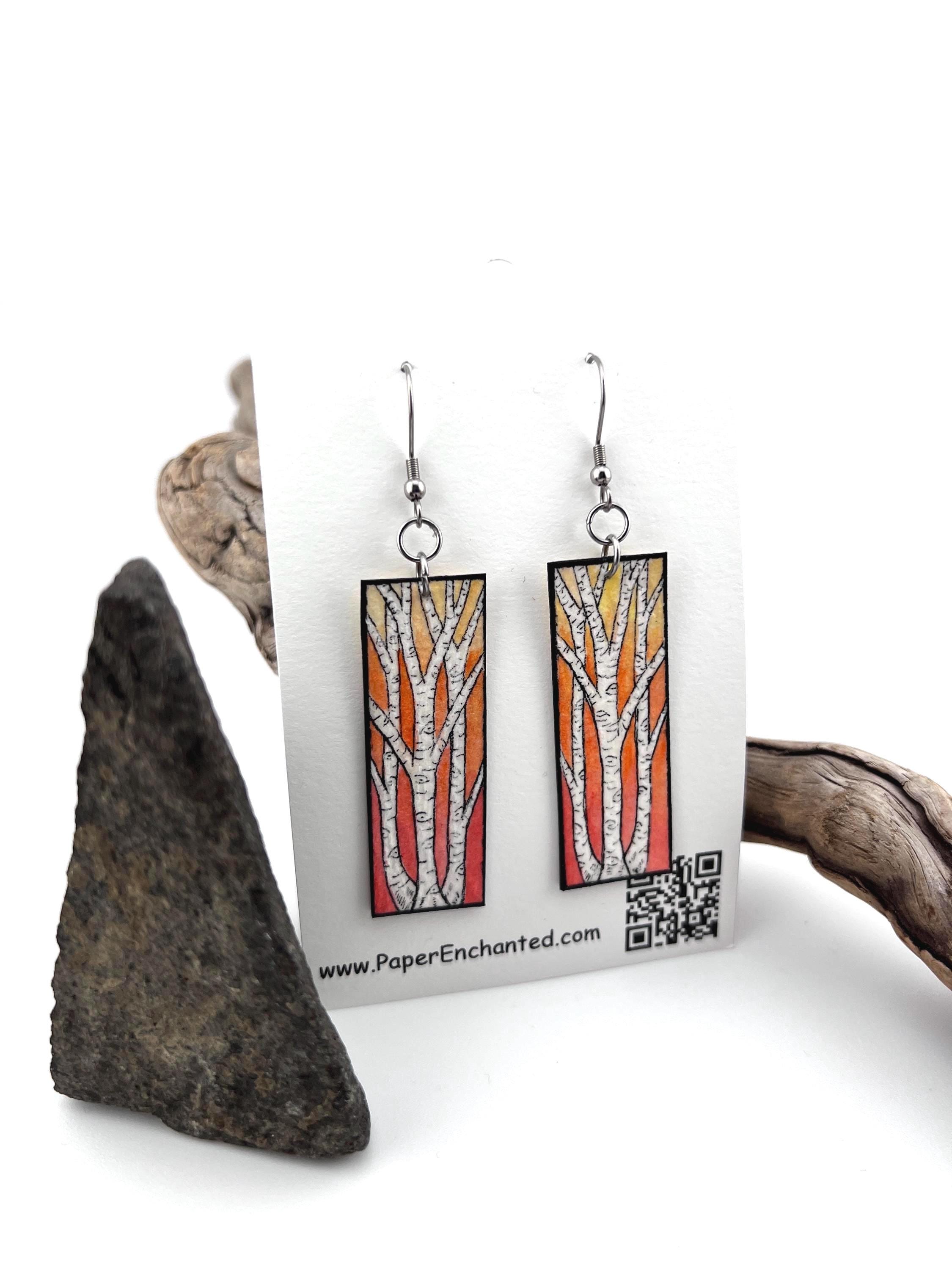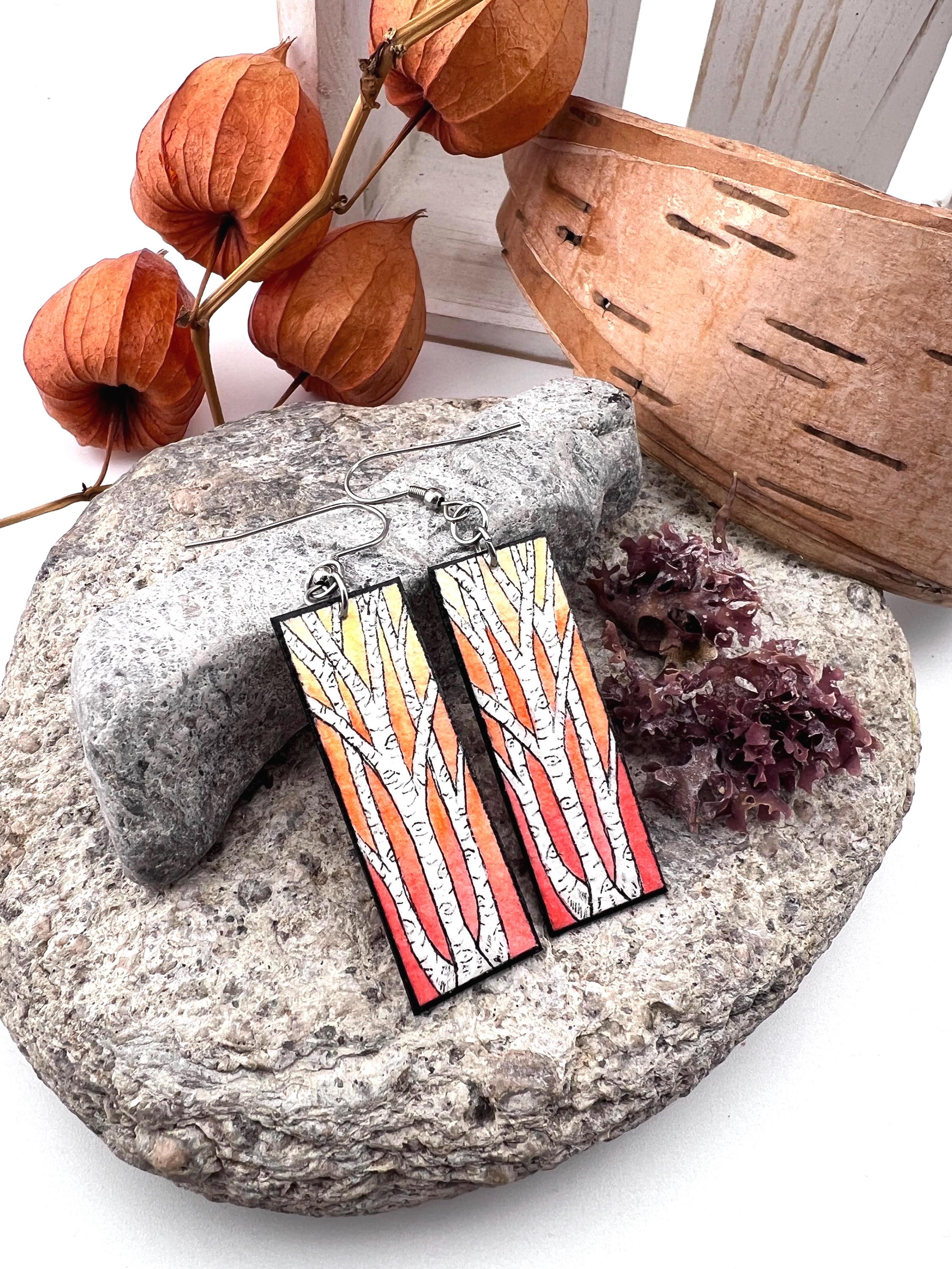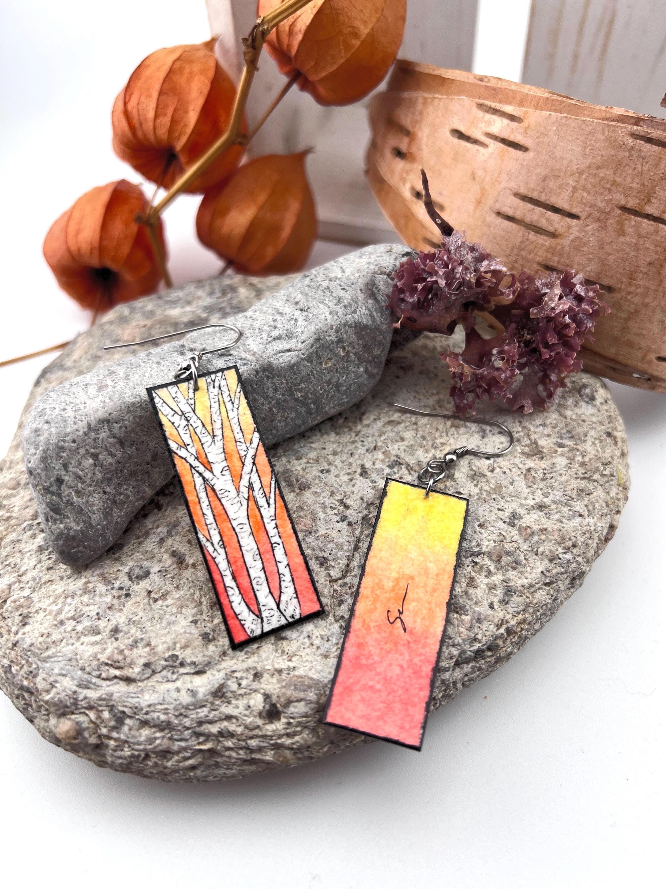 New Design! These Autumn Birch Tree Earrings are original Ink & Watercolor paintings hand painted on 1mm thick Italian Pressed Cotton Watercolor Paper. I paint the front and the back in full detail using Archival Pigma Ink and Inktense Watercolors. After painting, I coat them in two layers of protective lacquer, making them UV-Resistant and Water Resistant. Once complete, they have almost no weight. All hardware is hypoallergenic Stainless Steel of Gold-Finished Stainless Steel.