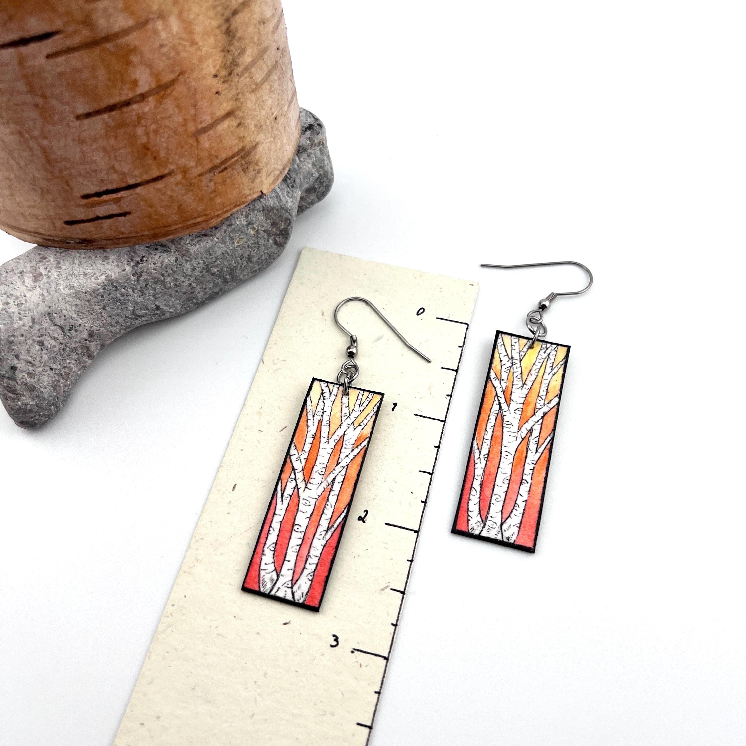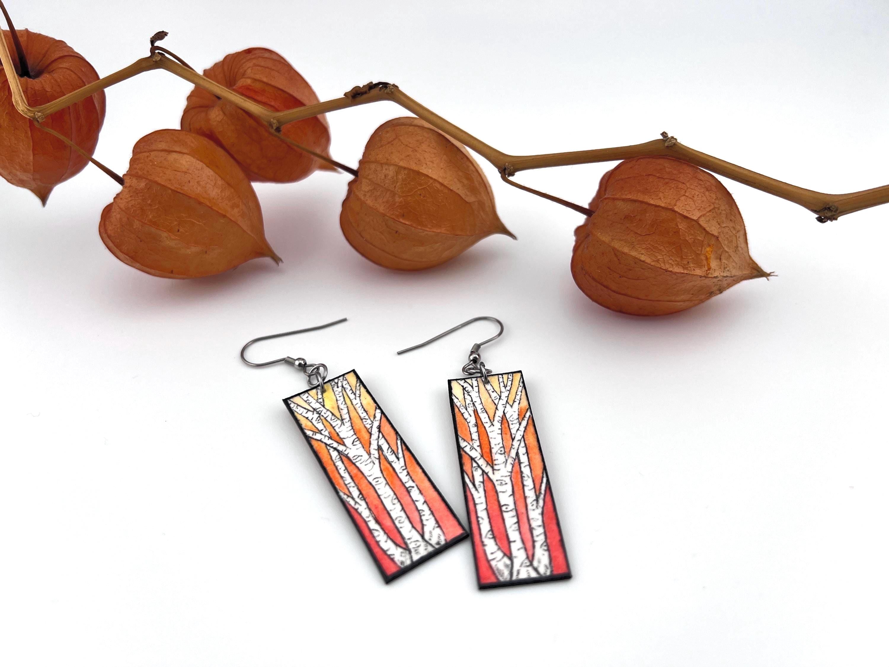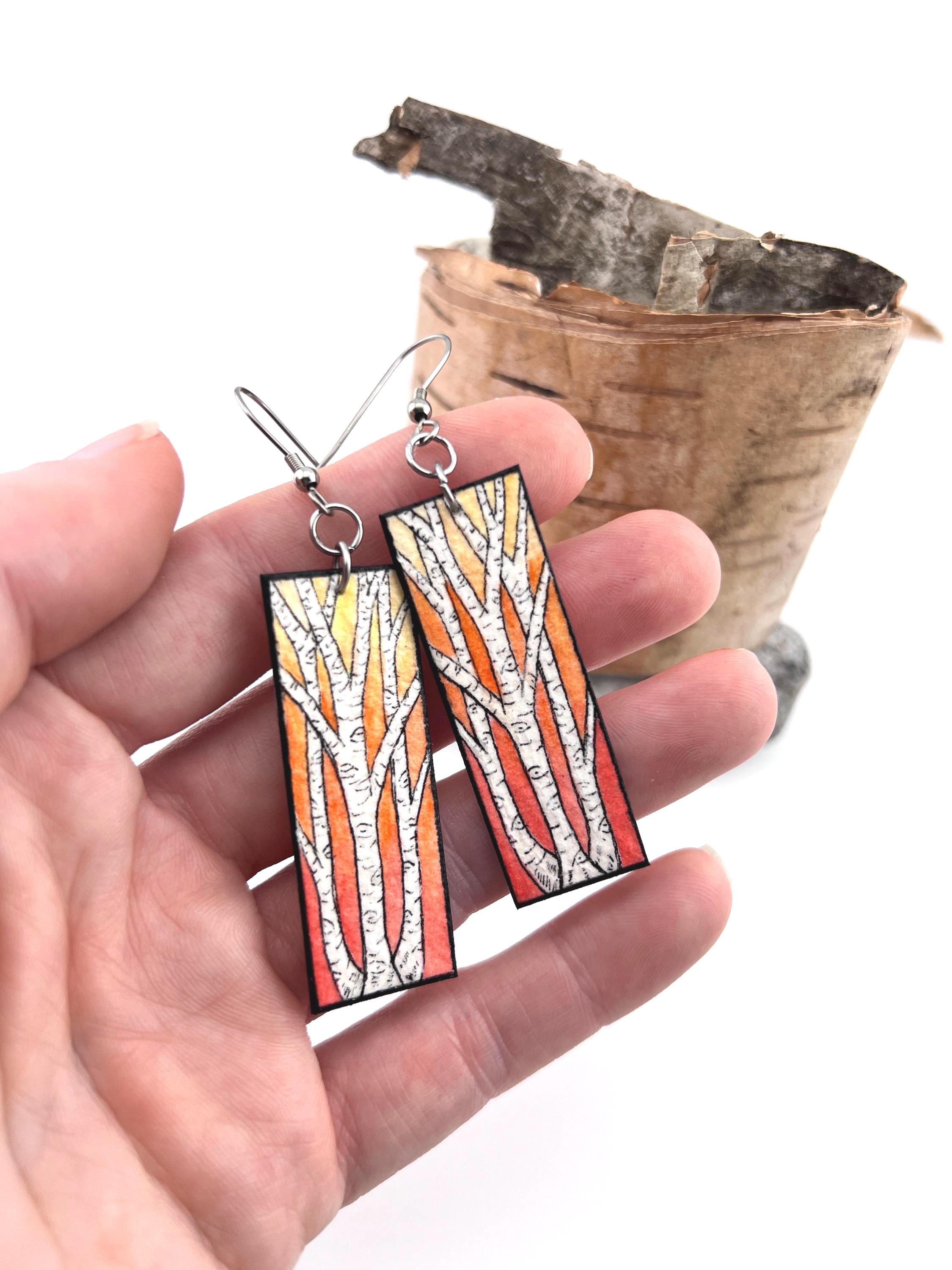 Autum Birch Tree Earrings, Wearable Fine Art Painting, Lightweight