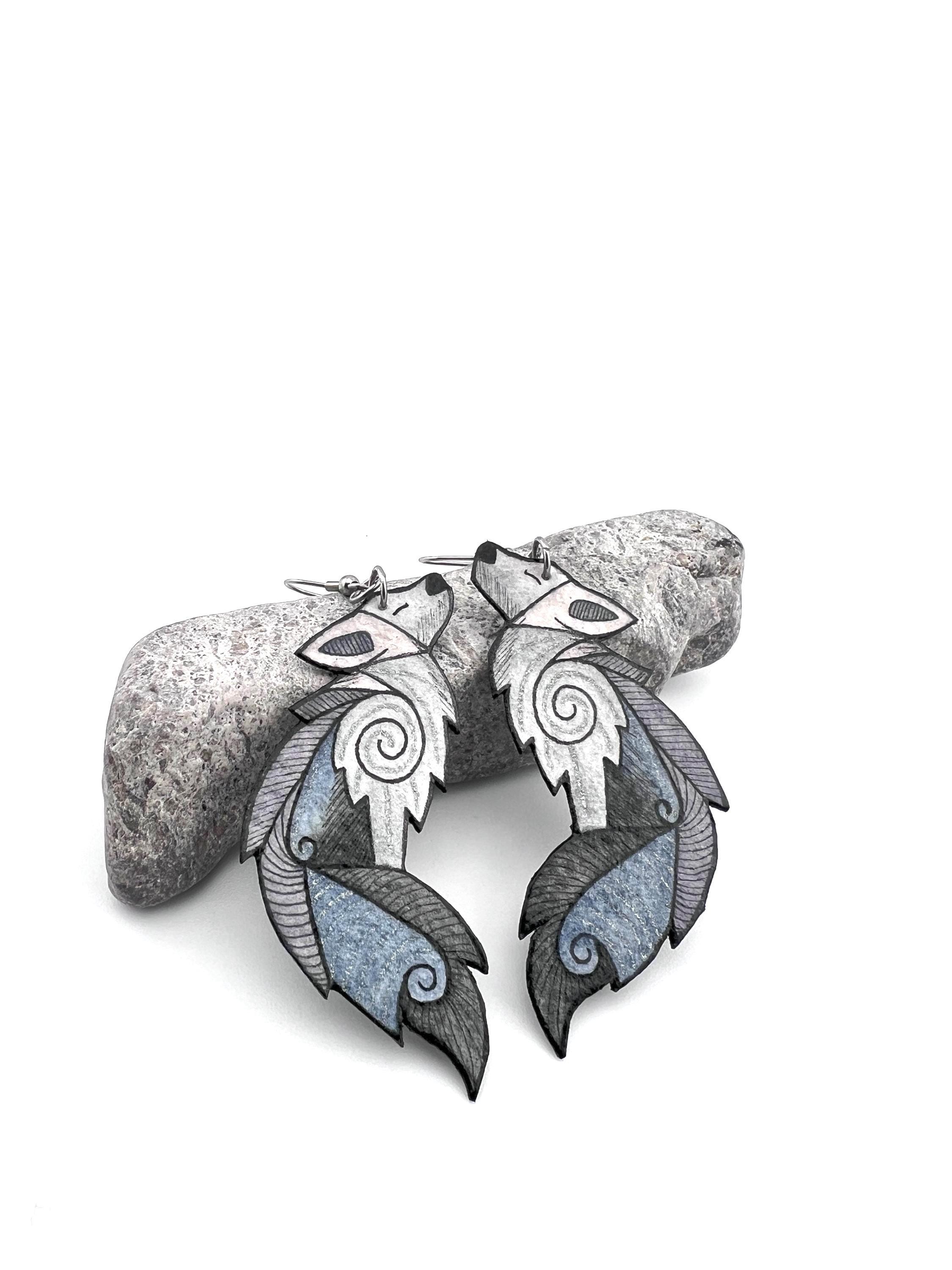 These Howling Gray Wolf Earrings are original Ink & Watercolor paintings hand painted on 1mm thick Italian Pressed Cotton Watercolor Paper. I paint the front and the back in full detail using Archival Pigma Ink and Inktense Watercolors. After painting, I coat them in two layers of protective lacquer, making them UV-Resistant and Water Resistant. Once complete, they have almost no weight. All hardware is hypoallergenic Stainless Steel.
