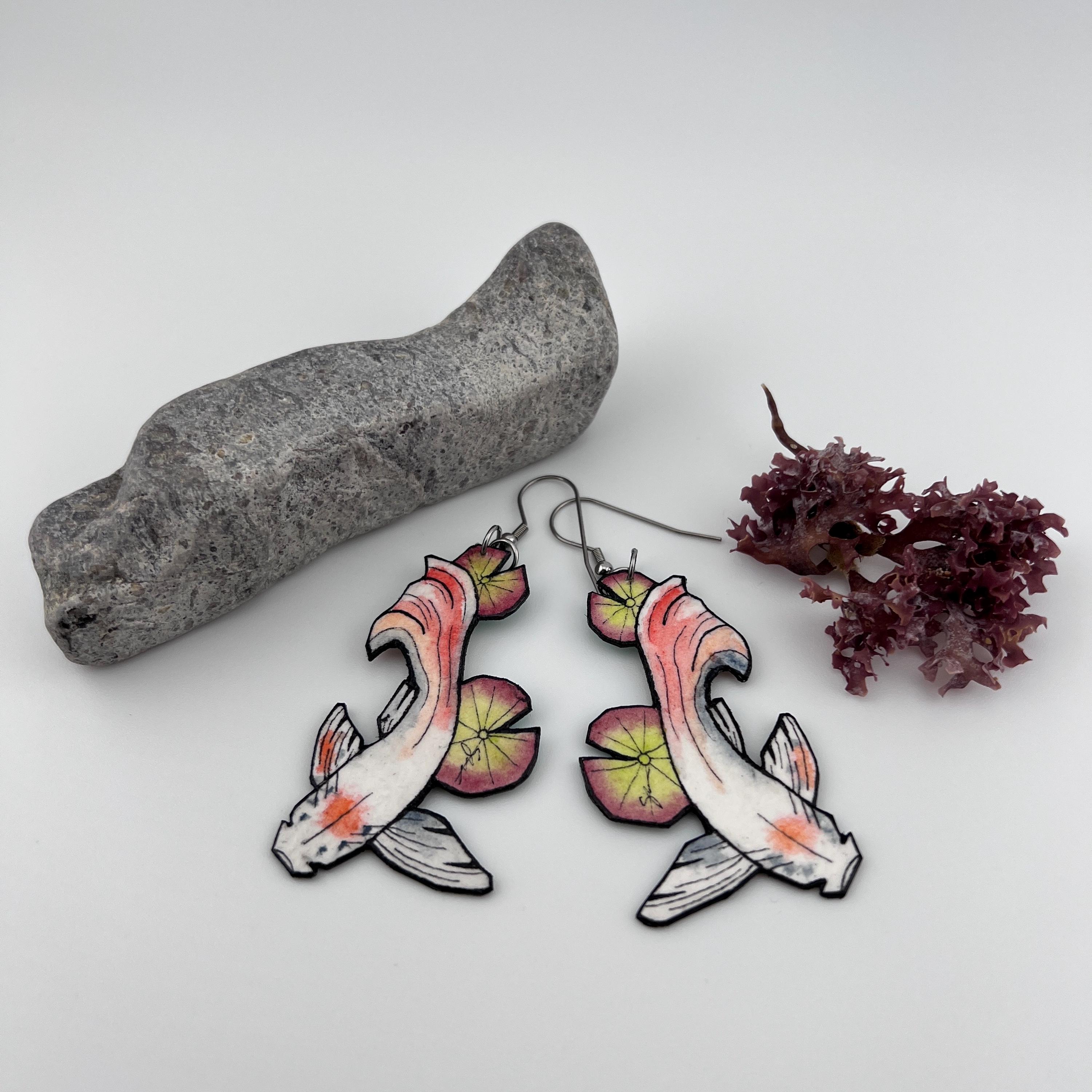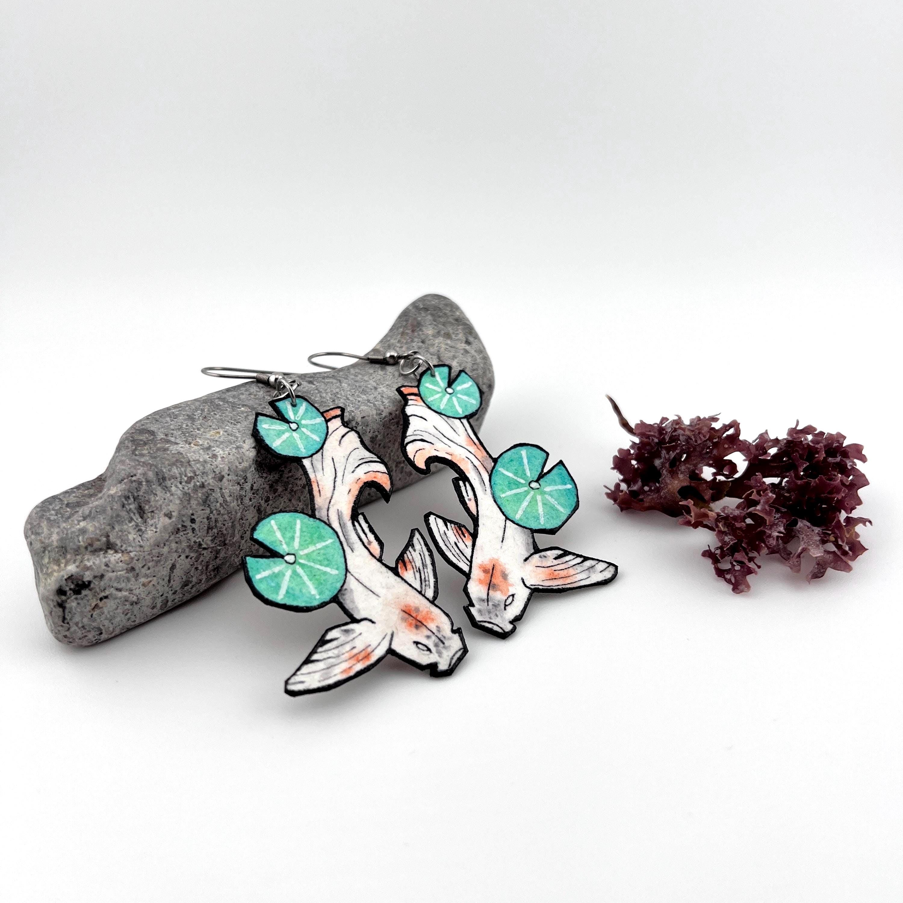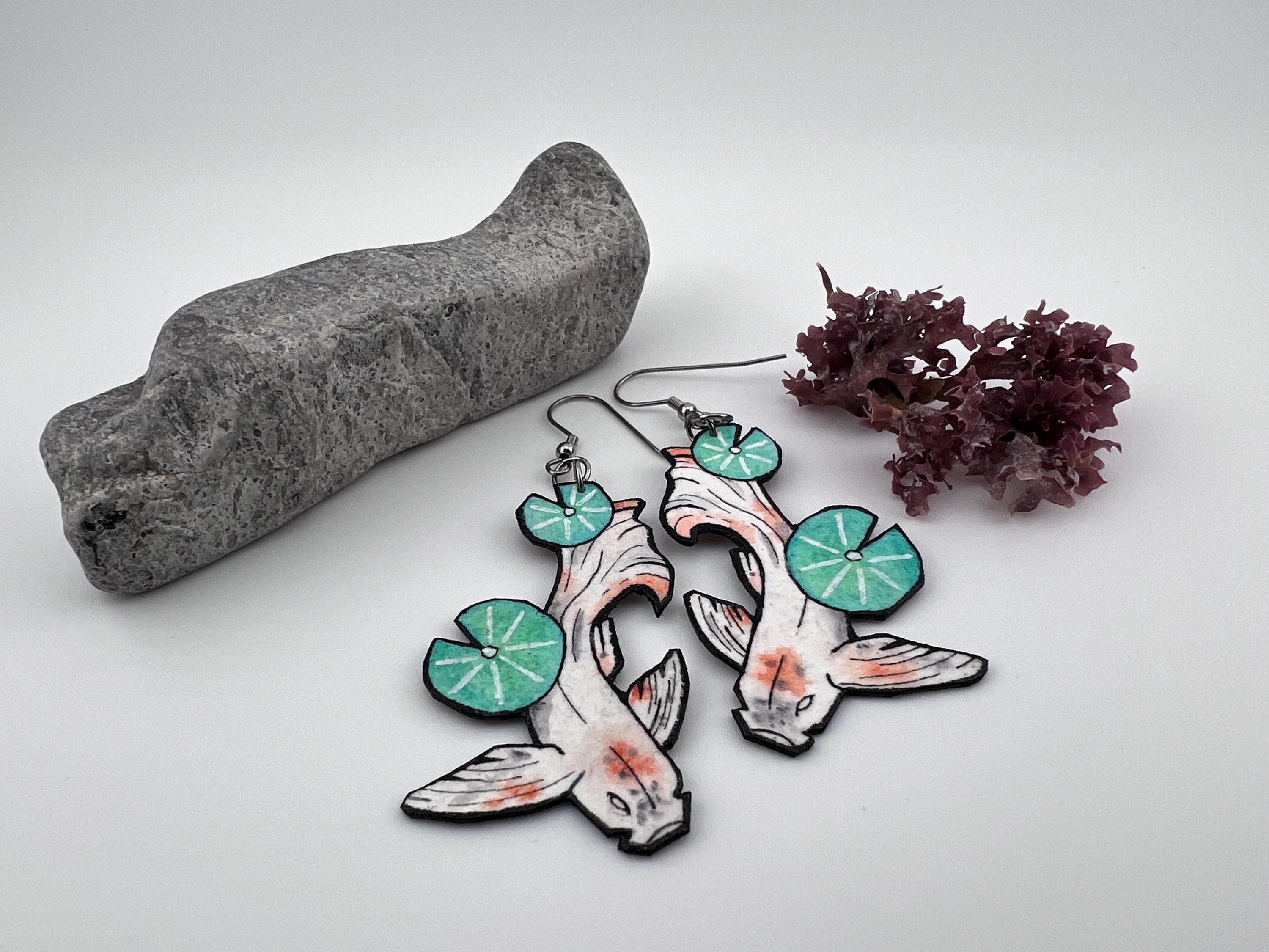 Koi Pond Goldfish Earrings, Wearable Fine Art Painting, Lily Pad Jewelry