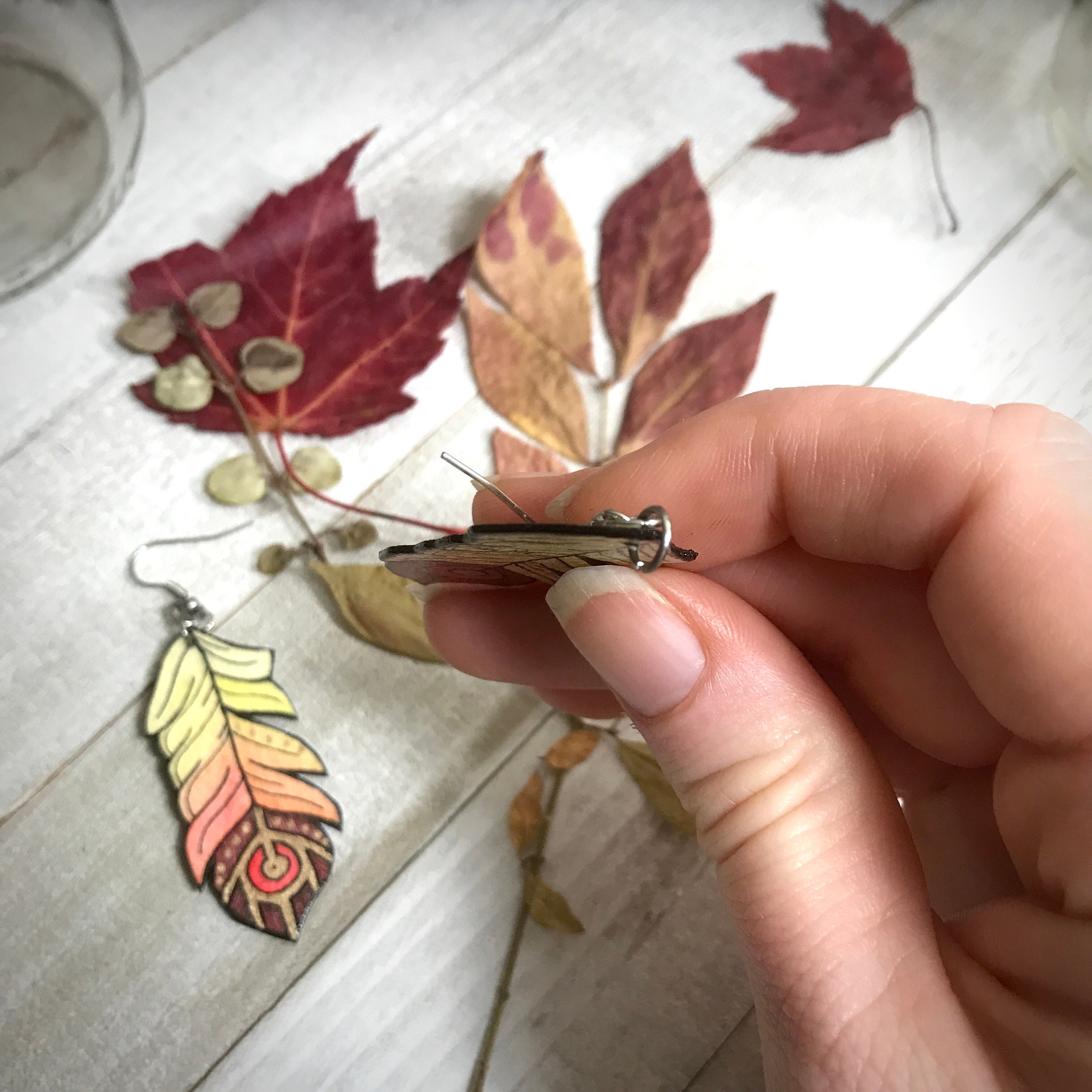These Orange Phoenix Feather Earrings are original Ink & Watercolor paintings hand painted on 1mm thick Italian Pressed Cotton Watercolor Paper. I paint the front and the back in full detail using Archival Pigma Ink and Inktense Watercolors. After painting, I coat them in two layers of protective lacquer, making them UV-Resistant and Water Resistant. Once complete, they have almost no weight. All hardware is hypoallergenic Stainless Steel of Gold-Finished Stainless Steel.
