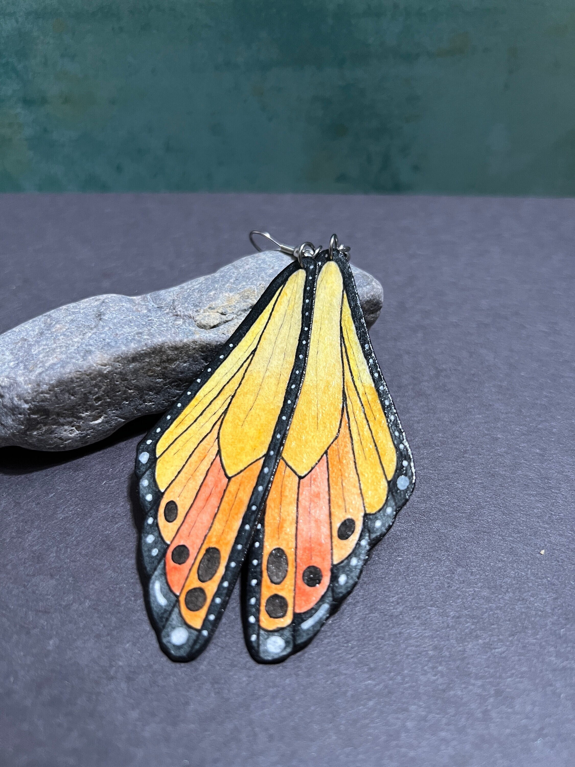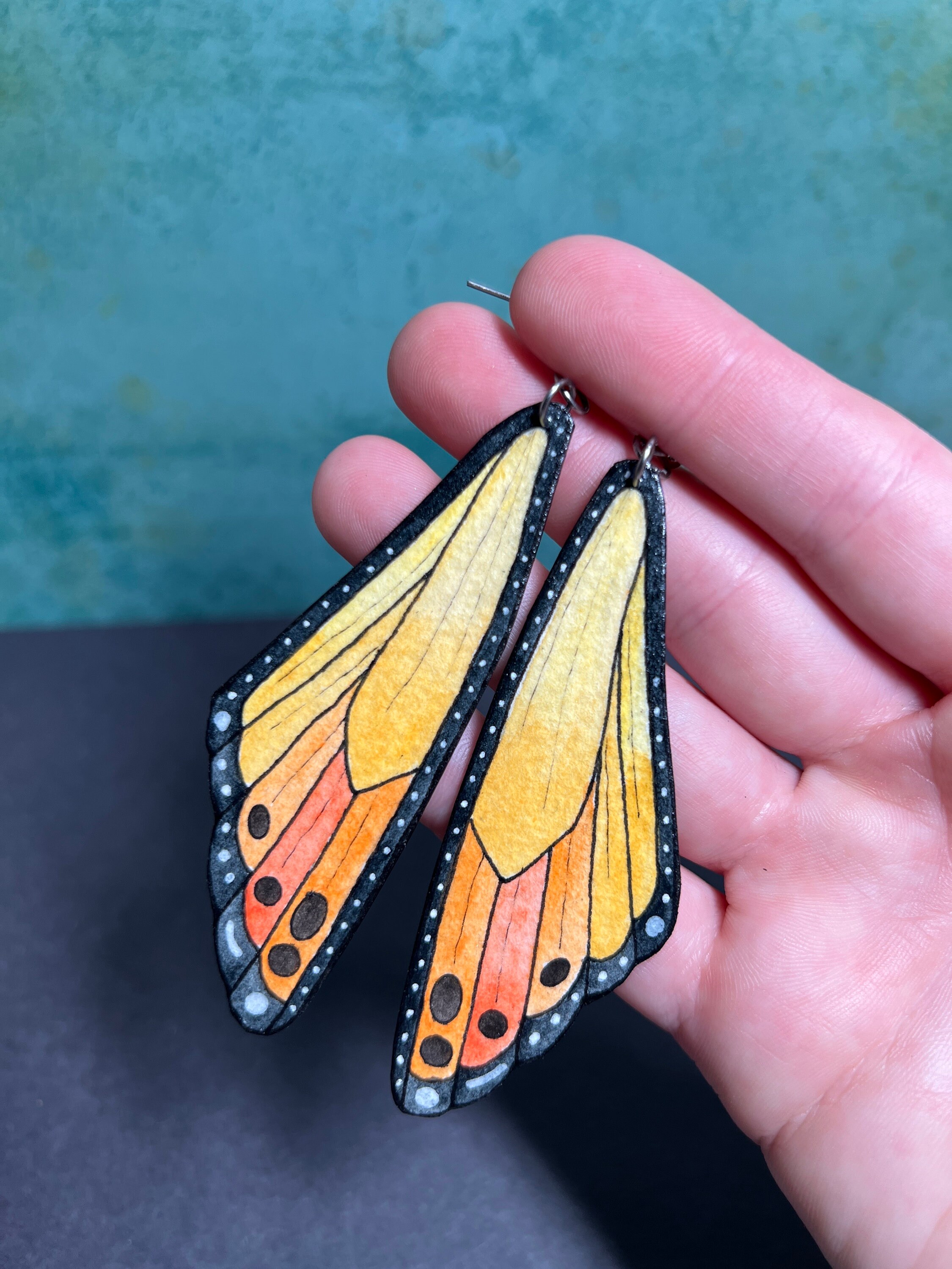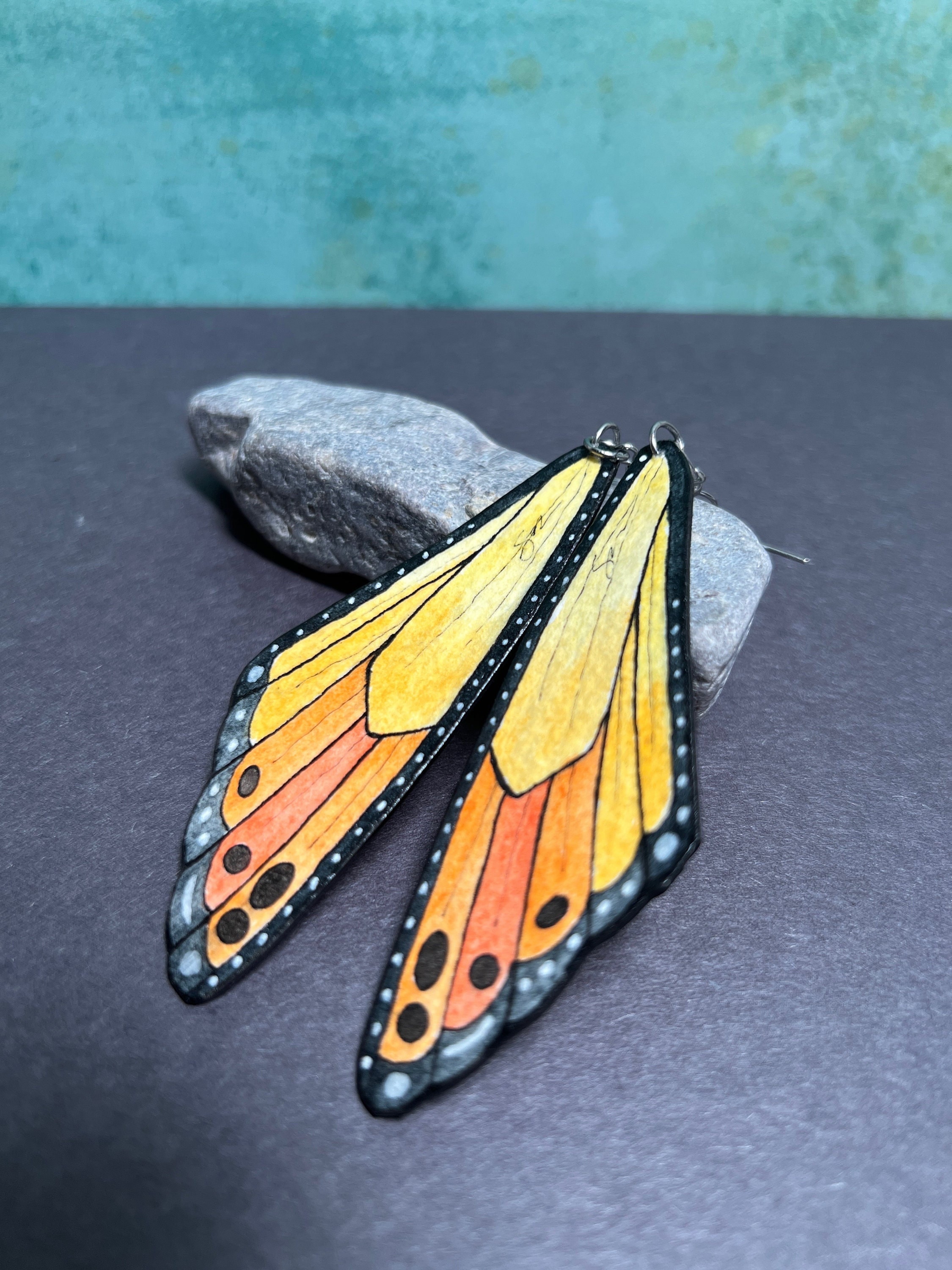 X-Large Monarch Butterly Wing Earrings, Wearable Fine Art Painting, Boho Butterfly Gift, Super Lightweight